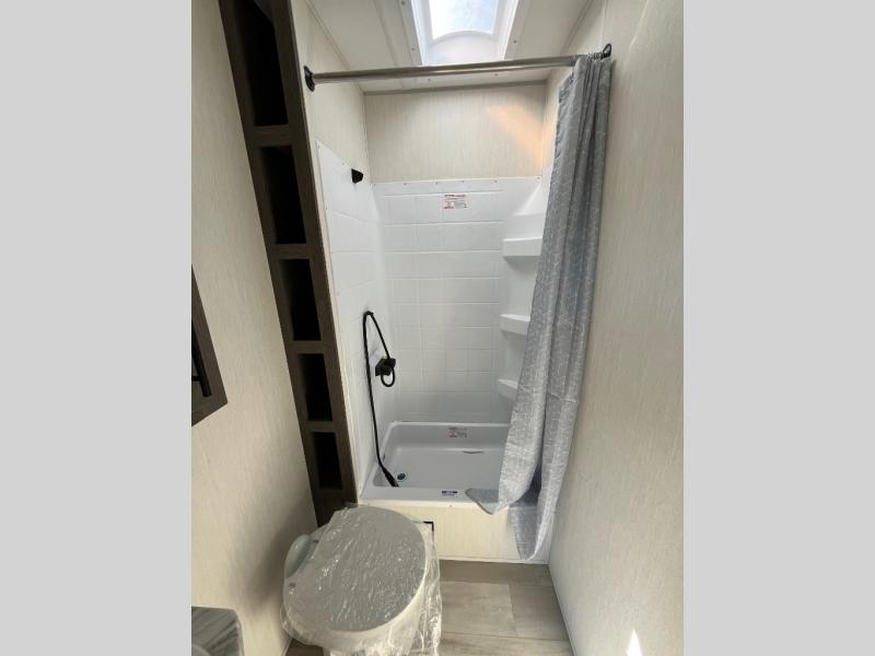 You'll love every minute spent in this spacious toy hauler! Since there is 14' of total garage space, you can plan to bring along kayaks, bikes, and hiking gear galore. This model includes a flip-up counter with stools, glass patio doors, and full kitchen amenities so you can whip up your best meals each day. The full bath will let you freshen up at night, and the king bed in the front bedroom is sure to bring comfort!