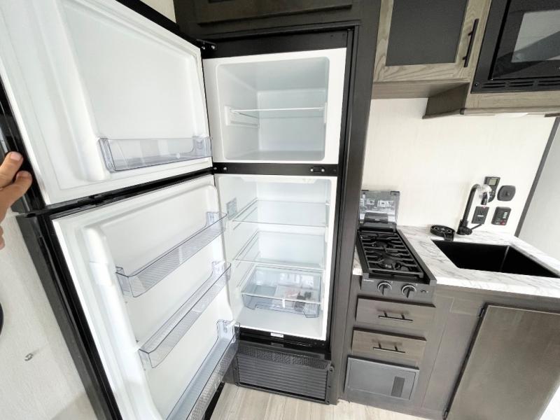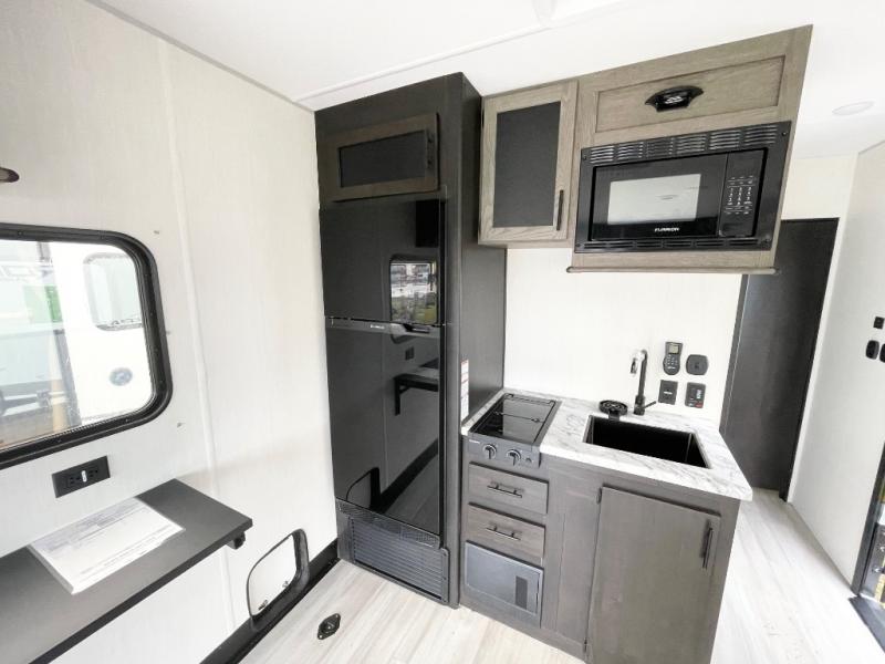 You'll love every minute spent in this spacious toy hauler! Since there is 14' of total garage space, you can plan to bring along kayaks, bikes, and hiking gear galore. This model includes a flip-up counter with stools, glass patio doors, and full kitchen amenities so you can whip up your best meals each day. The full bath will let you freshen up at night, and the king bed in the front bedroom is sure to bring comfort!