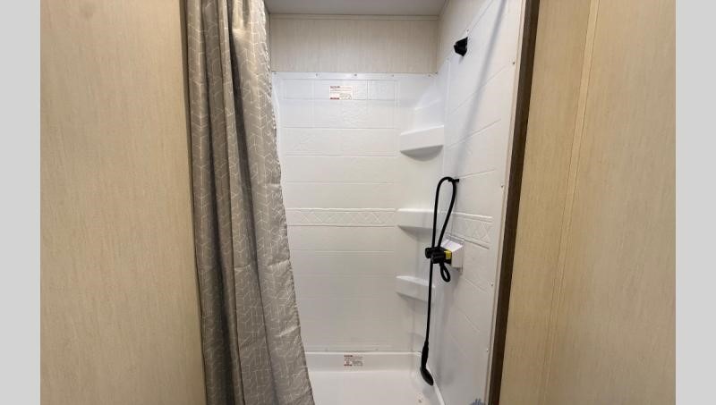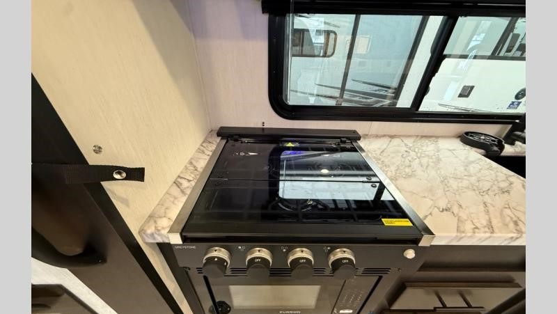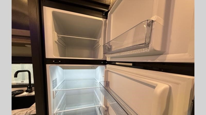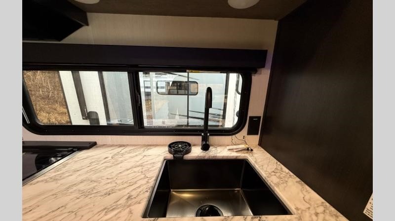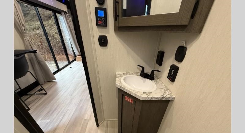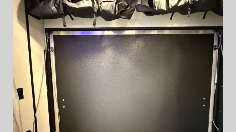 This toy hauler features 22' of total cargo space when you utilize the floor all the way up to the king bed. There is a flip-up counter with stools which will allow you to easily pack in gear when it's time to go home, and the ramp door makes for easy unloading. You can whip up meals each day with the full kitchen amenities, and the mid-coach full bath will let you freshen up after trail riding. This unit features ample storage space, including dual bedroom wardrobes, a large hidden pantry behind the entertainment center, plus pass-through storage outside for fishing poles and more!