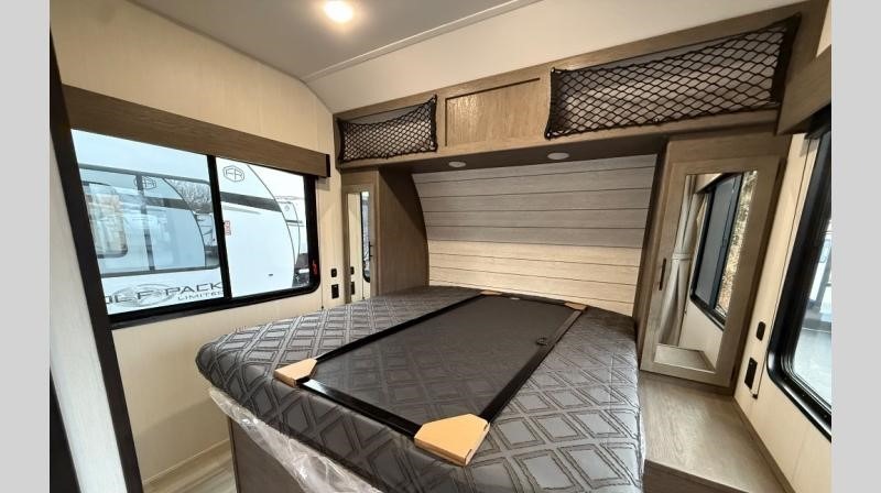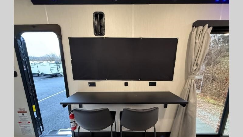 This toy hauler features 22' of total cargo space when you utilize the floor all the way up to the king bed. There is a flip-up counter with stools which will allow you to easily pack in gear when it's time to go home, and the ramp door makes for easy unloading. You can whip up meals each day with the full kitchen amenities, and the mid-coach full bath will let you freshen up after trail riding. This unit features ample storage space, including dual bedroom wardrobes, a large hidden pantry behind the entertainment center, plus pass-through storage outside for fishing poles and more!