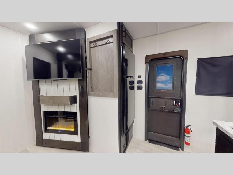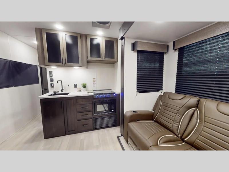 You can't go wrong in this spacious toy hauler with a 12' 6" garage! There is a flip-up counter with stools where you can eat each day, or you can take your plate outdoors to eat under the 21' power awning. The combined kitchen and living area includes a sofa slide out, appliances to make meals each day, and an entertainment center with a fireplace. There is also a pantry and drawers hidden behind the TV for smart storage spaces. The king bed is sure to provide a great night's rest, and there are dual nightstands and dual wardrobes to keep your things tidy.