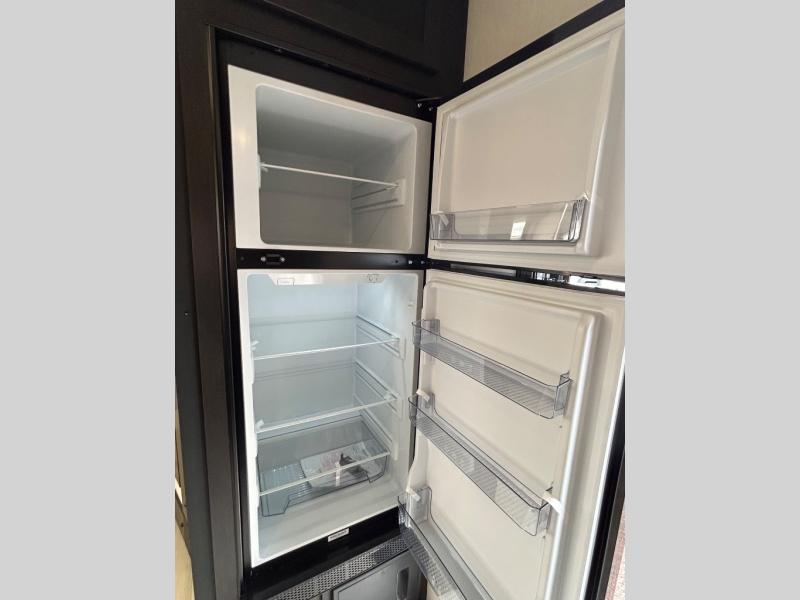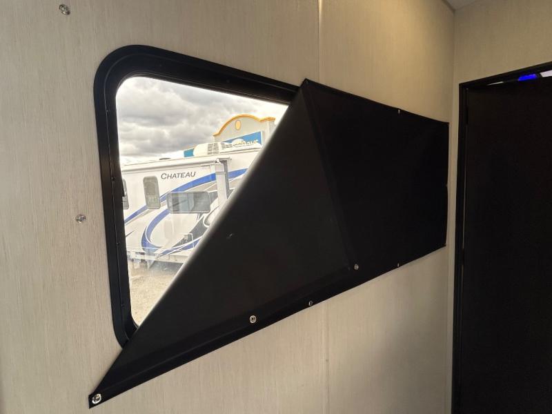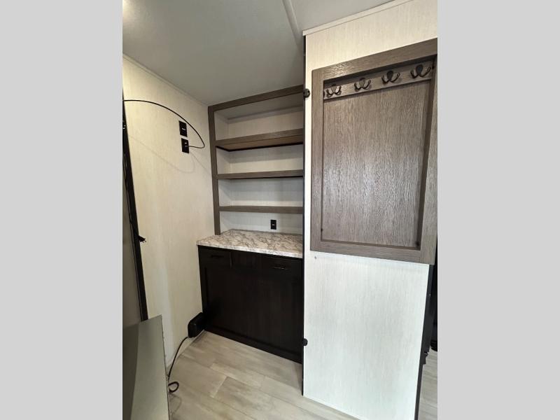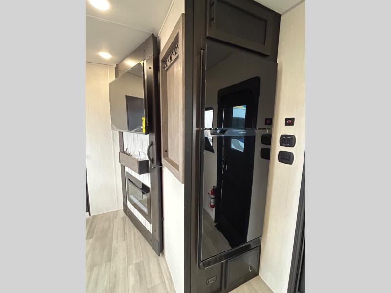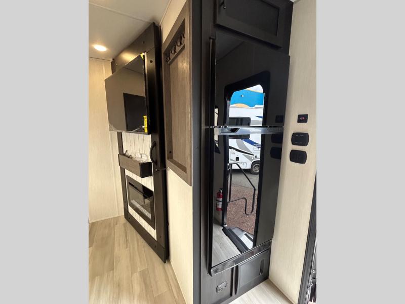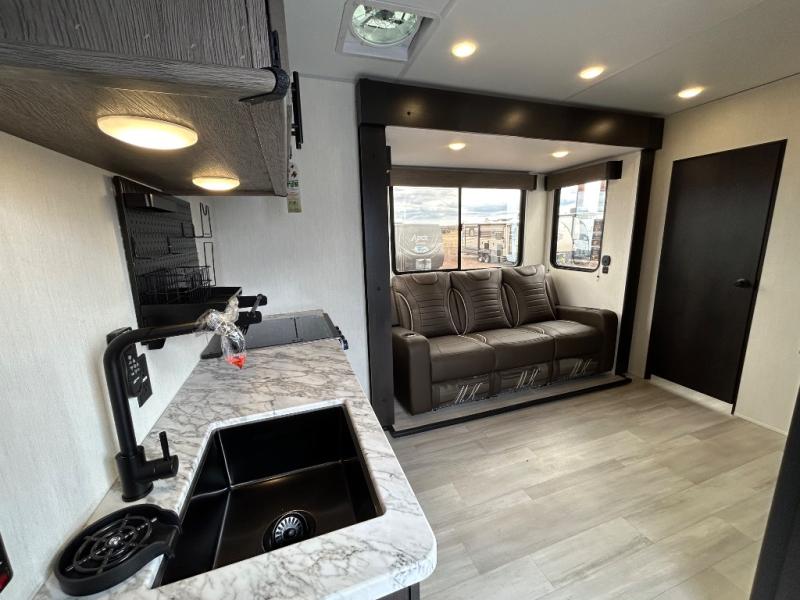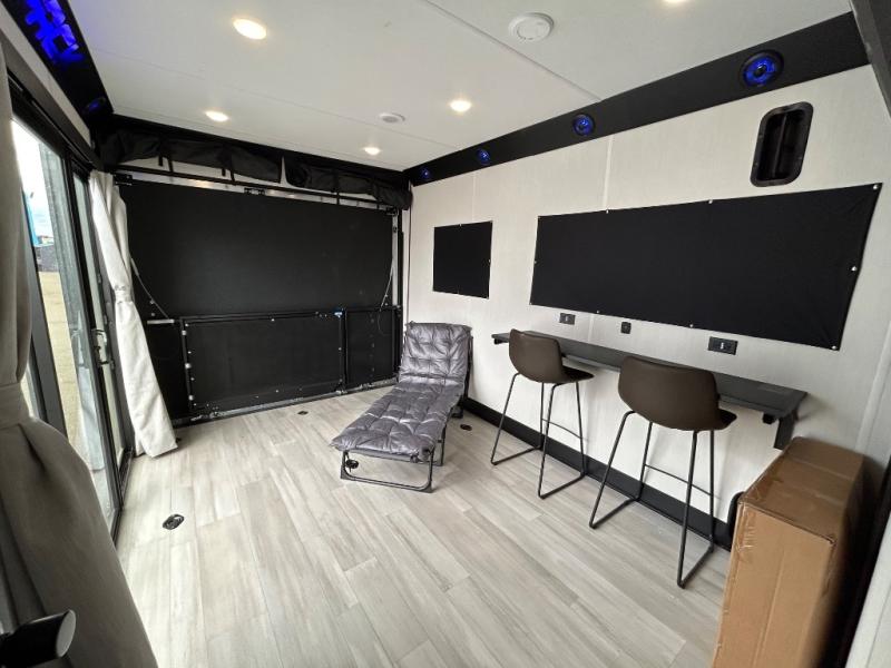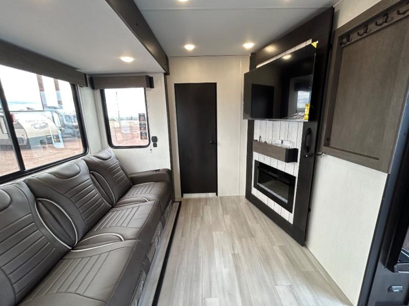 You can't go wrong in this spacious toy hauler with a 12' 6" garage! There is a flip-up counter with stools where you can eat each day, or you can take your plate outdoors to eat under the 21' power awning. The combined kitchen and living area includes a sofa slide out, appliances to make meals each day, and an entertainment center with a fireplace. There is also a pantry and drawers hidden behind the TV for smart storage spaces. The king bed is sure to provide a great night's rest, and there are dual nightstands and dual wardrobes to keep your things tidy.