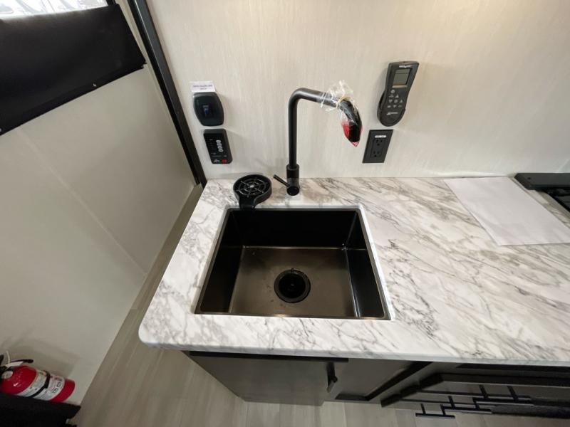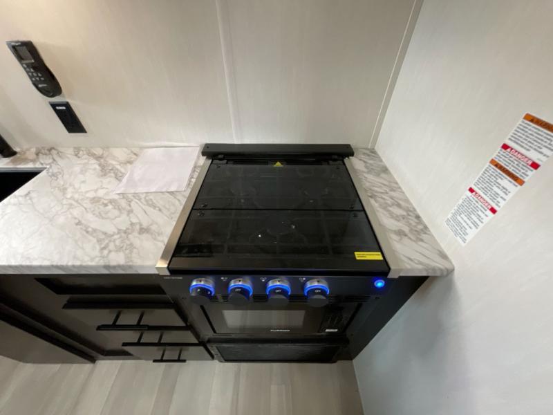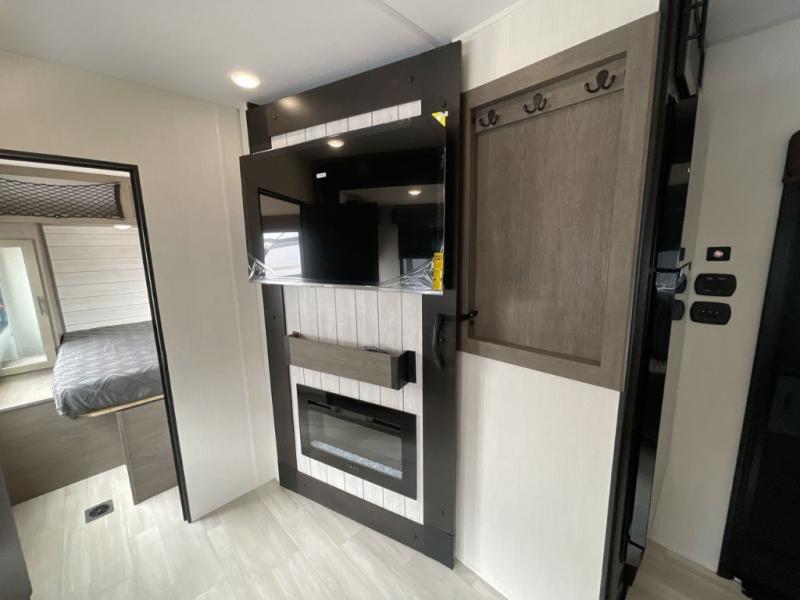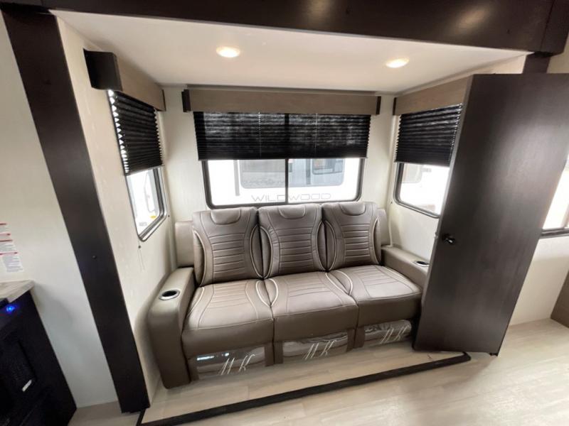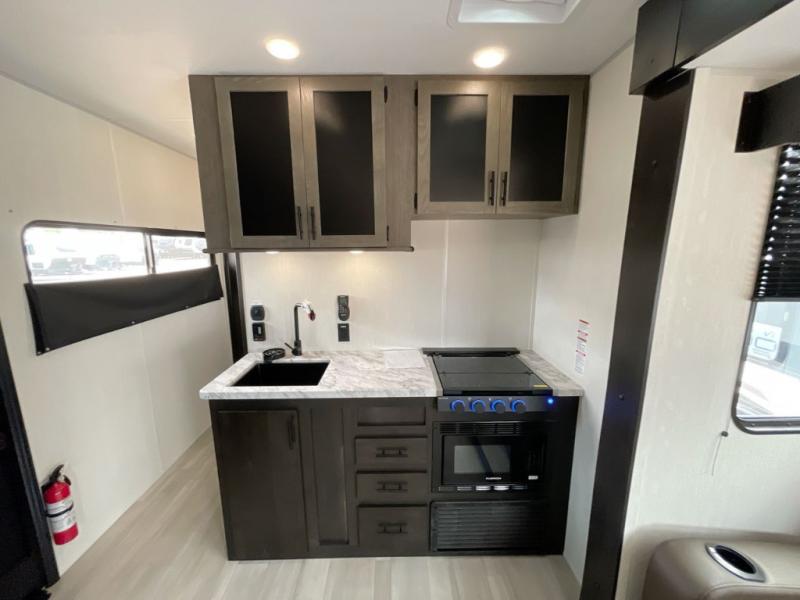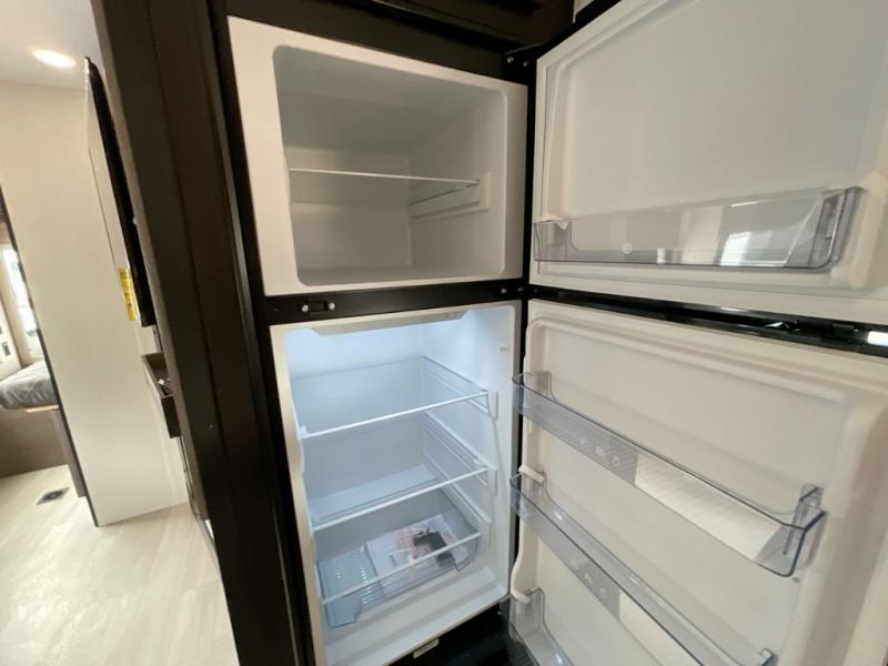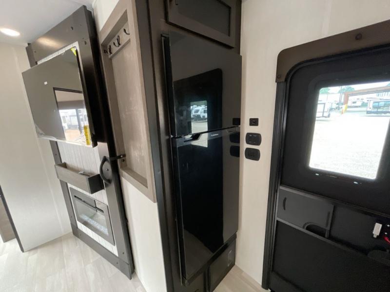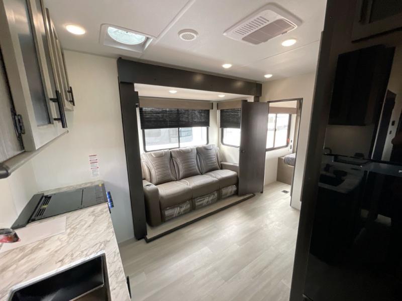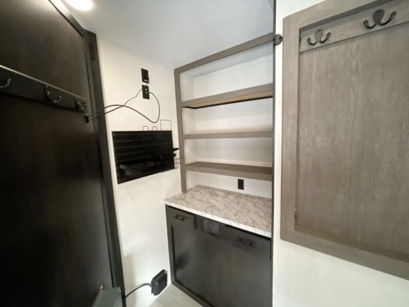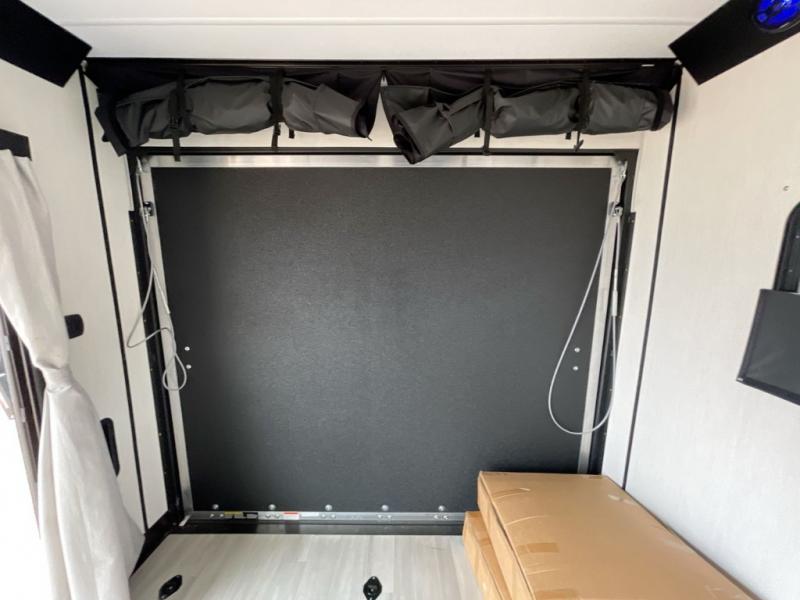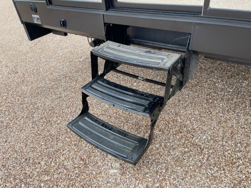 You can't go wrong in this spacious toy hauler with a 12' 6" garage! There is a flip-up counter with stools where you can eat each day, or you can take your plate outdoors to eat under the 21' power awning. The combined kitchen and living area includes a sofa slide out, appliances to make meals each day, and an entertainment center with a fireplace. There is also a pantry and drawers hidden behind the TV for smart storage spaces. The king bed is sure to provide a great night's rest, and there are dual nightstands and dual wardrobes to keep your things tidy.