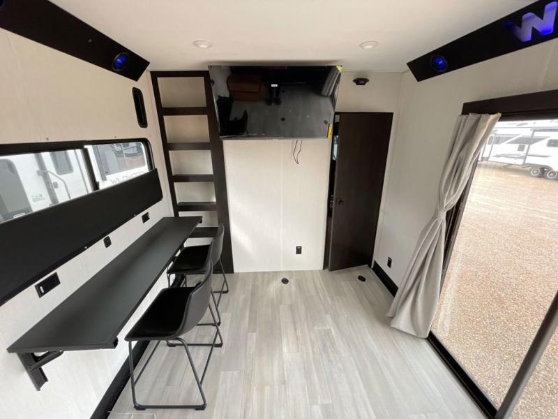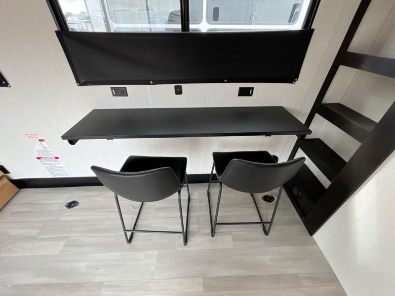 You can't go wrong in this spacious toy hauler with a 12' 6" garage! There is a flip-up counter with stools where you can eat each day, or you can take your plate outdoors to eat under the 21' power awning. The combined kitchen and living area includes a sofa slide out, appliances to make meals each day, and an entertainment center with a fireplace. There is also a pantry and drawers hidden behind the TV for smart storage spaces. The king bed is sure to provide a great night's rest, and there are dual nightstands and dual wardrobes to keep your things tidy.
