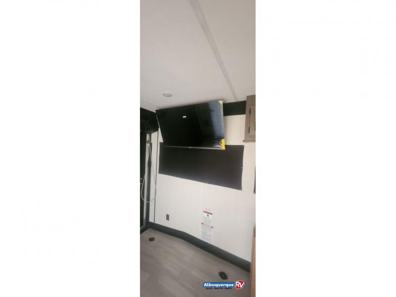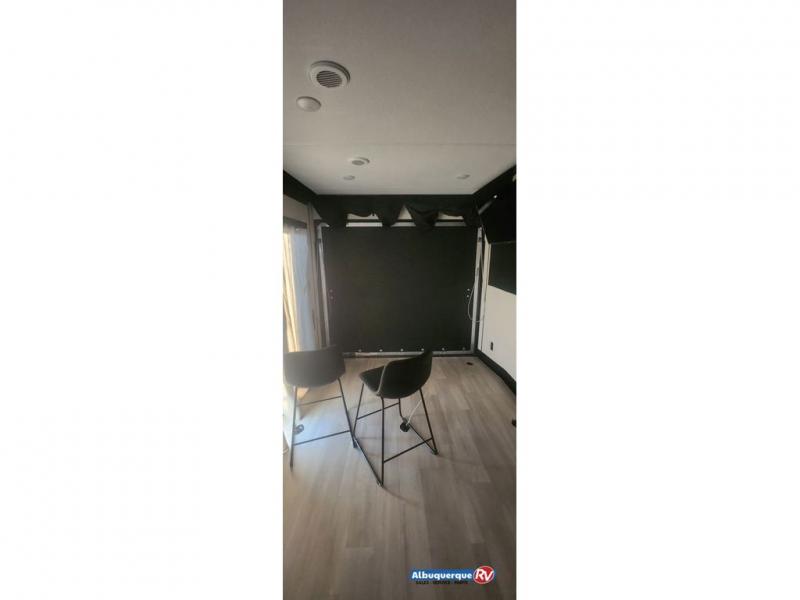 This toy hauler has everything you and your partner need to have a fantastic experience on the road! Unwind in the front bedroom, fitted with a large king bed, overhead cabinets, and wardrobes on each side of the bed, perfect for keeping all your clothes organized. A full bathroom is at your disposal boasting a washer and dryer prep ideal for keeping your best outfits nice and clean. In the kitchen area, you will find a 12V refrigerator, overhead cabinets, a pantry, a microwave, a TV with a fireplace, and a flip-up top within stools, best for having breakfast each morning.