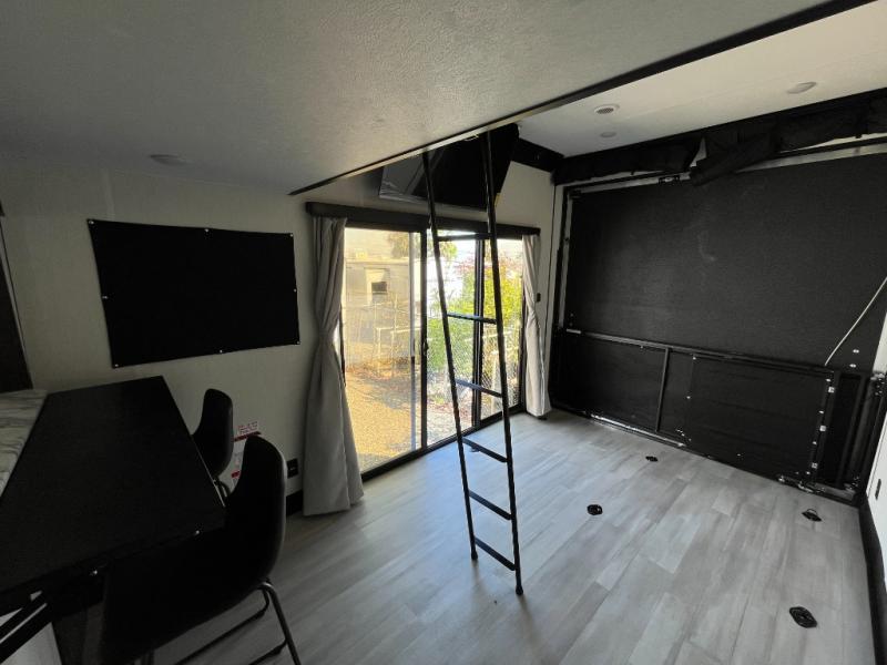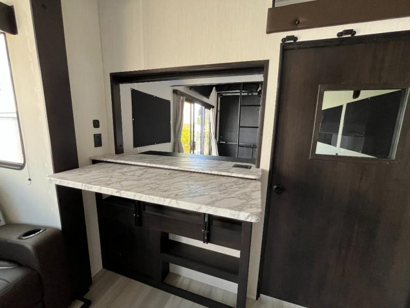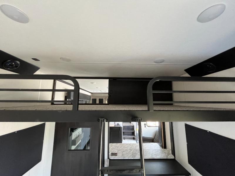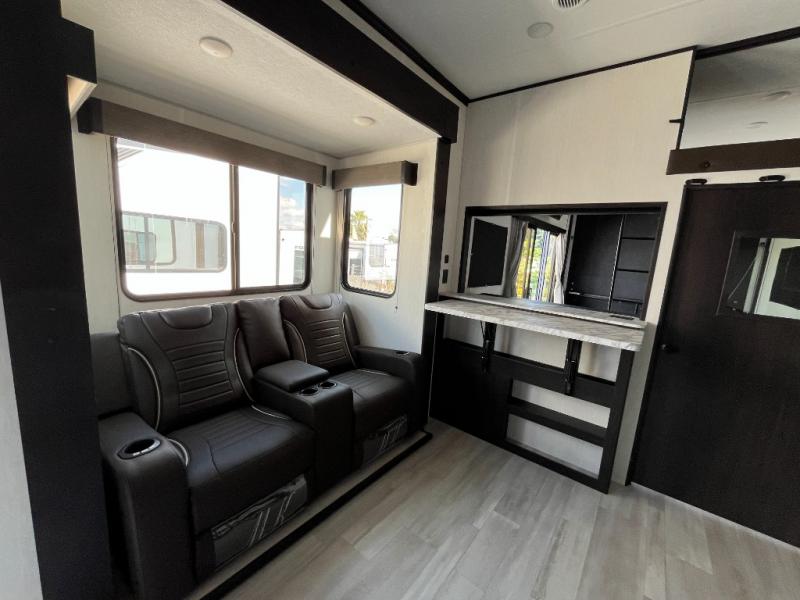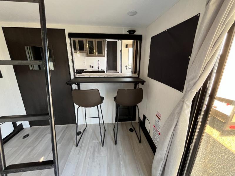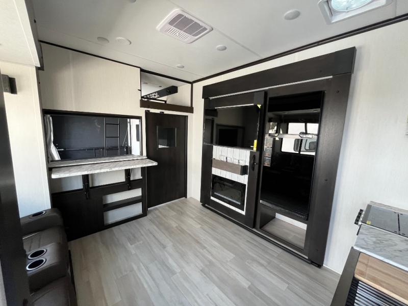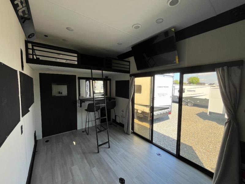 Fun at the campground begins with this toy hauler in tow! There is a 13' separate garage with a loft above for guests plus a patio deck to entertain guests. Your crew can get comfy on the theater seating across from the fireplace, and there is a hidden pantry behind to keep food stocked. The two flip-up countertops with stools provides a fun place to dine since there is a window between, or you can head outdoors to enjoy some fresh air under the two power awnings. A full bath lets you freshen up after a trail ride, and the front private bedroom gives you your own space at night. This unit also features washer and dryer prep in the bedroom so you can add those appliances if you wish!