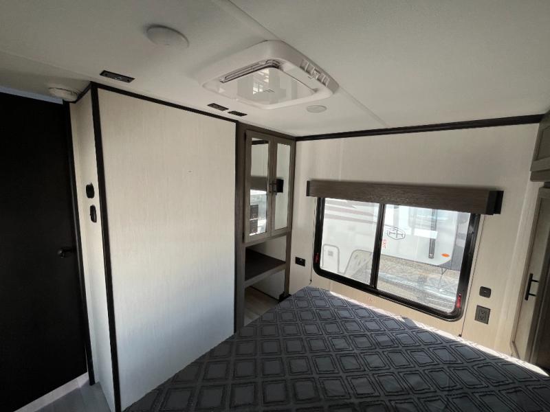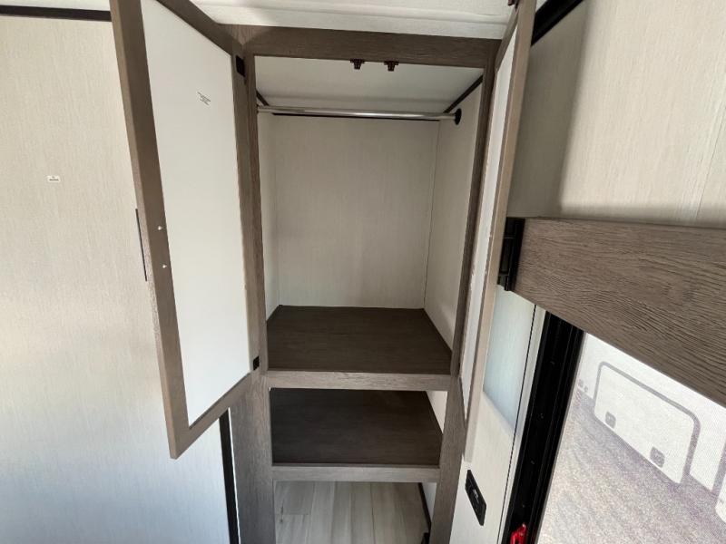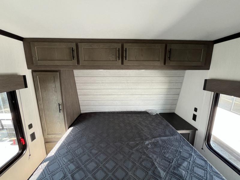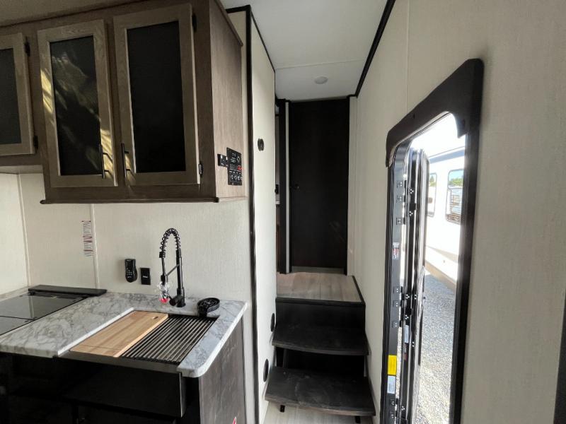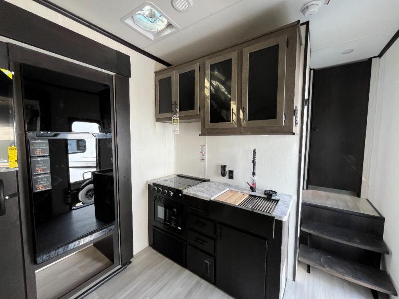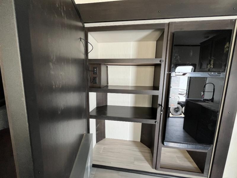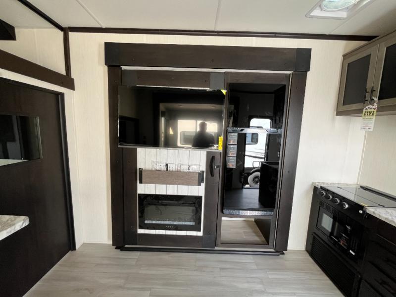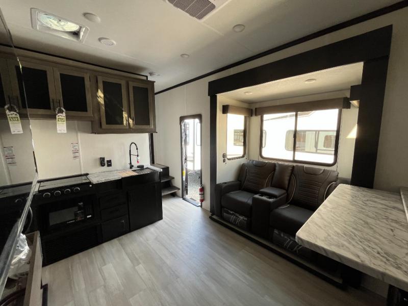 Fun at the campground begins with this toy hauler in tow! There is a 13' separate garage with a loft above for guests plus a patio deck to entertain guests. Your crew can get comfy on the theater seating across from the fireplace, and there is a hidden pantry behind to keep food stocked. The two flip-up countertops with stools provides a fun place to dine since there is a window between, or you can head outdoors to enjoy some fresh air under the two power awnings. A full bath lets you freshen up after a trail ride, and the front private bedroom gives you your own space at night. This unit also features washer and dryer prep in the bedroom so you can add those appliances if you wish!