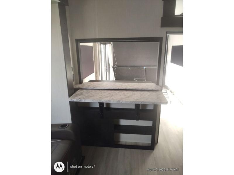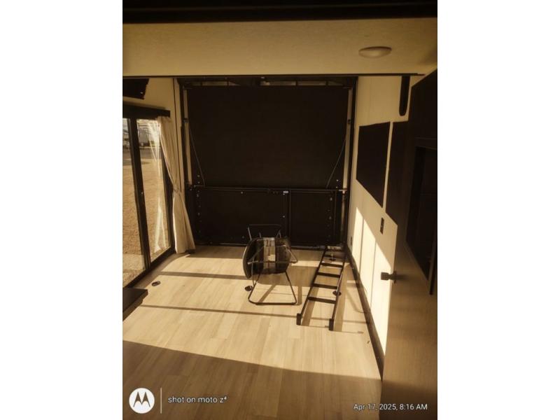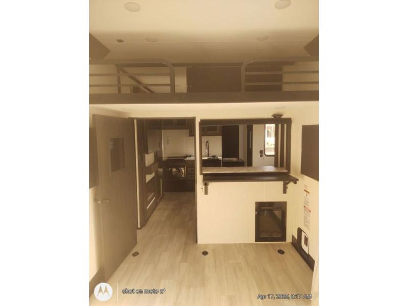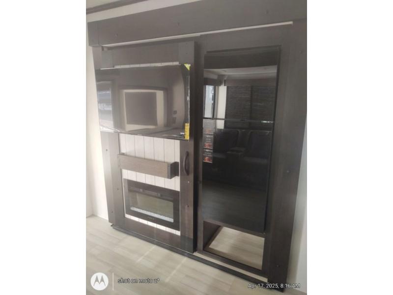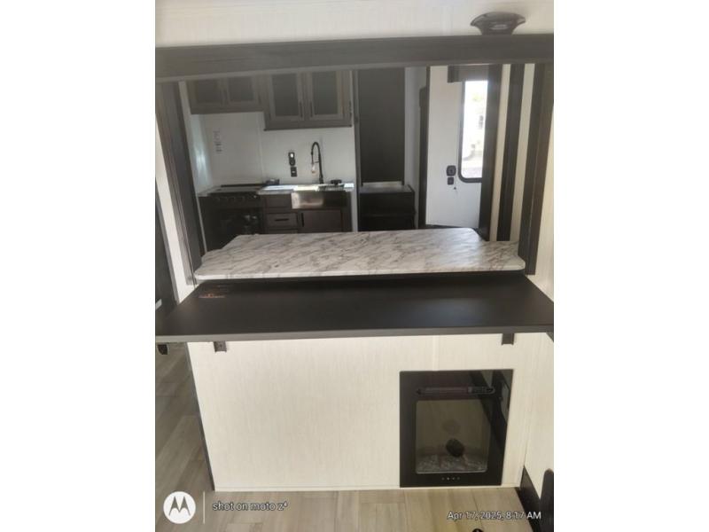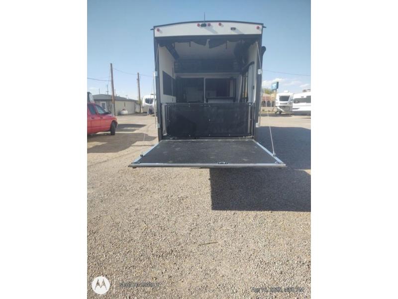 Fun at the campground begins with this toy hauler in tow! There is a 13' separate garage with a loft above for guests plus a patio deck to entertain guests. Your crew can get comfy on the theater seating across from the fireplace, and there is a hidden pantry behind to keep food stocked. The two flip-up countertops with stools provides a fun place to dine since there is a window between, or you can head outdoors to enjoy some fresh air under the two power awnings. A full bath lets you freshen up after a trail ride, and the front private bedroom gives you your own space at night. This unit also features washer and dryer prep in the bedroom so you can add those appliances if you wish!