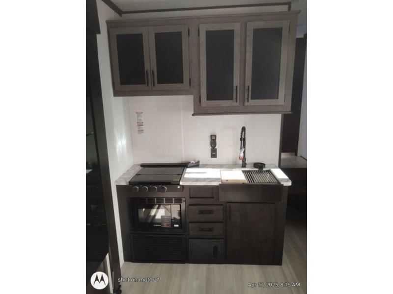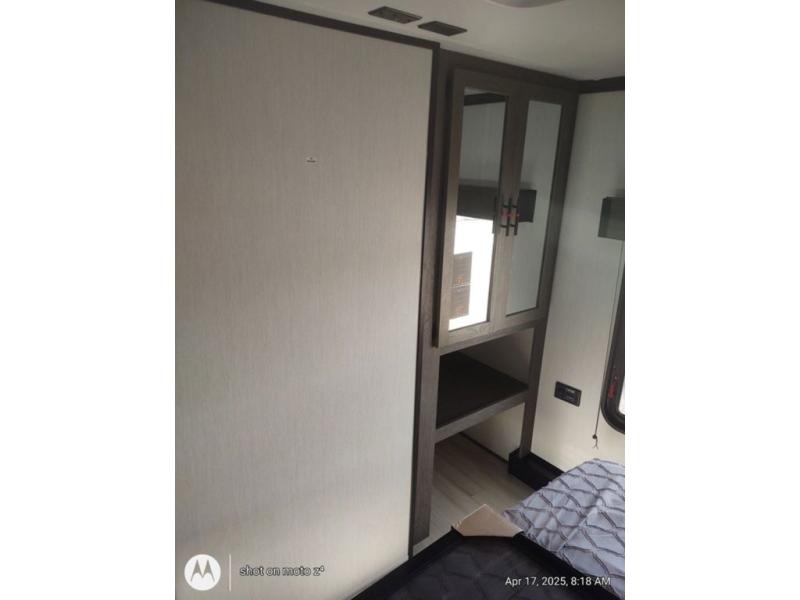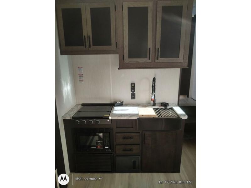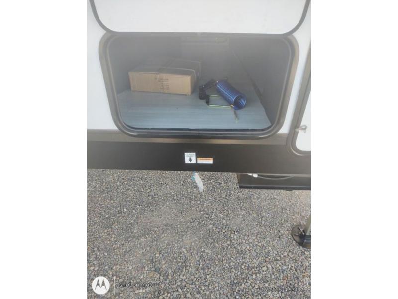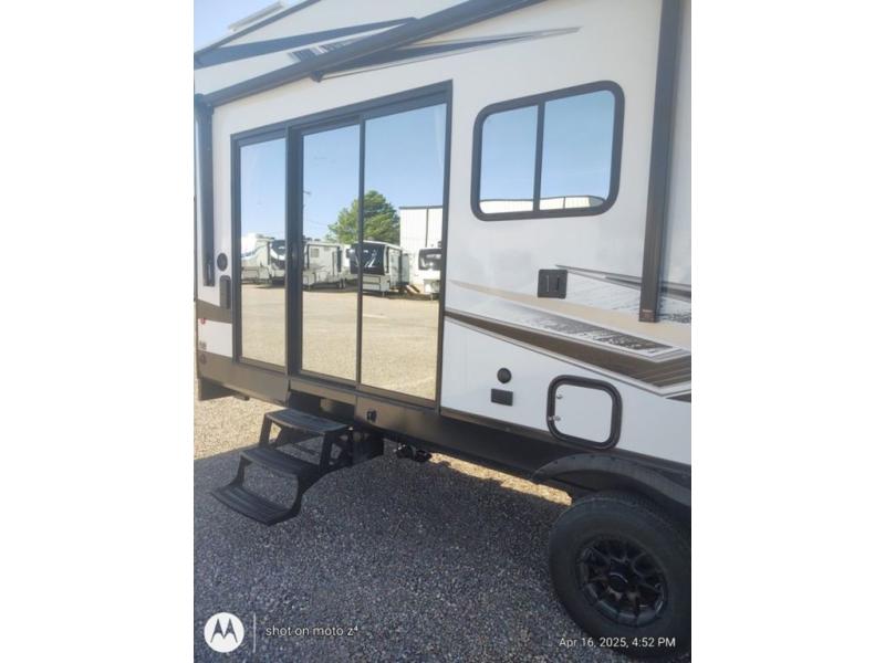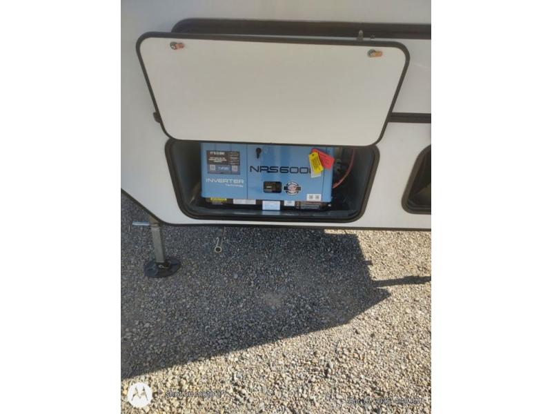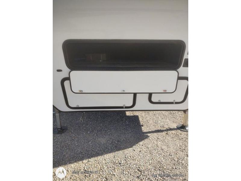 Fun at the campground begins with this toy hauler in tow! There is a 13' separate garage with a loft above for guests plus a patio deck to entertain guests. Your crew can get comfy on the theater seating across from the fireplace, and there is a hidden pantry behind to keep food stocked. The two flip-up countertops with stools provides a fun place to dine since there is a window between, or you can head outdoors to enjoy some fresh air under the two power awnings. A full bath lets you freshen up after a trail ride, and the front private bedroom gives you your own space at night. This unit also features washer and dryer prep in the bedroom so you can add those appliances if you wish!
