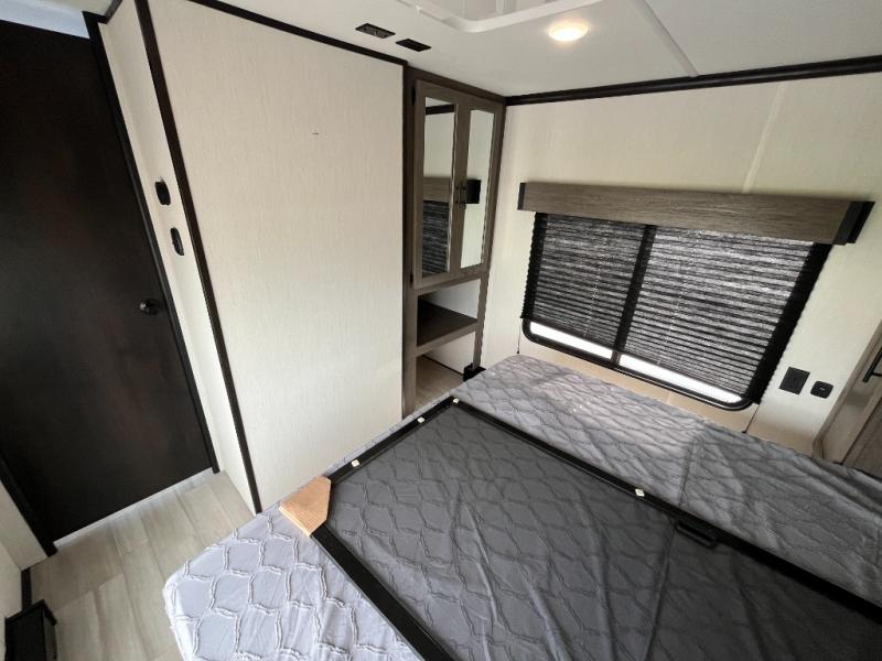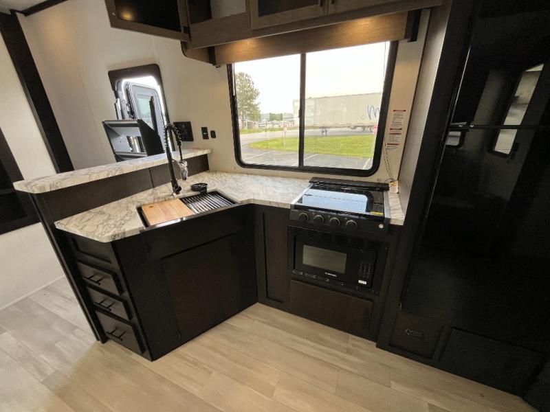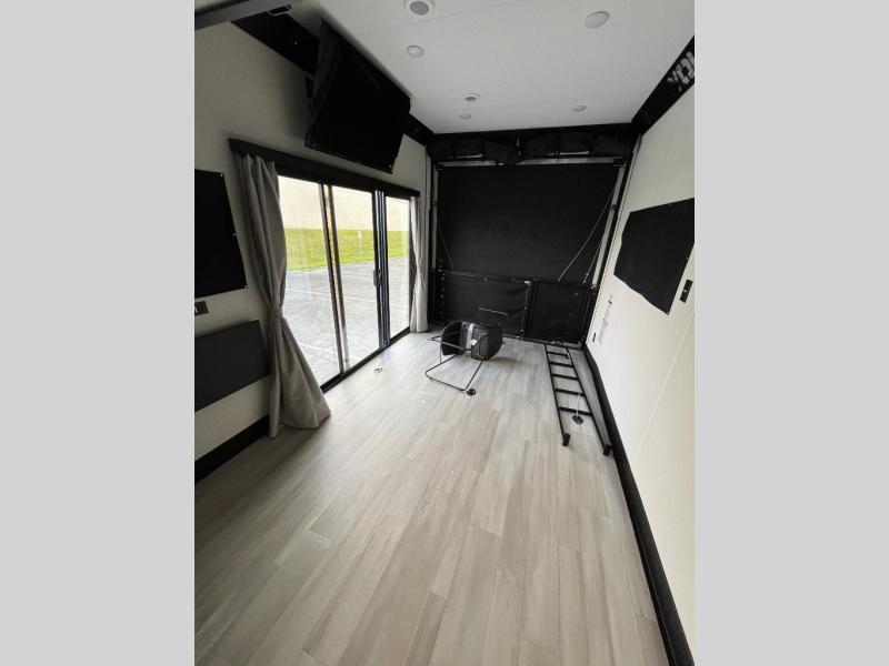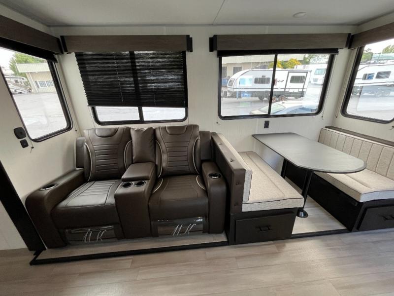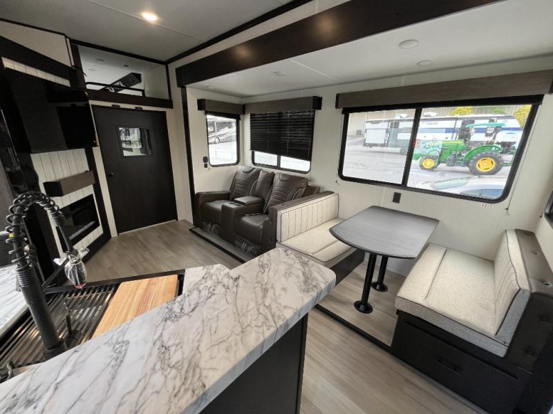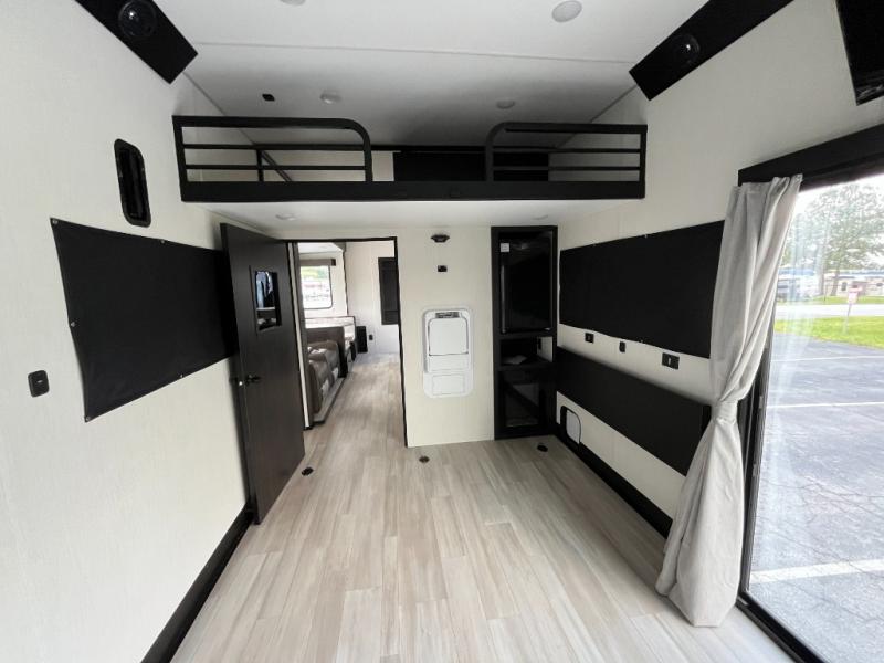 Fun at the campground begins with this dual entry toy hauler in tow! There is a 15' separate garage with glass patio doors, a loft above for guests, plus a patio deck to entertain guests. Your crew can get comfy on the theater seating or booth dinette, and there is an entertainment center with a fireplace and a hidden pantry for snacks. The chef of your group will love the full interior kitchen, along with an outdoor kitchen when the weather is nice. A full bath lets you freshen up after a trail ride, and the front private bedroom gives you your own space at night. This unit also features washer and dryer prep in the bedroom so you can add those appliances if you wish!