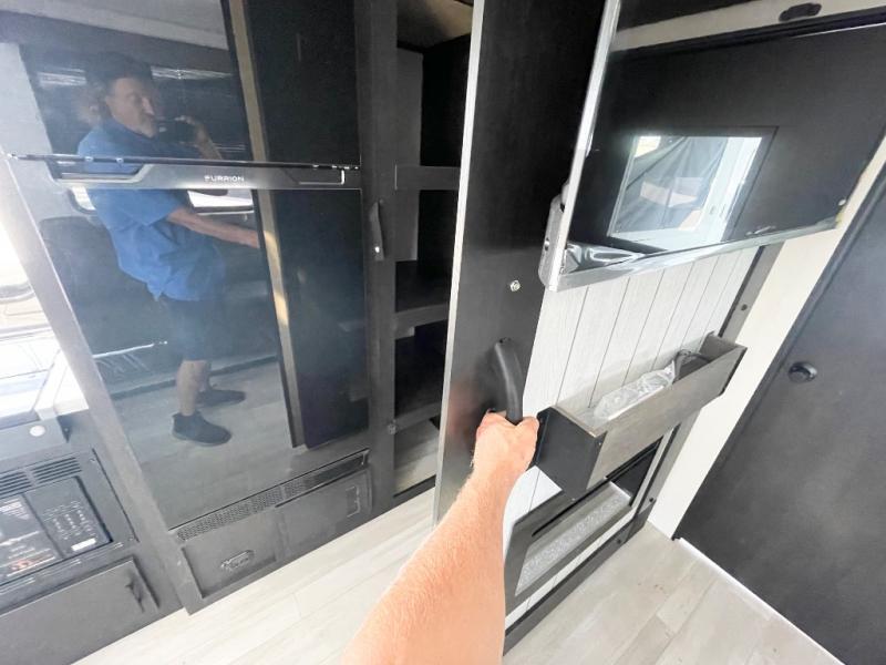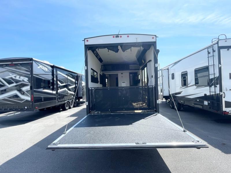 Fun at the campground begins with this dual entry toy hauler in tow! There is a 15' separate garage with glass patio doors, a loft above for guests, plus a patio deck to entertain guests. Your crew can get comfy on the theater seating or booth dinette, and there is an entertainment center with a fireplace and a hidden pantry for snacks. The chef of your group will love the full interior kitchen, along with an outdoor kitchen when the weather is nice. A full bath lets you freshen up after a trail ride, and the front private bedroom gives you your own space at night. This unit also features washer and dryer prep in the bedroom so you can add those appliances if you wish!