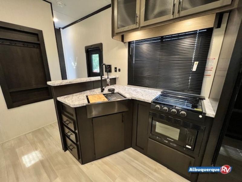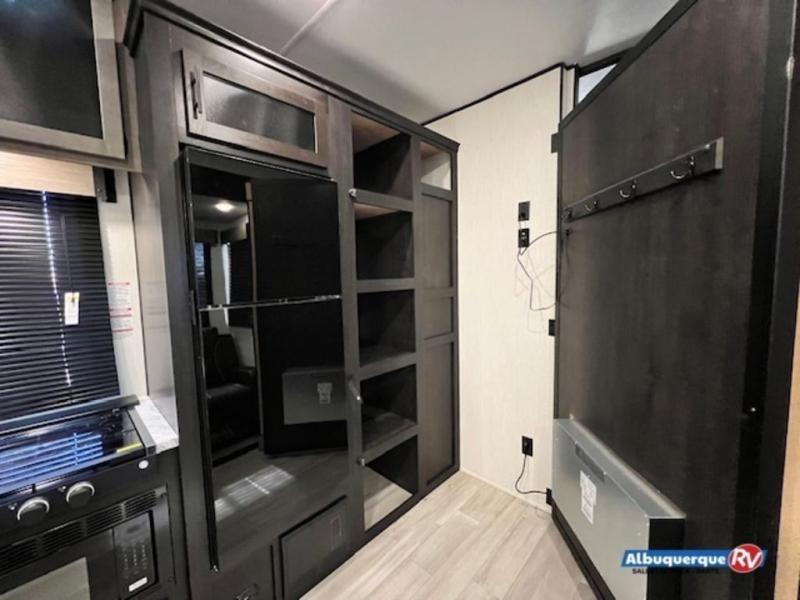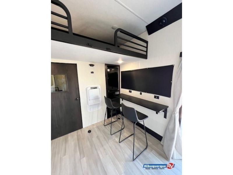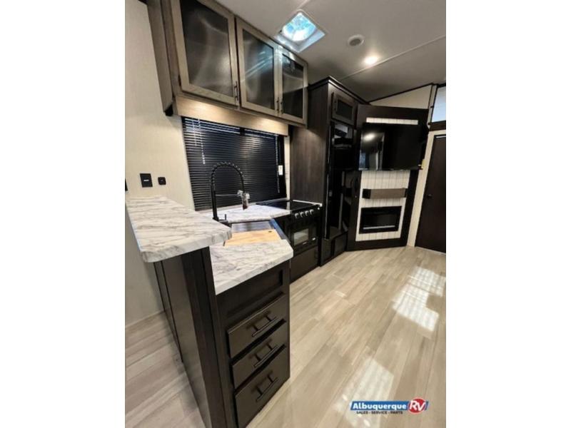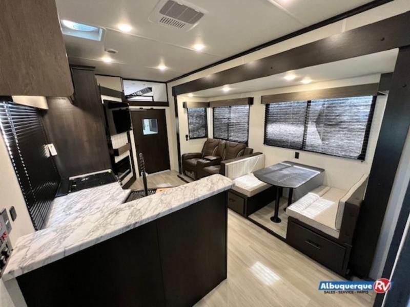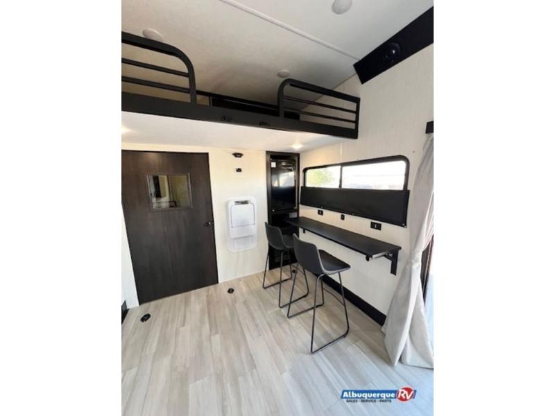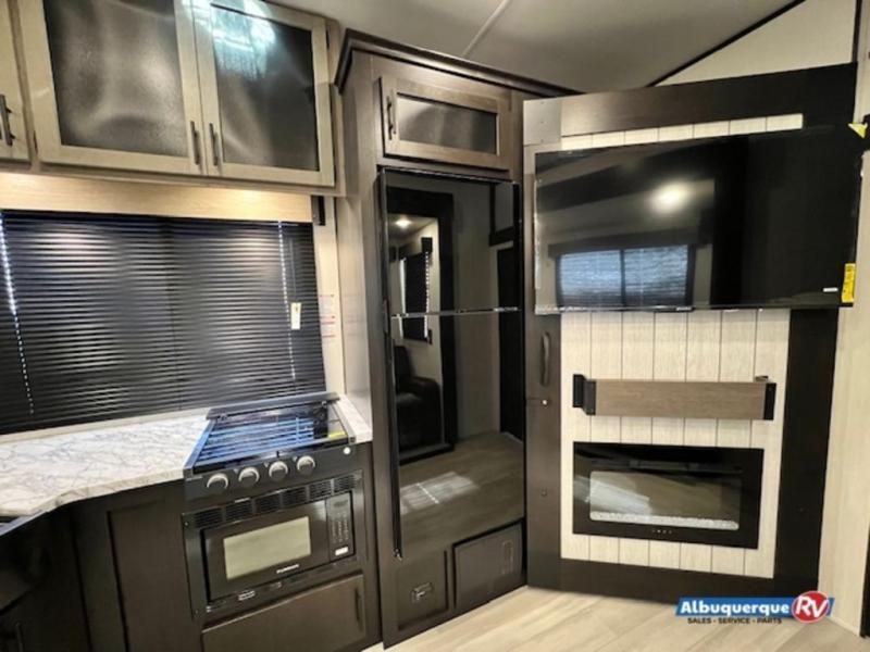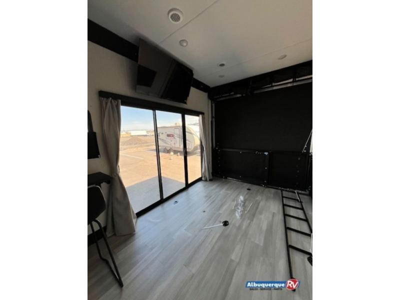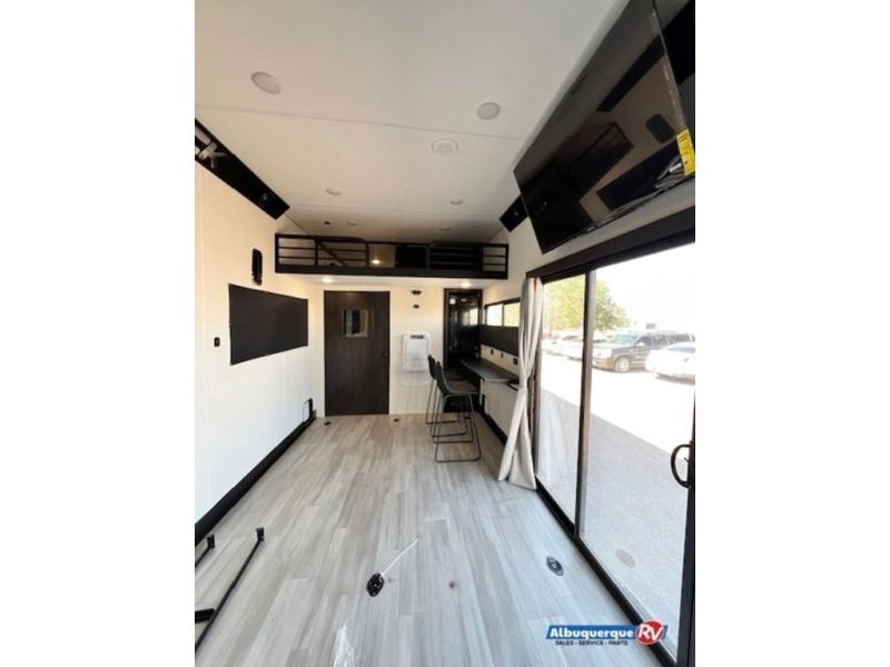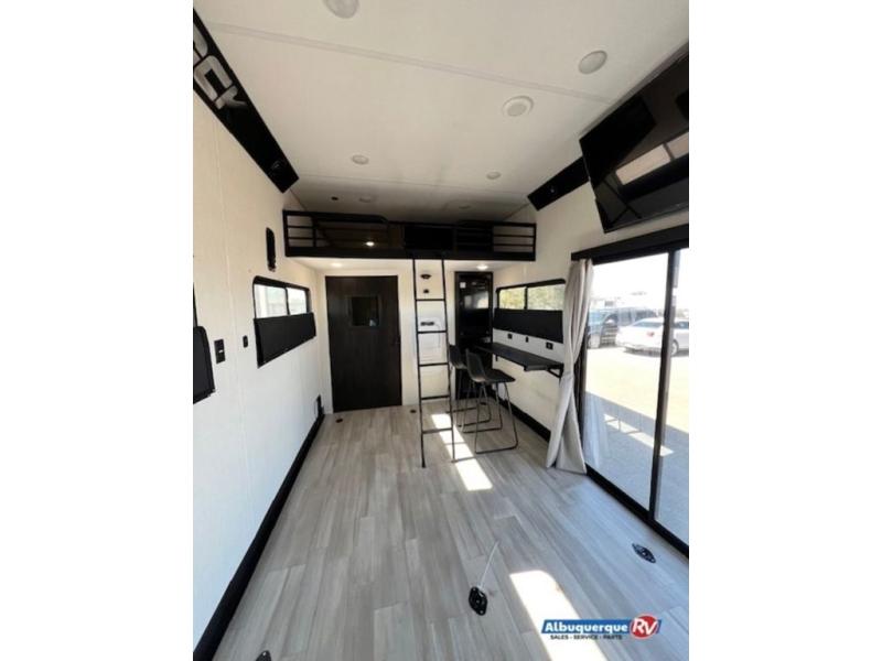 Fun at the campground begins with this dual entry toy hauler in tow! There is a 15' separate garage with glass patio doors, a loft above for guests, plus a patio deck to entertain guests. Your crew can get comfy on the theater seating or booth dinette, and there is an entertainment center with a fireplace and a hidden pantry for snacks. The chef of your group will love the full interior kitchen, along with an outdoor kitchen when the weather is nice. A full bath lets you freshen up after a trail ride, and the front private bedroom gives you your own space at night. This unit also features washer and dryer prep in the bedroom so you can add those appliances if you wish!