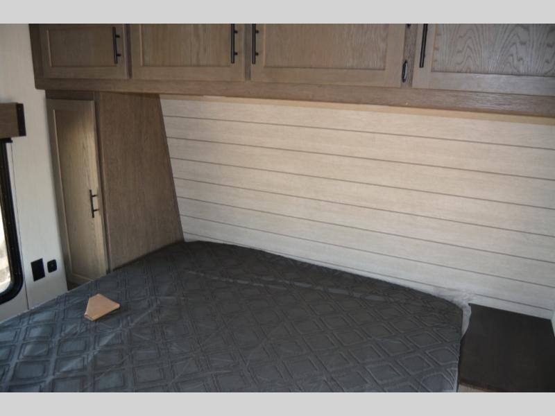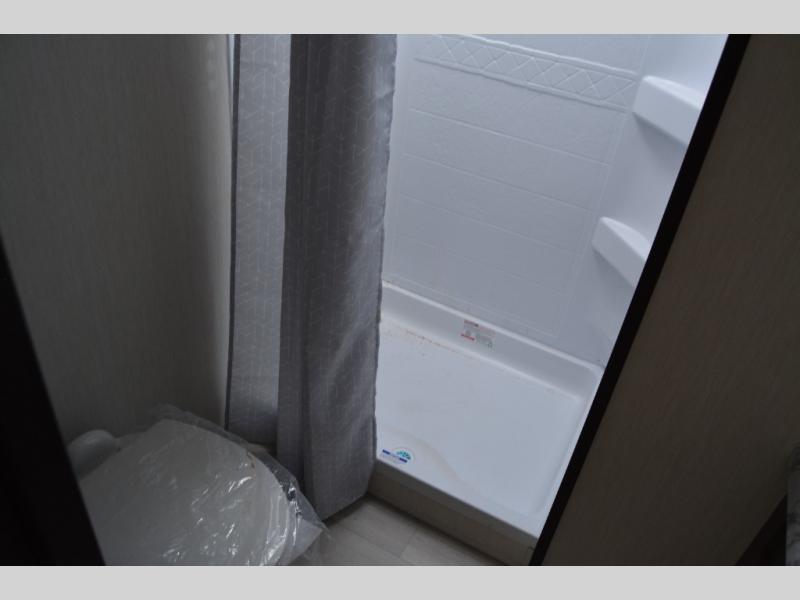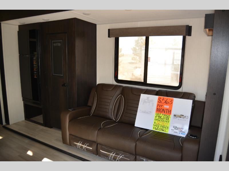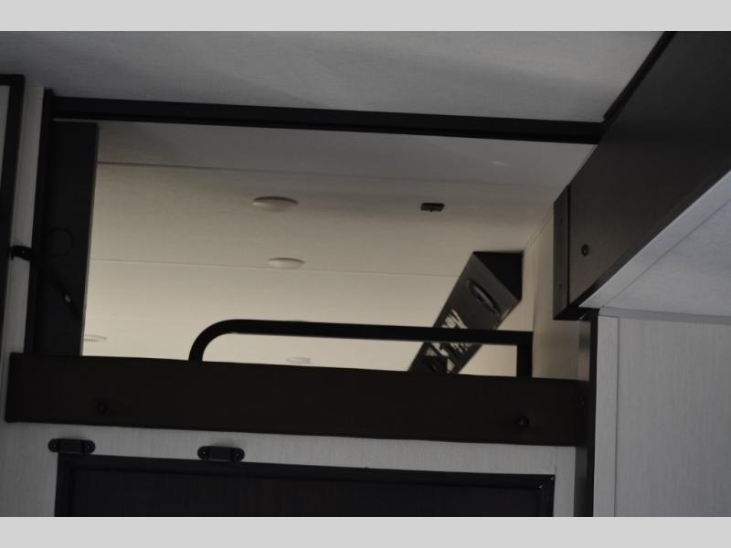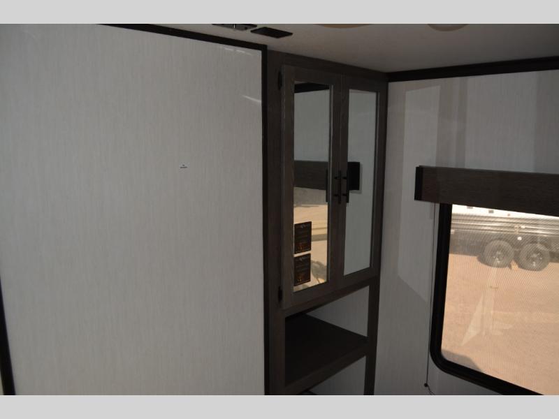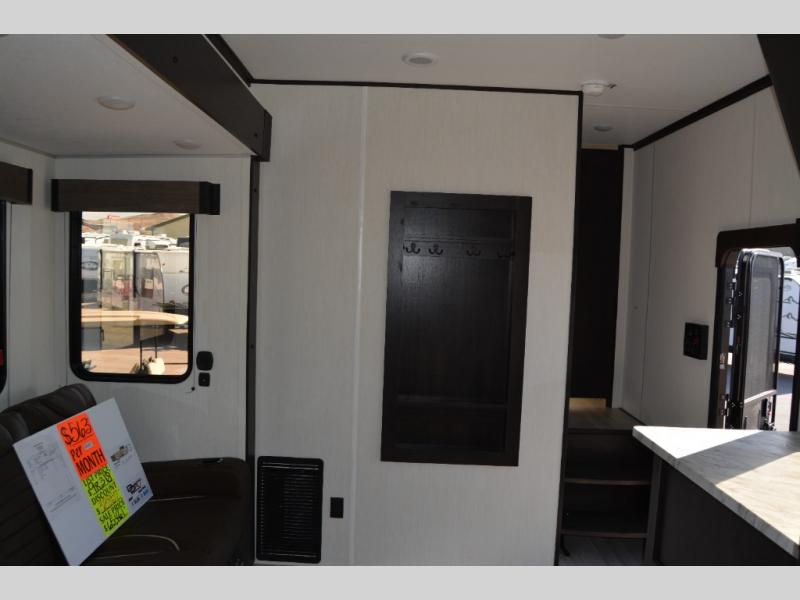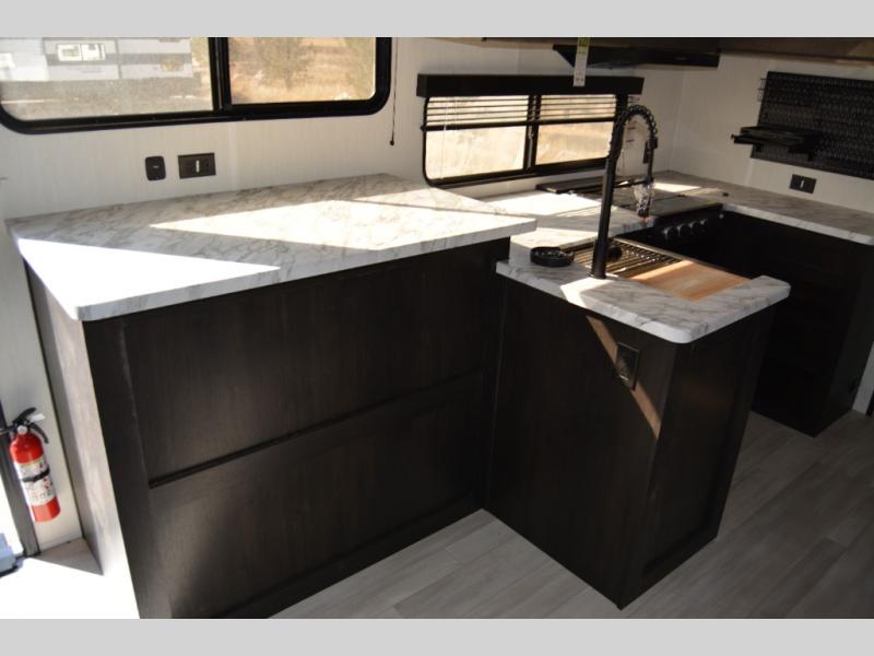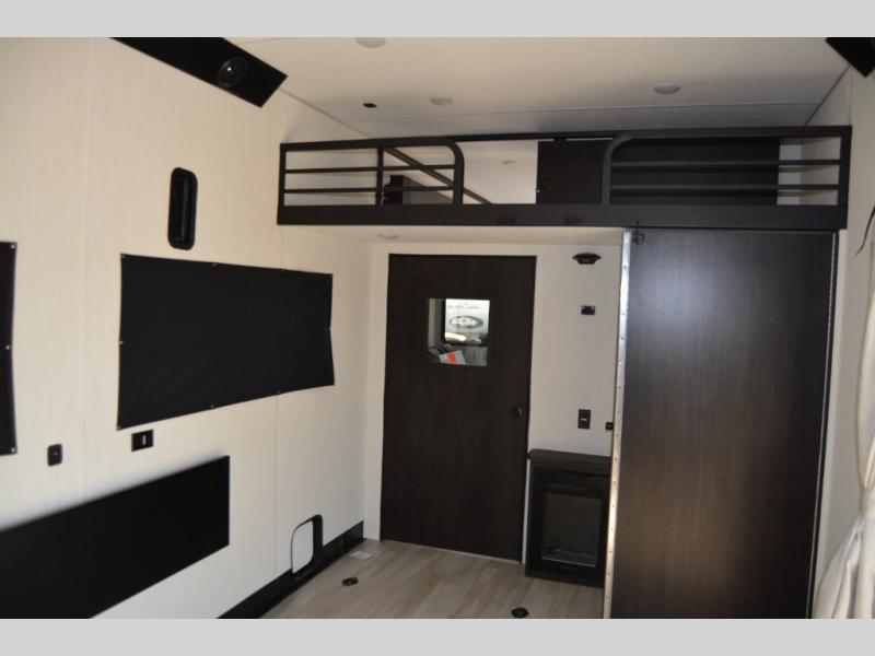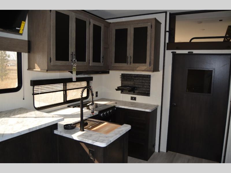 Fun at the campground begins with this dual entry toy hauler in tow! There is a 15' 6" separate garage with glass patio doors, a loft above for guests, a half bath with folding walls and a flip-down recessed bath sink. The combined kitchen and living room features a U-shaped kitchen with a flip-up countertop, a sofa slide out, and a bartop with two stools. There is even an outdoor kitchen on the other side of this counter so you can make breakfast as the sun comes up. A full bath lets you freshen up after a trail ride, and the front private bedroom gives you your own space at night. This unit also features washer and dryer prep in the bedroom so you can add those appliances if you wish!