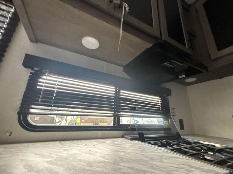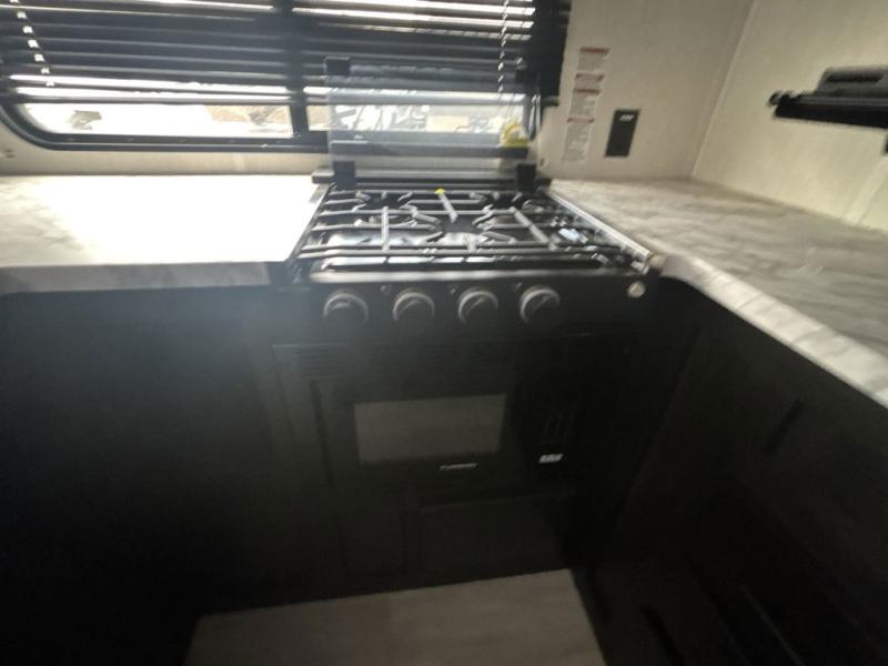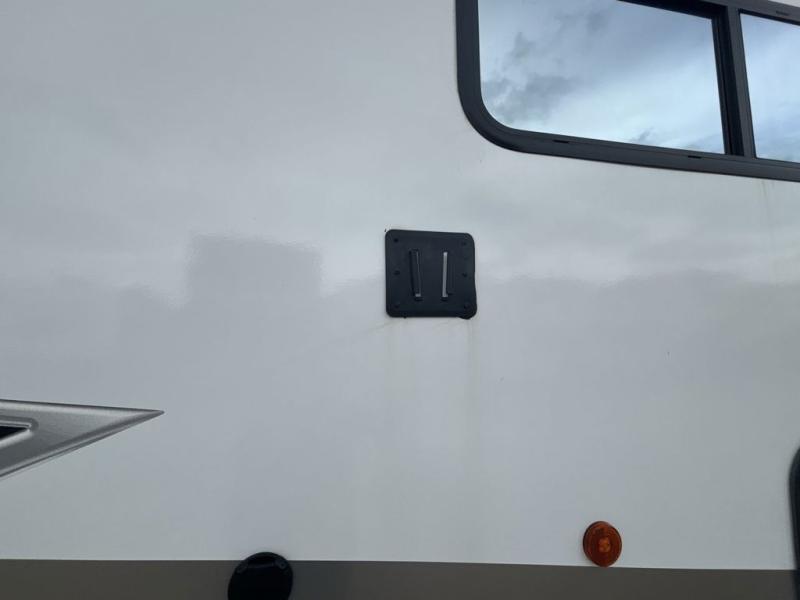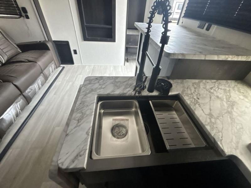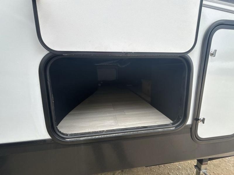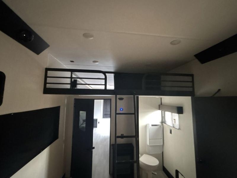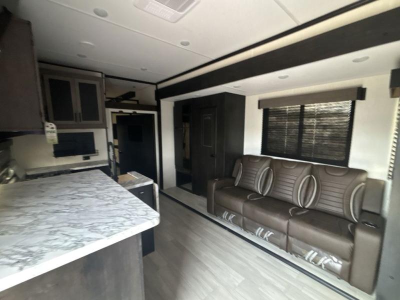 Fun at the campground begins with this dual entry toy hauler in tow! There is a 15' 6" separate garage with glass patio doors, a loft above for guests, a half bath with folding walls and a flip-down recessed bath sink. The combined kitchen and living room features a U-shaped kitchen with a flip-up countertop, a sofa slide out, and a bartop with two stools. There is even an outdoor kitchen on the other side of this counter so you can make breakfast as the sun comes up. A full bath lets you freshen up after a trail ride, and the front private bedroom gives you your own space at night. This unit also features washer and dryer prep in the bedroom so you can add those appliances if you wish!