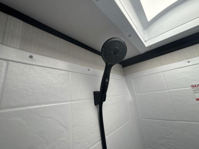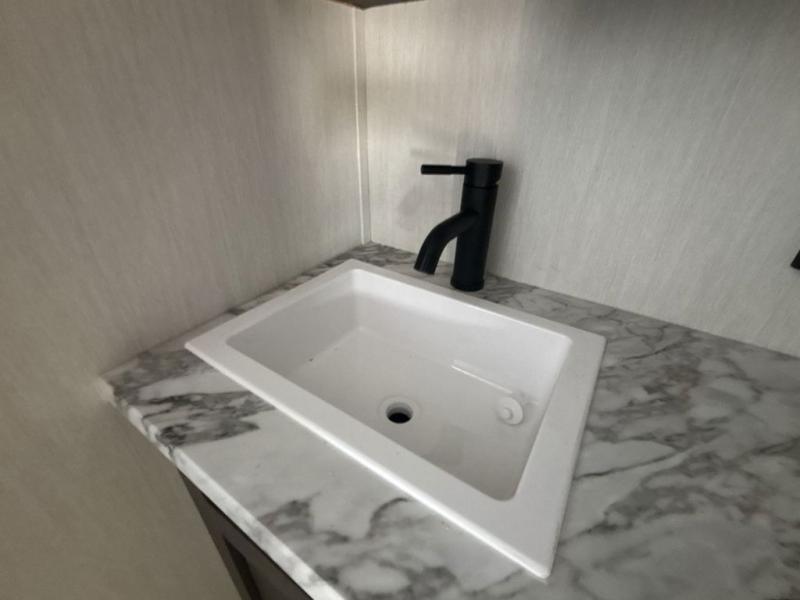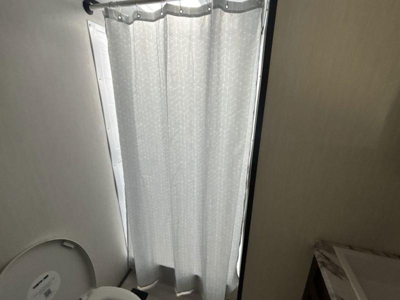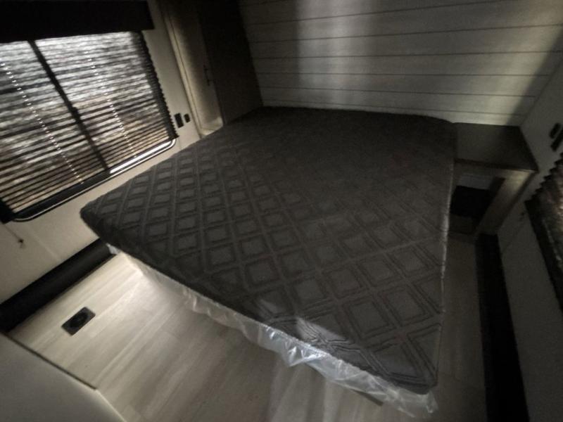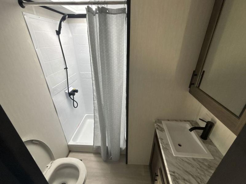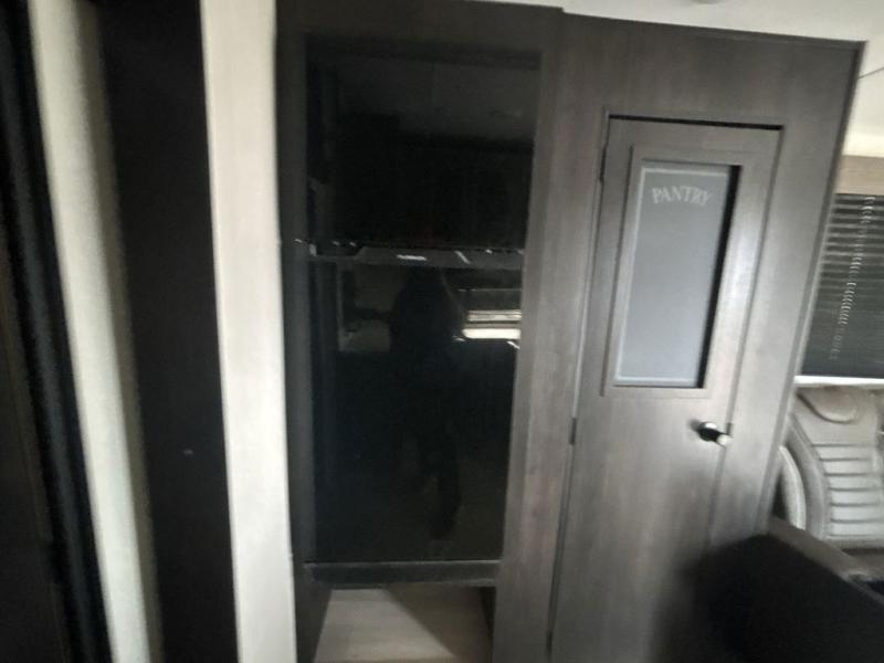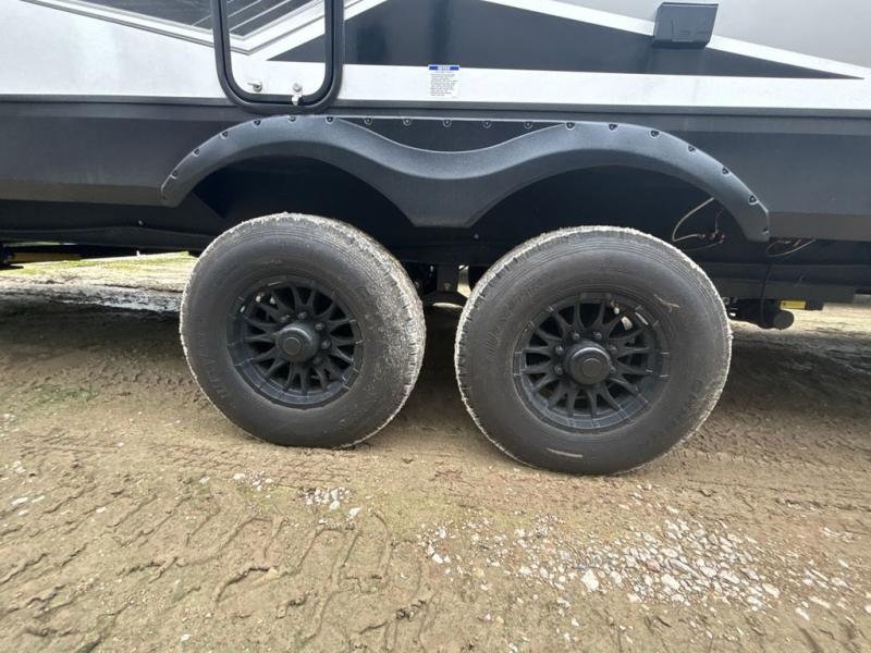 Fun at the campground begins with this dual entry toy hauler in tow! There is a 15' 6" separate garage with glass patio doors, a loft above for guests, a half bath with folding walls and a flip-down recessed bath sink. The combined kitchen and living room features a U-shaped kitchen with a flip-up countertop, a sofa slide out, and a bartop with two stools. There is even an outdoor kitchen on the other side of this counter so you can make breakfast as the sun comes up. A full bath lets you freshen up after a trail ride, and the front private bedroom gives you your own space at night. This unit also features washer and dryer prep in the bedroom so you can add those appliances if you wish!