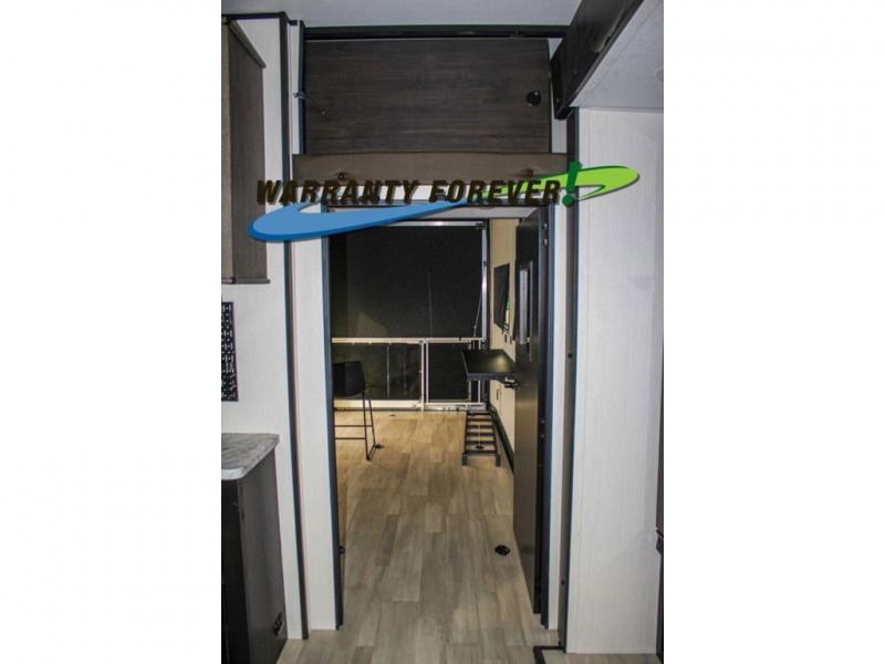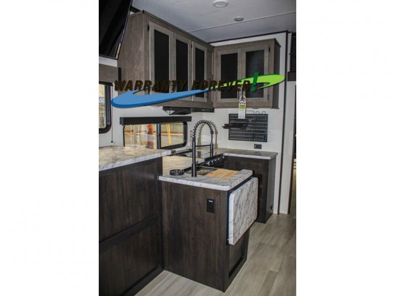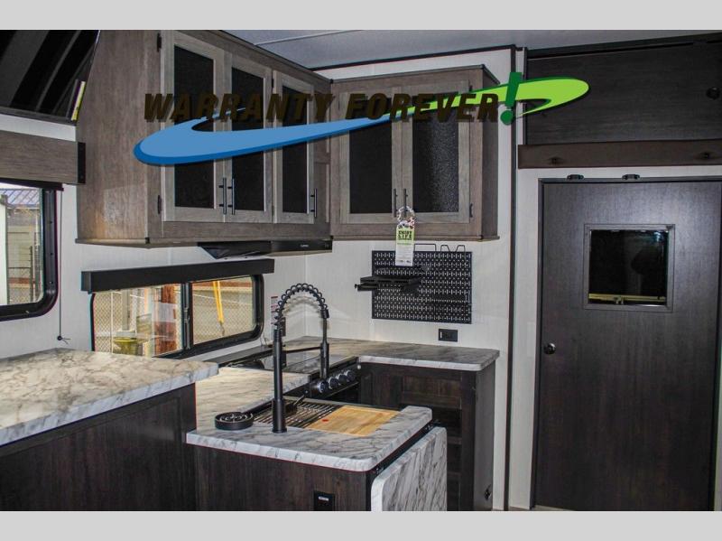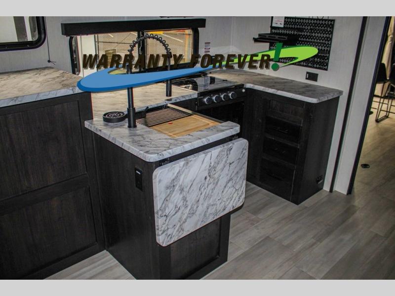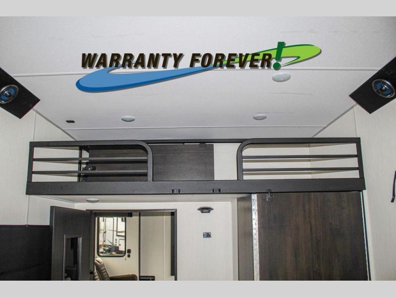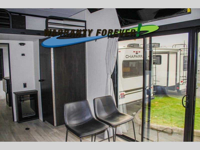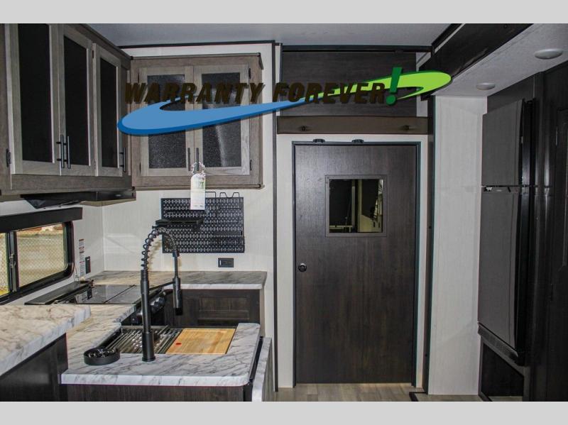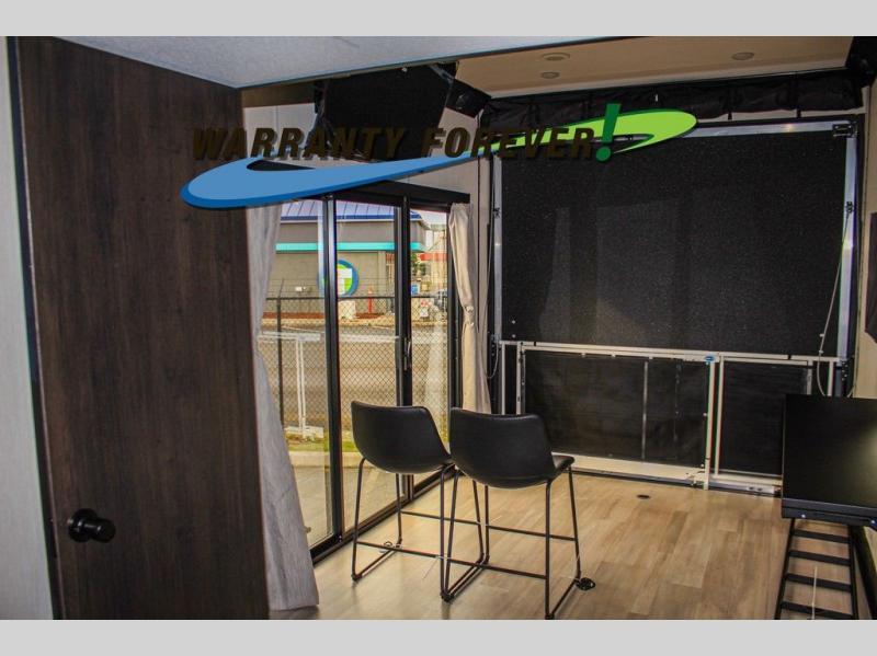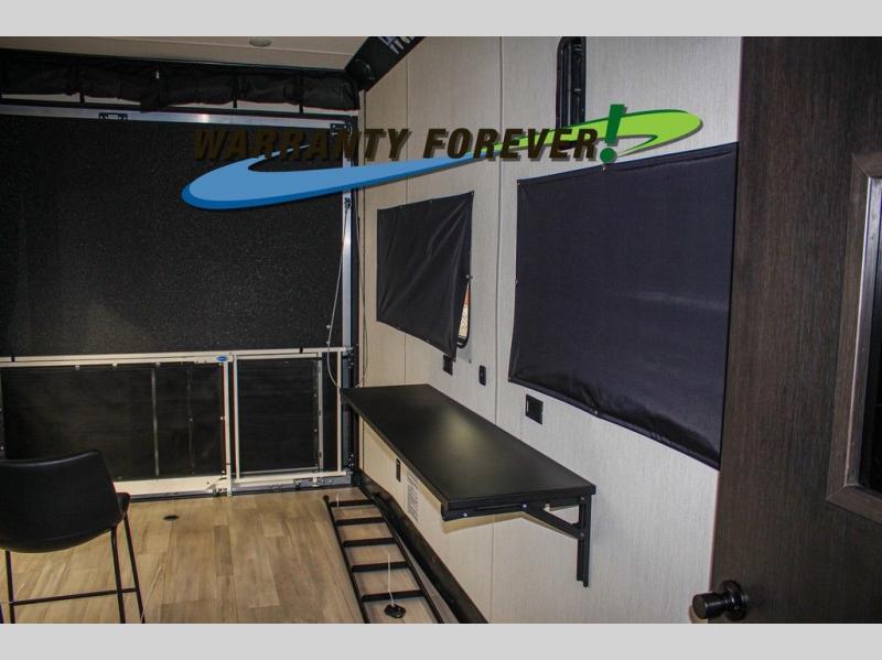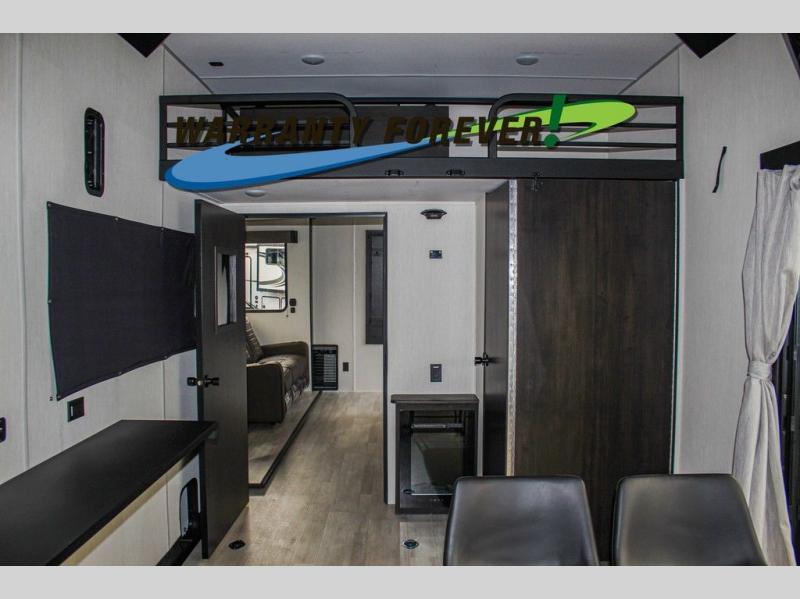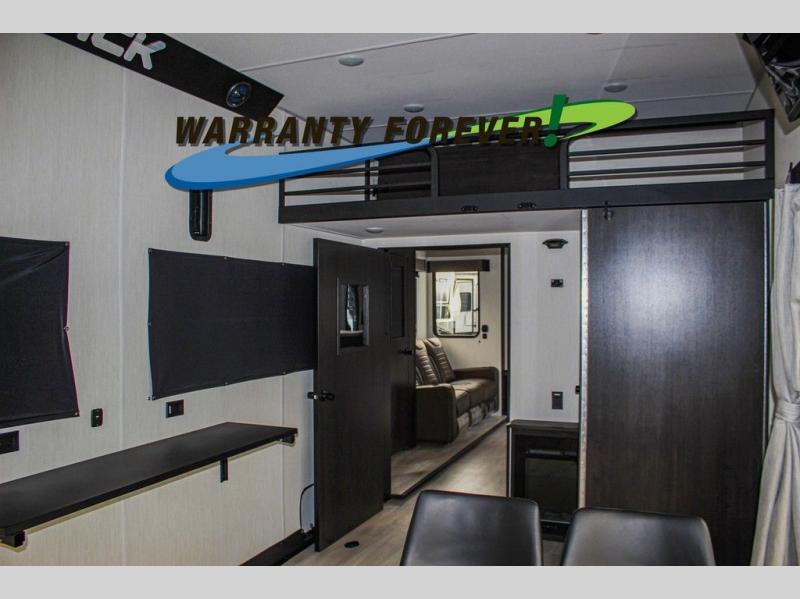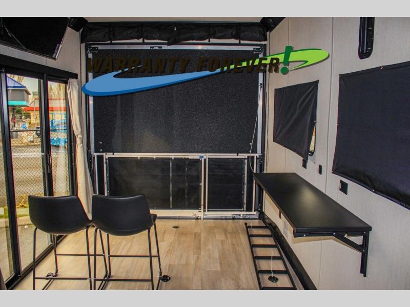 Fun at the campground begins with this dual entry toy hauler in tow! There is a 15' 6" separate garage with glass patio doors, a loft above for guests, a half bath with folding walls and a flip-down recessed bath sink. The combined kitchen and living room features a U-shaped kitchen with a flip-up countertop, a sofa slide out, and a bartop with two stools. There is even an outdoor kitchen on the other side of this counter so you can make breakfast as the sun comes up. A full bath lets you freshen up after a trail ride, and the front private bedroom gives you your own space at night. This unit also features washer and dryer prep in the bedroom so you can add those appliances if you wish!