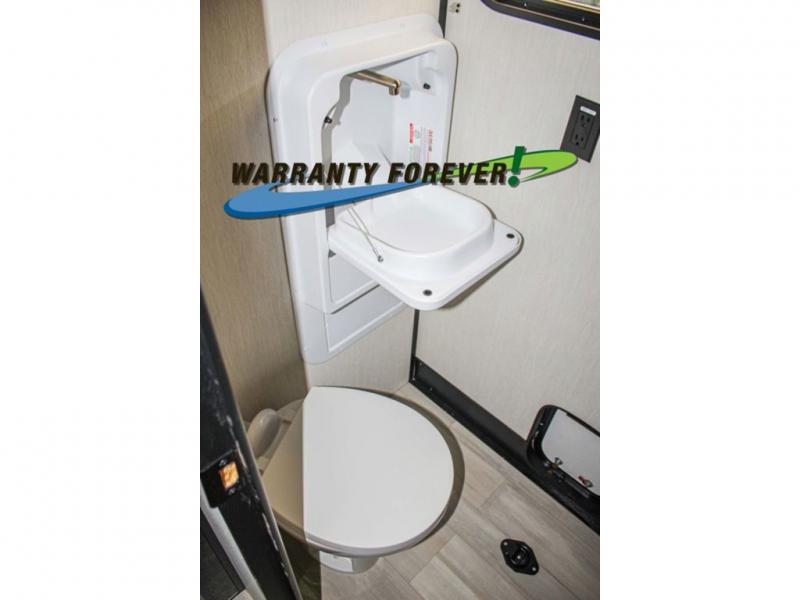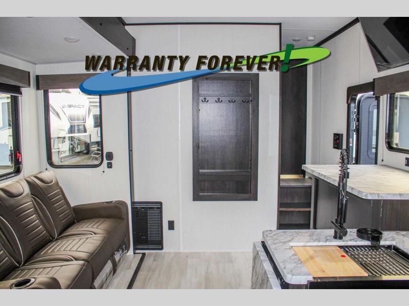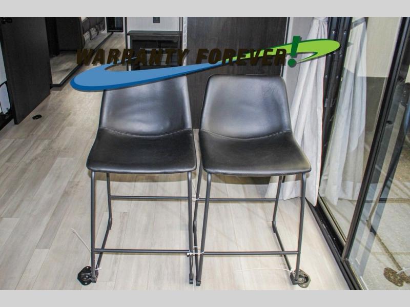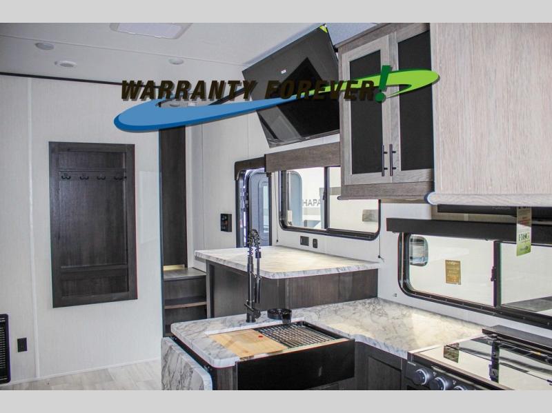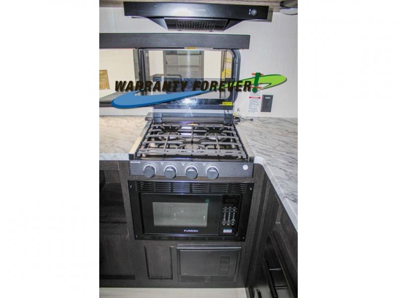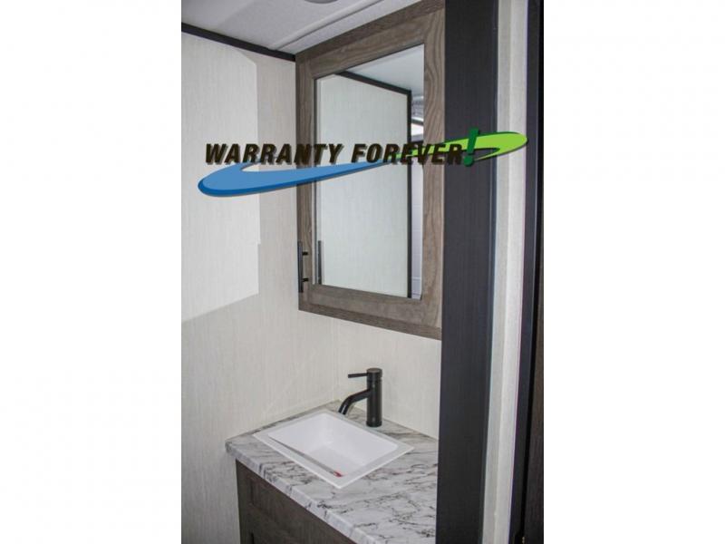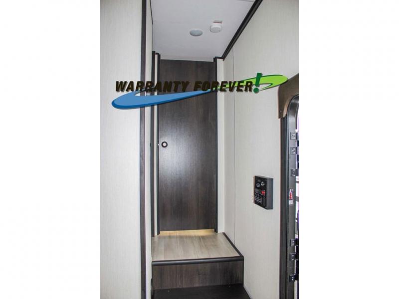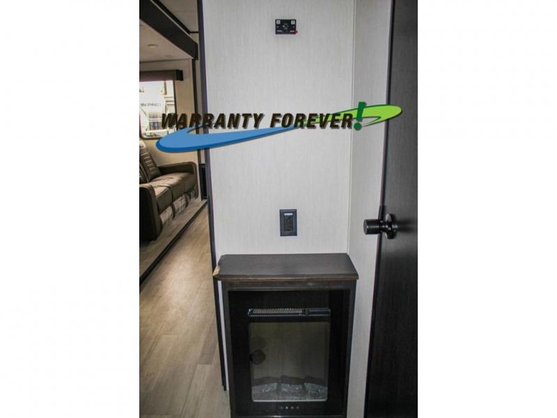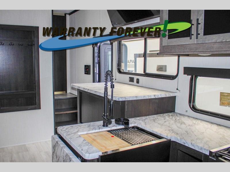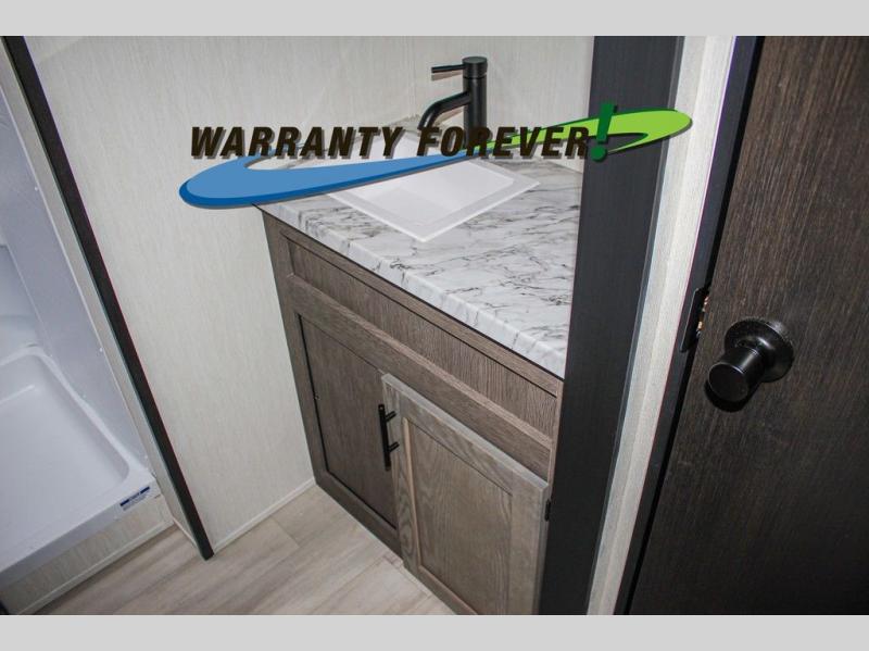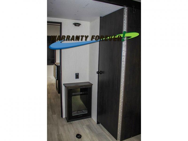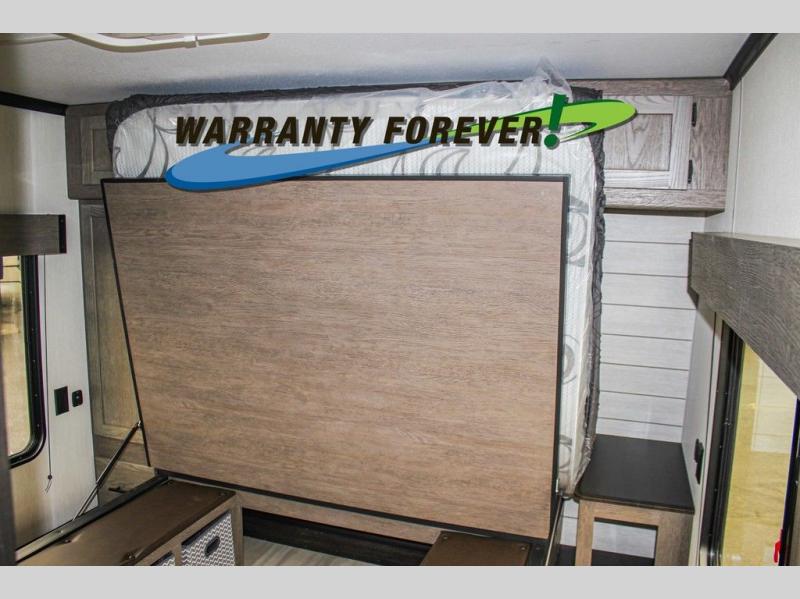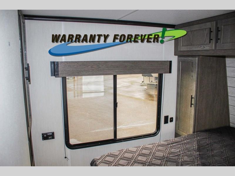 Fun at the campground begins with this dual entry toy hauler in tow! There is a 15' 6" separate garage with glass patio doors, a loft above for guests, a half bath with folding walls and a flip-down recessed bath sink. The combined kitchen and living room features a U-shaped kitchen with a flip-up countertop, a sofa slide out, and a bartop with two stools. There is even an outdoor kitchen on the other side of this counter so you can make breakfast as the sun comes up. A full bath lets you freshen up after a trail ride, and the front private bedroom gives you your own space at night. This unit also features washer and dryer prep in the bedroom so you can add those appliances if you wish!