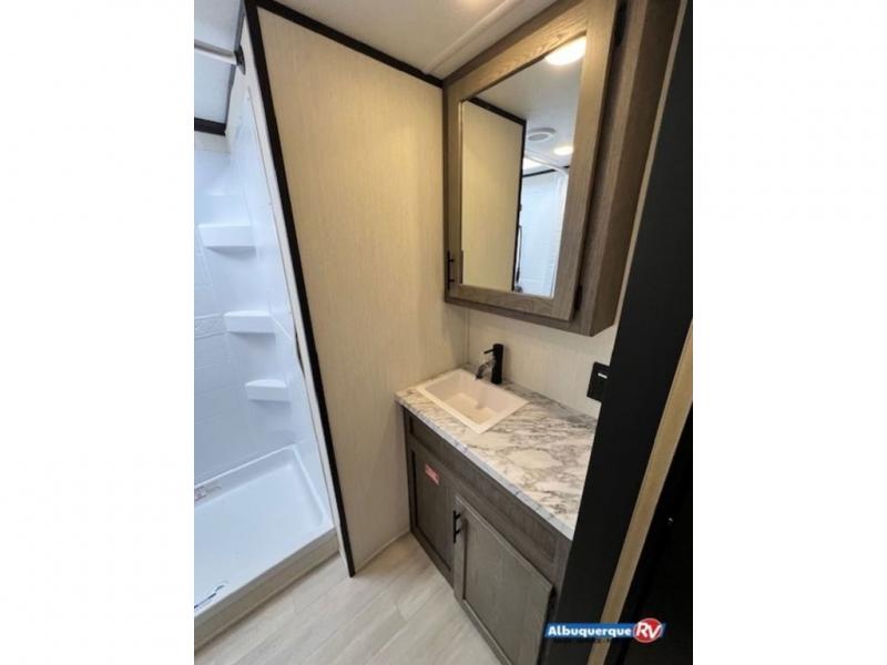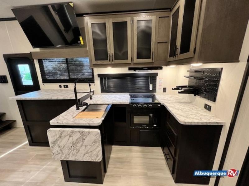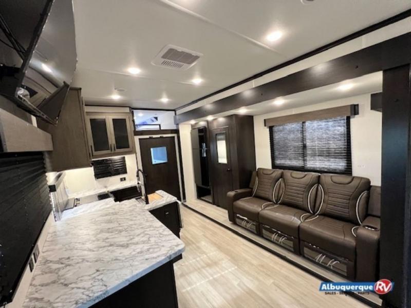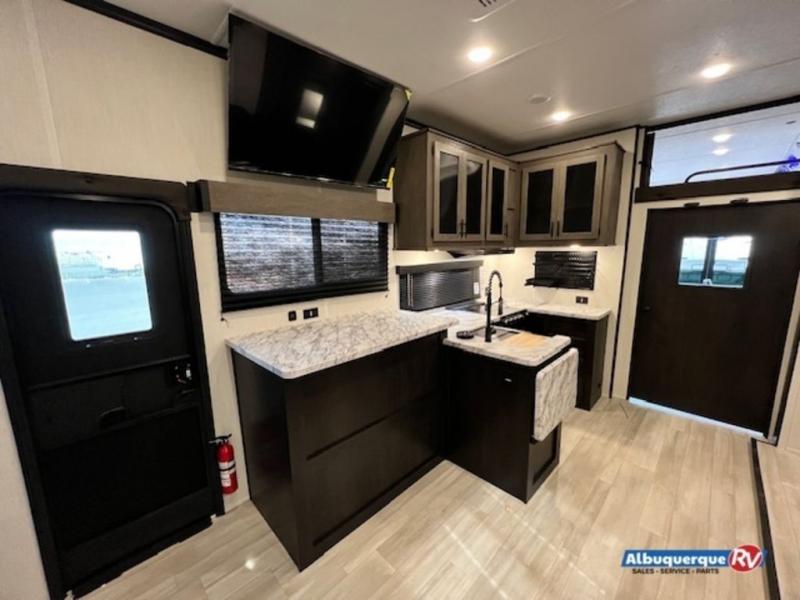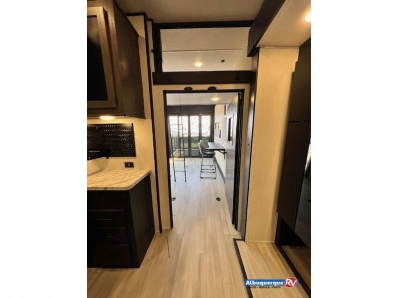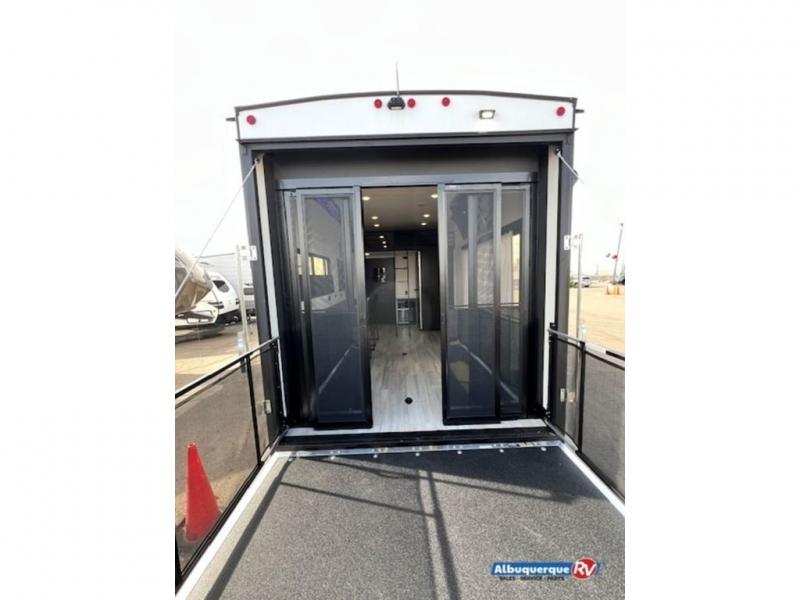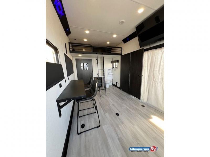 Fun at the campground begins with this dual entry toy hauler in tow! There is a 15' 6" separate garage with glass patio doors, a loft above for guests, a half bath with folding walls and a flip-down recessed bath sink. The combined kitchen and living room features a U-shaped kitchen with a flip-up countertop, a sofa slide out, and a bartop with two stools. There is even an outdoor kitchen on the other side of this counter so you can make breakfast as the sun comes up. A full bath lets you freshen up after a trail ride, and the front private bedroom gives you your own space at night. This unit also features washer and dryer prep in the bedroom so you can add those appliances if you wish!