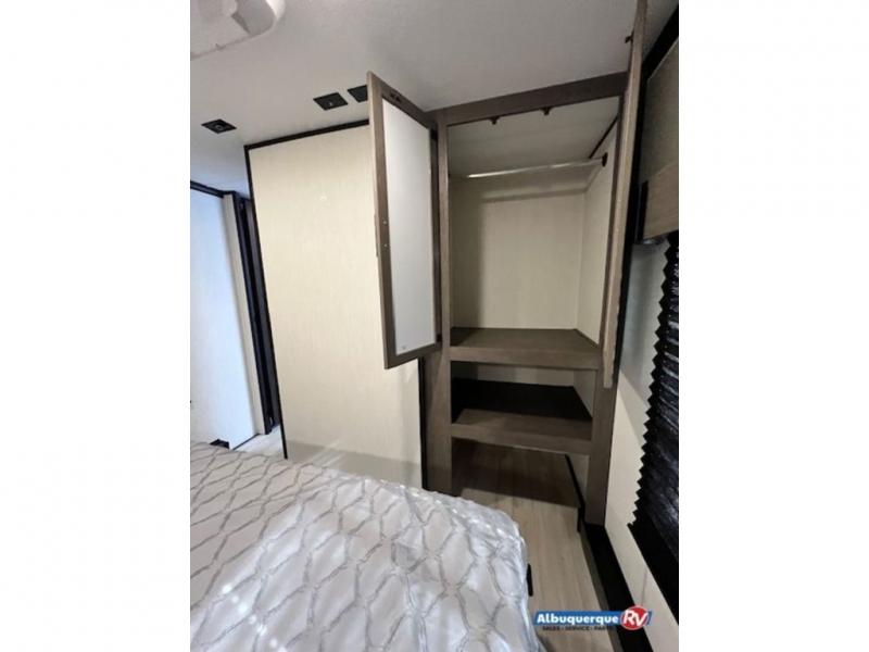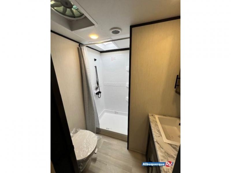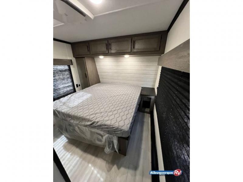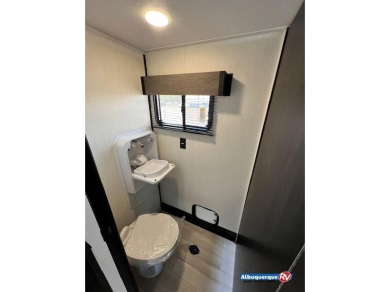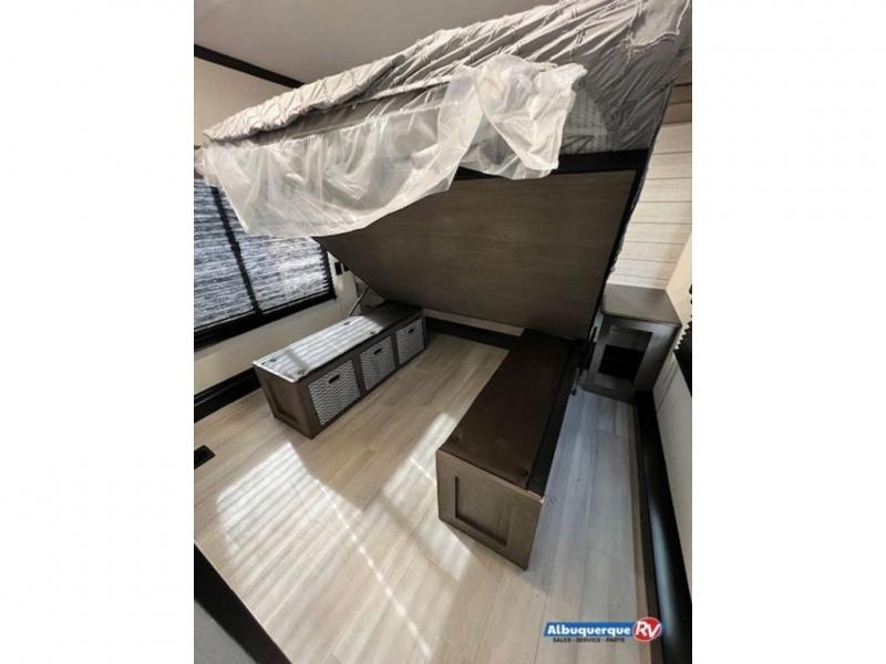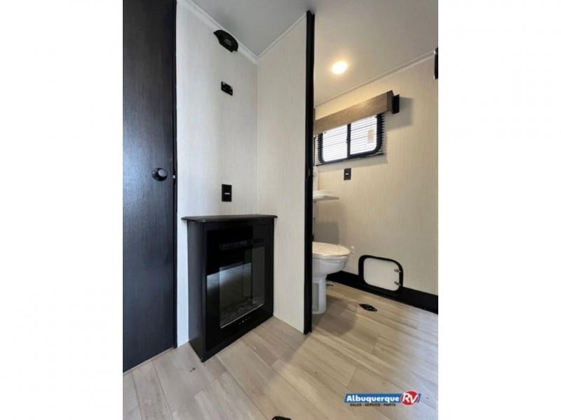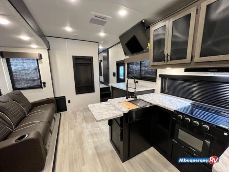 Fun at the campground begins with this dual entry toy hauler in tow! There is a 15' 6" separate garage with glass patio doors, a loft above for guests, a half bath with folding walls and a flip-down recessed bath sink. The combined kitchen and living room features a U-shaped kitchen with a flip-up countertop, a sofa slide out, and a bartop with two stools. There is even an outdoor kitchen on the other side of this counter so you can make breakfast as the sun comes up. A full bath lets you freshen up after a trail ride, and the front private bedroom gives you your own space at night. This unit also features washer and dryer prep in the bedroom so you can add those appliances if you wish!