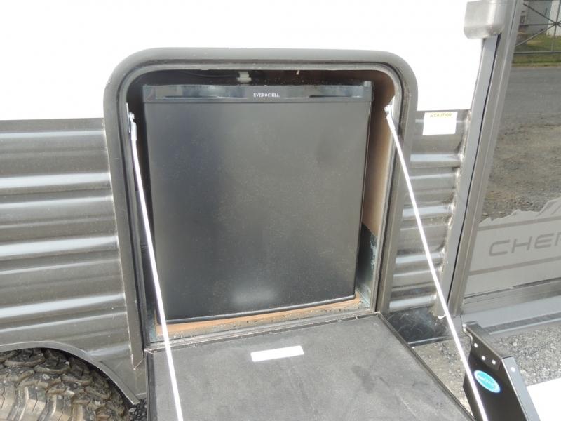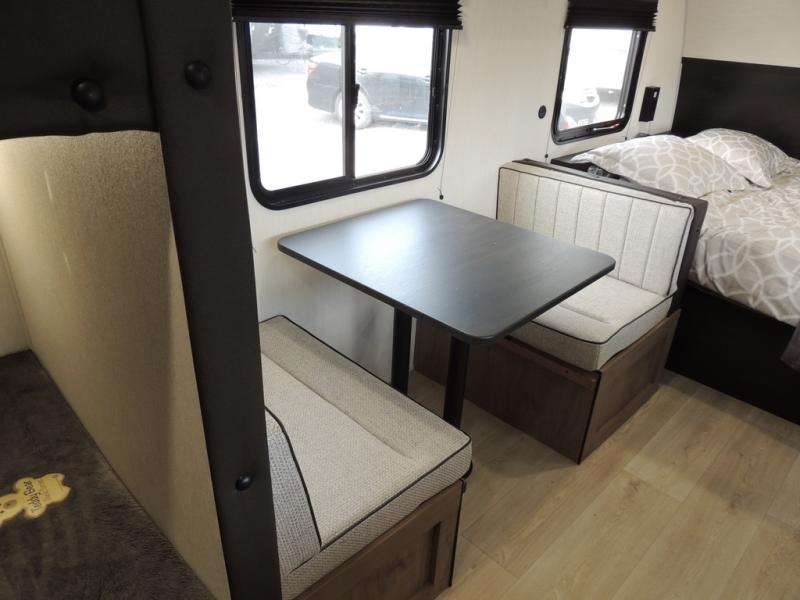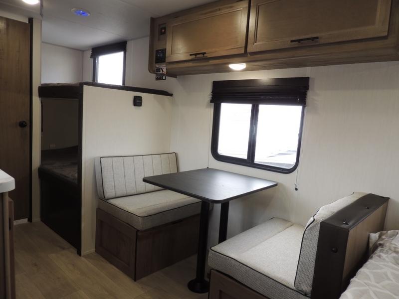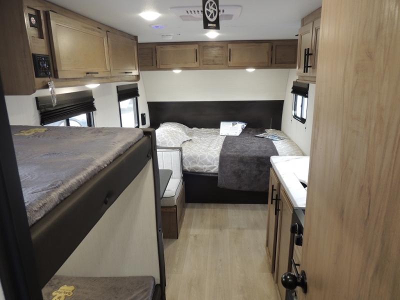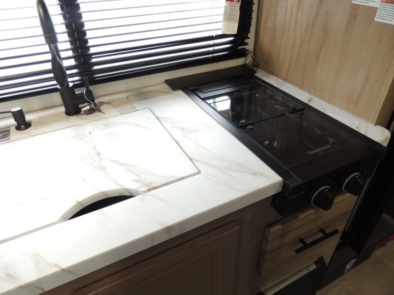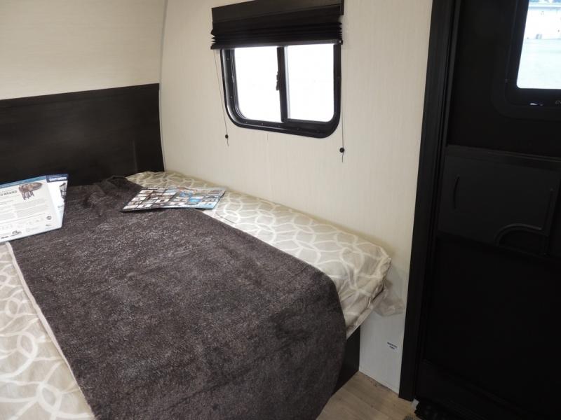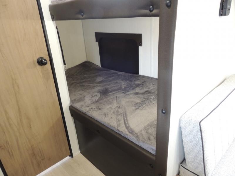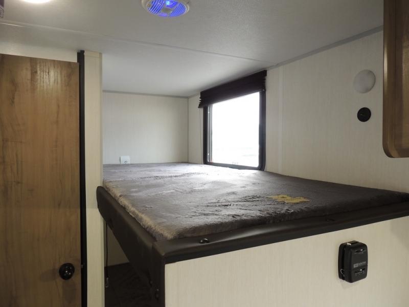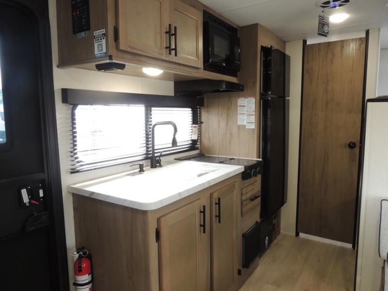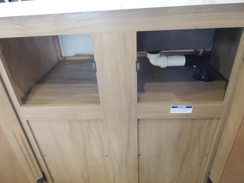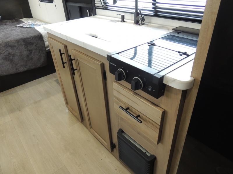 The whole family can sleep comfortably in this travel trailer! It has a set of bunk beds for the kids to sleep on, and you can sleep comfortably on the front queen bed with overhead cabinets and a shelf. There is even an exterior storage plus door that accesses the storage space under the bottom bunk. The chef will enjoy preparing their best home cooked meals either indoors with the high output cooktop or at the outside mini kitchen while staying protected by the 12' power awning!