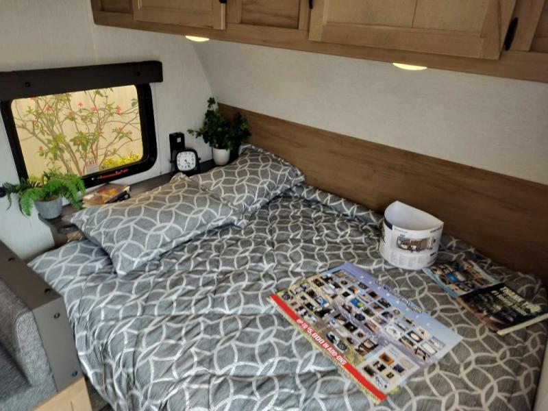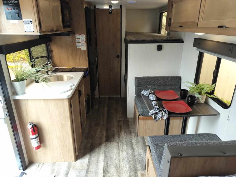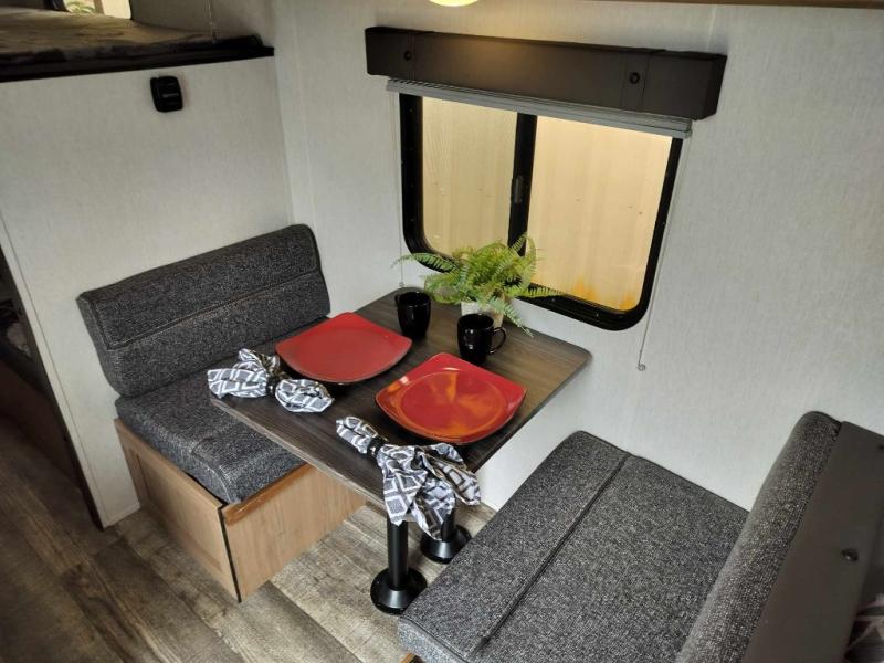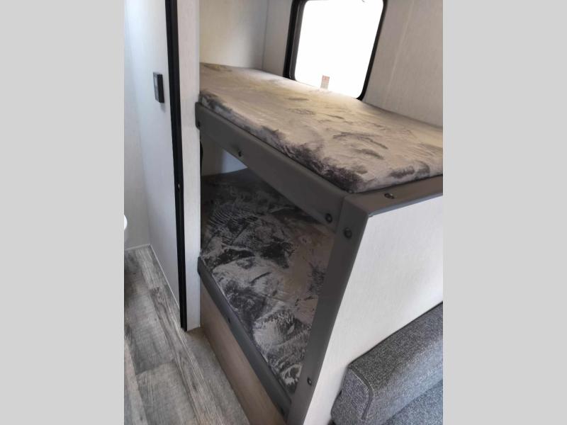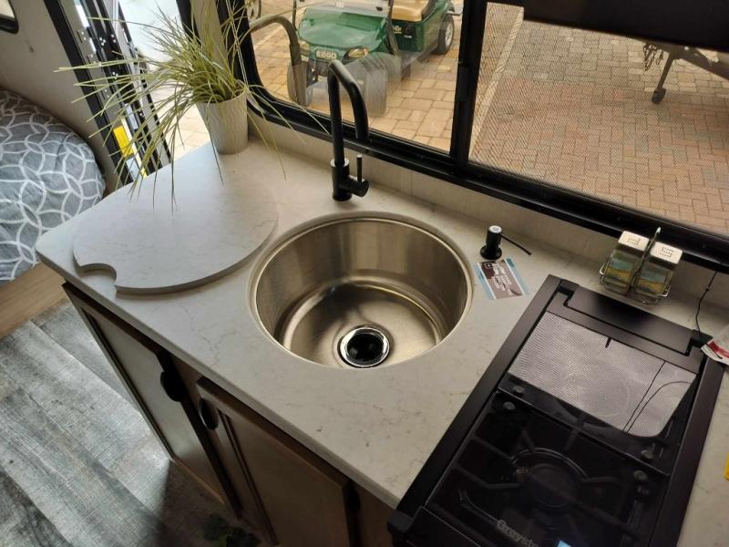 The whole family can sleep comfortably in this travel trailer! It has a set of bunk beds for the kids to sleep on, and you can sleep comfortably on the front queen bed with overhead cabinets and a shelf. There is even an exterior storage plus door that accesses the storage space under the bottom bunk. The chef will enjoy preparing their best home cooked meals either indoors with the high output cooktop or at the outside mini kitchen while staying protected by the 12' power awning!