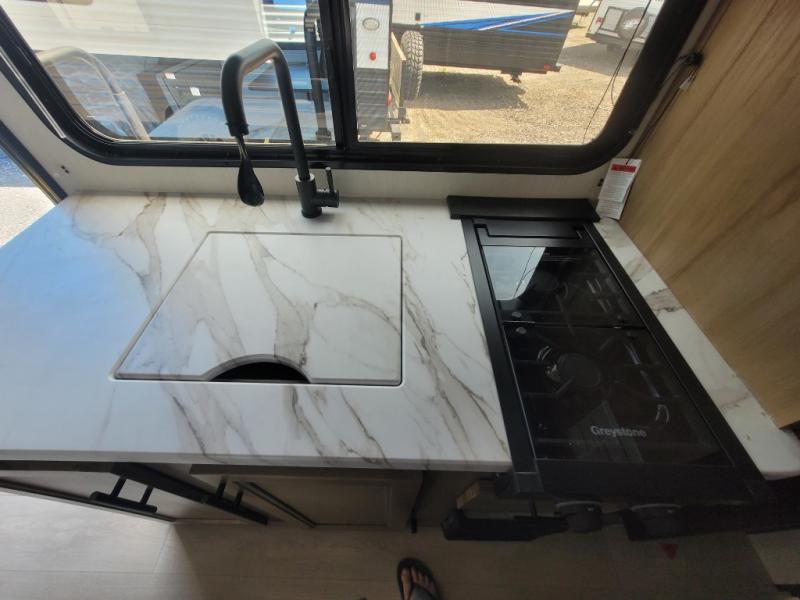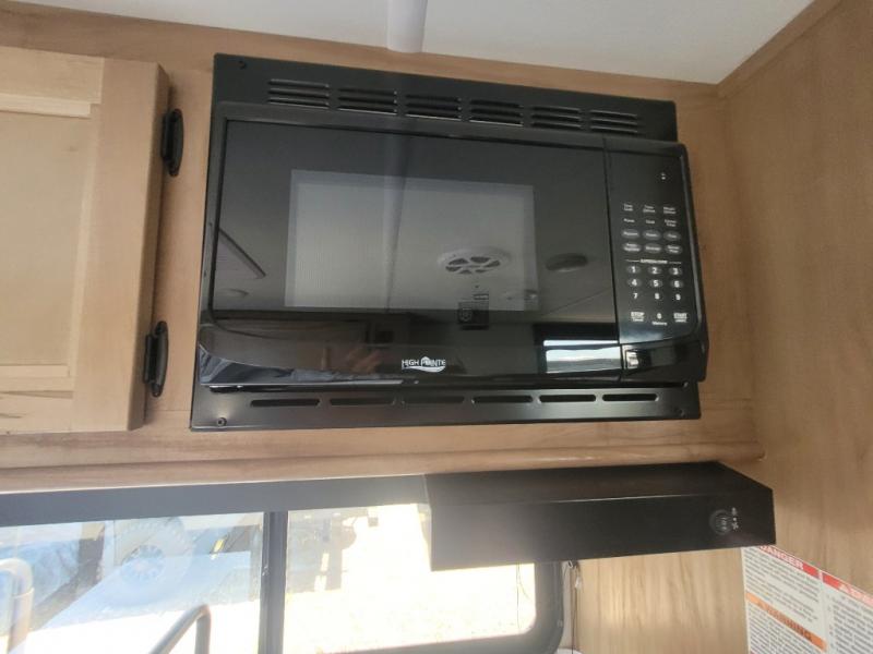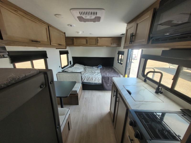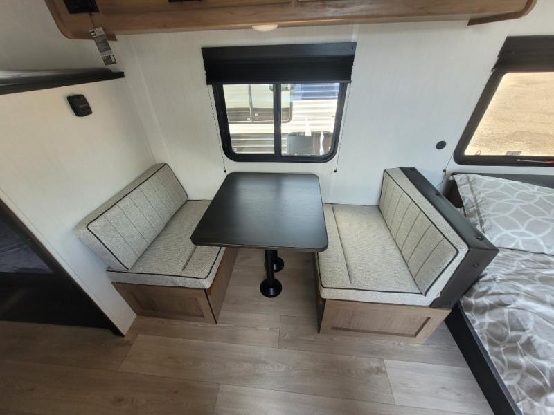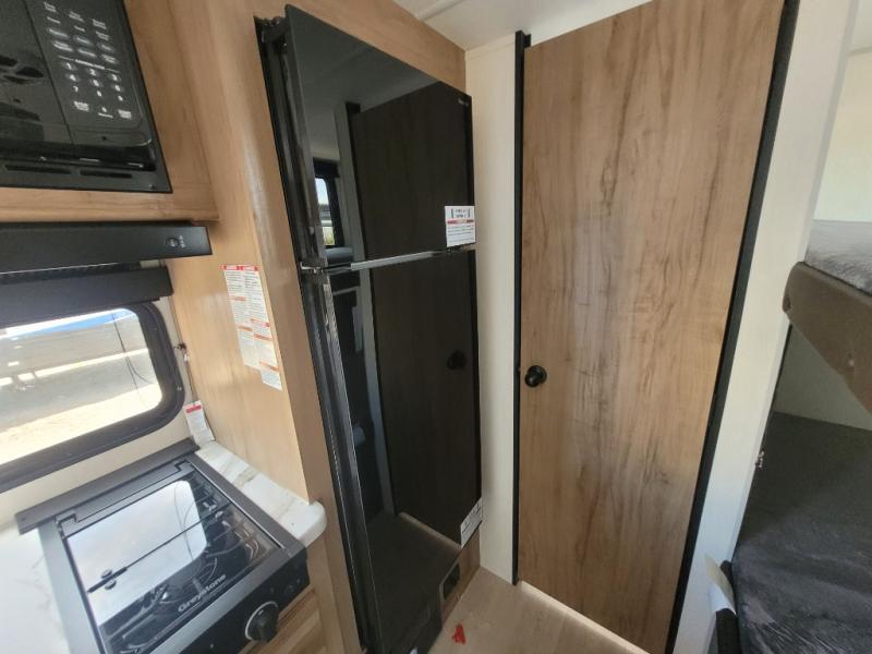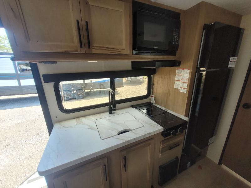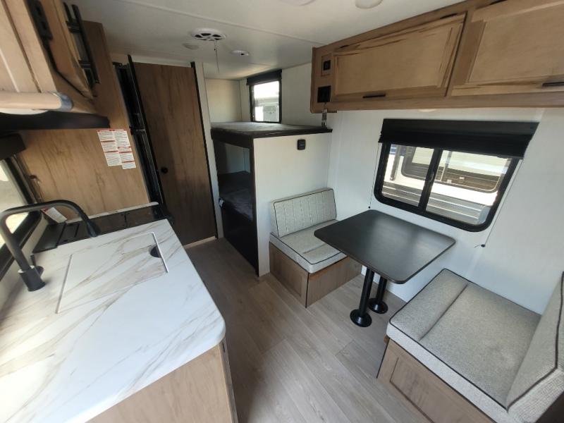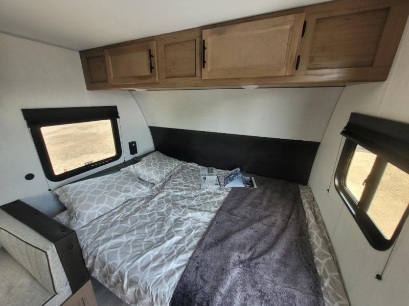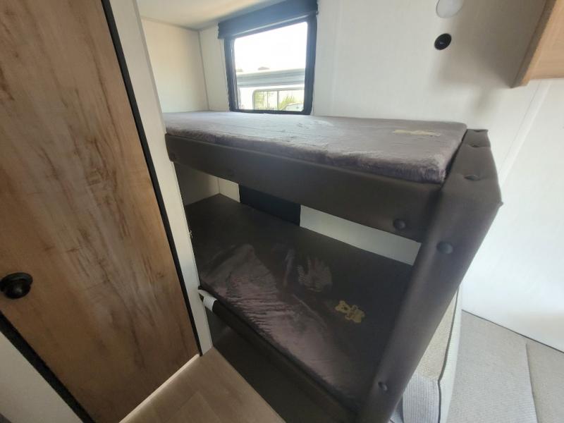 The whole family can sleep comfortably in this travel trailer! It has a set of bunk beds for the kids to sleep on, and you can sleep comfortably on the front queen bed with overhead cabinets and a shelf. There is even an exterior storage plus door that accesses the storage space under the bottom bunk. The chef will enjoy preparing their best home cooked meals either indoors with the high output cooktop or at the outside mini kitchen while staying protected by the 12' power awning!