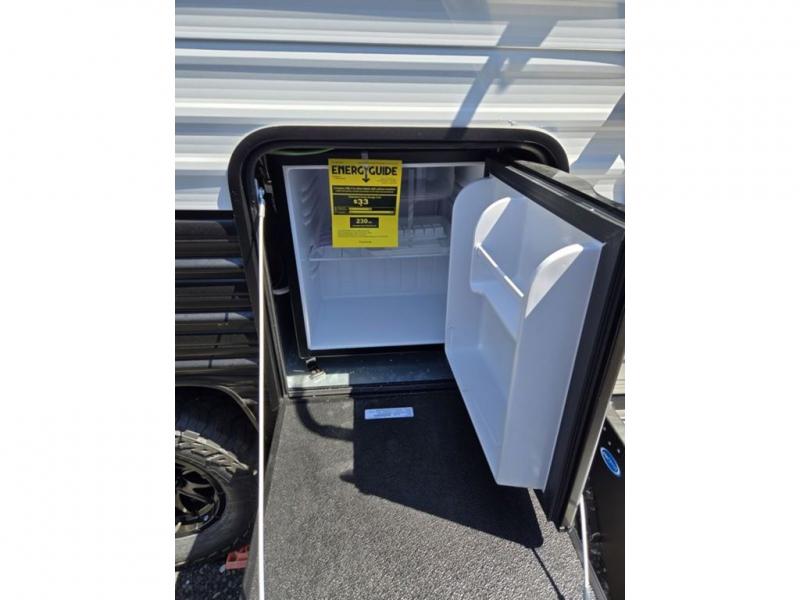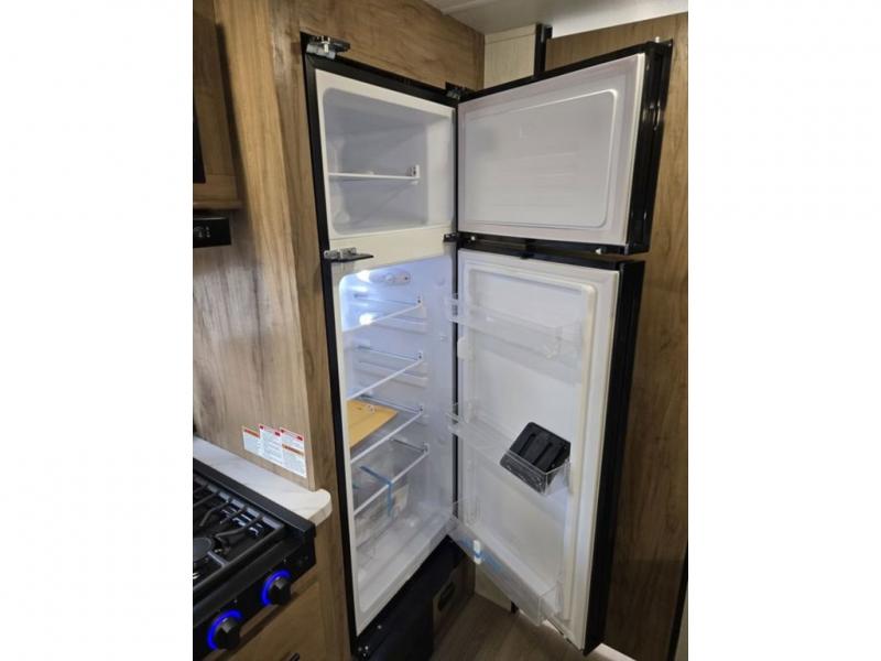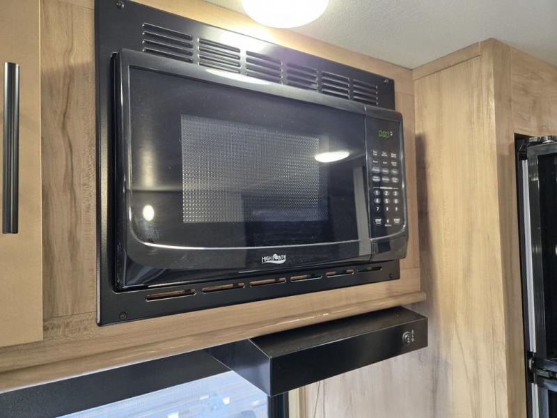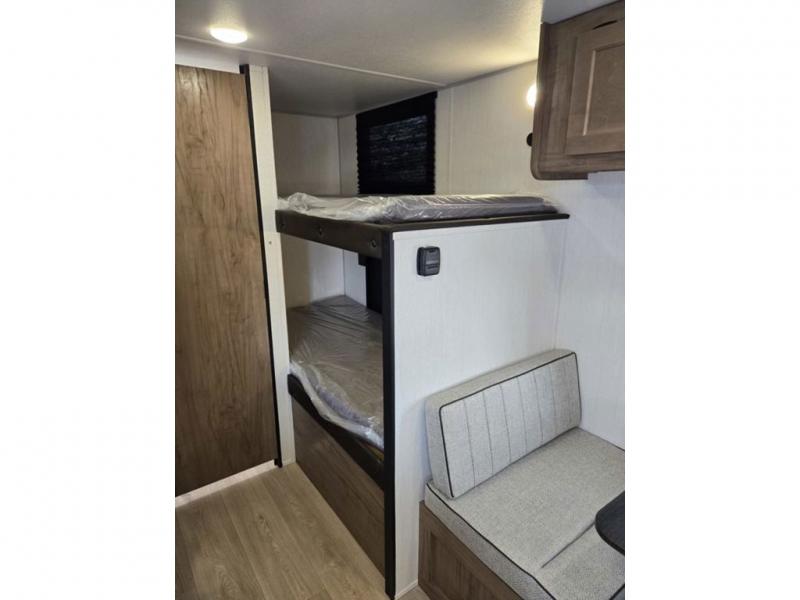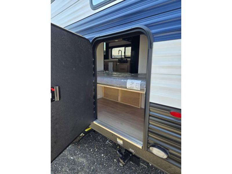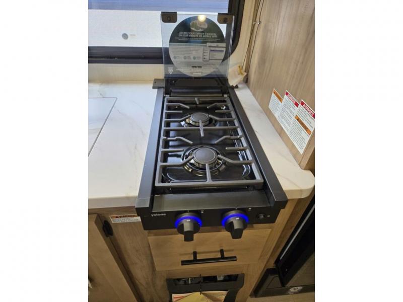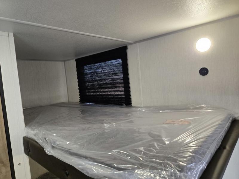 The whole family can sleep comfortably in this travel trailer! It has a set of bunk beds for the kids to sleep on, and you can sleep comfortably on the front queen bed with overhead cabinets and a shelf. There is even an exterior storage plus door that accesses the storage space under the bottom bunk. The chef will enjoy preparing their best home cooked meals either indoors with the high output cooktop or at the outside mini kitchen while staying protected by the 12' power awning!