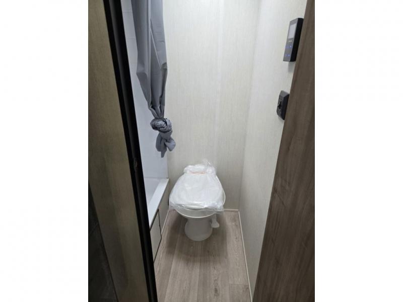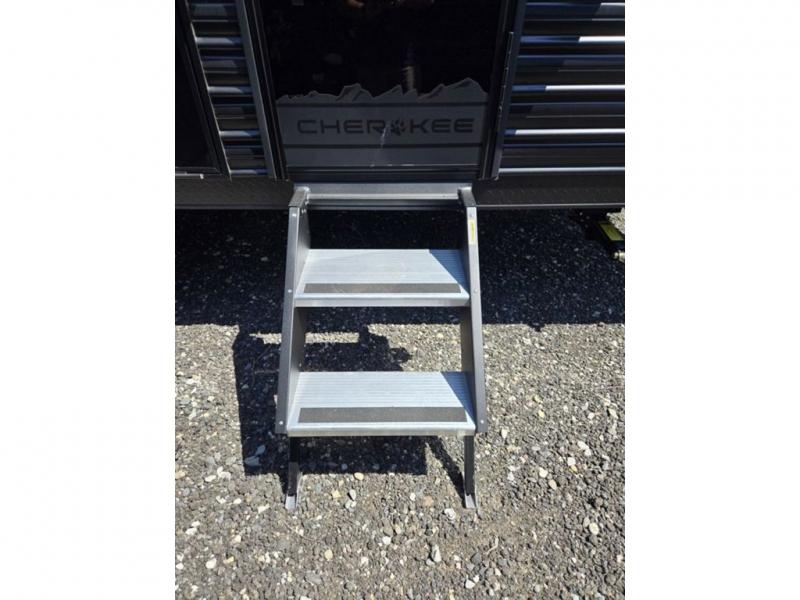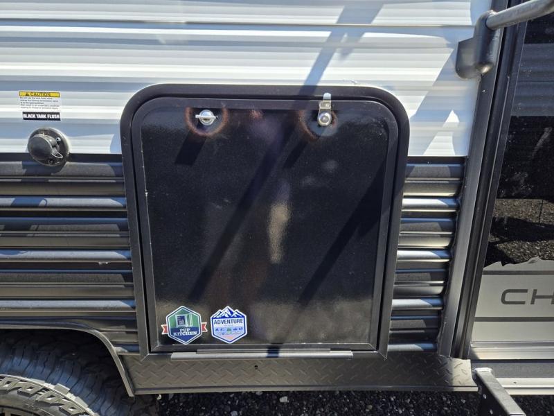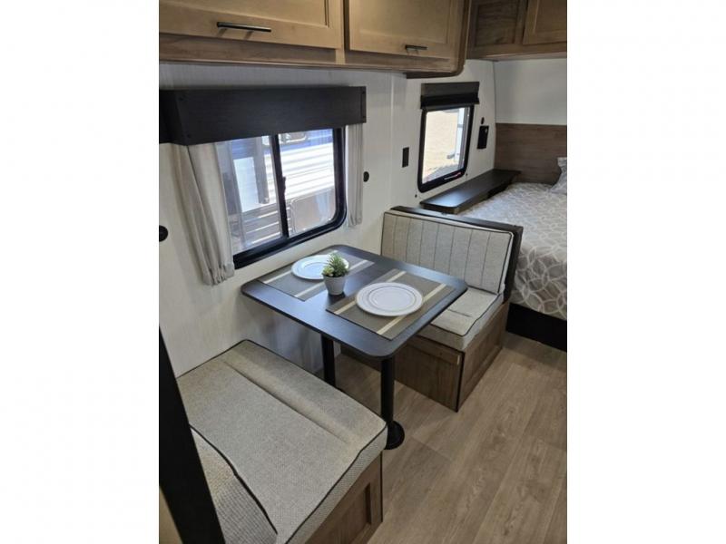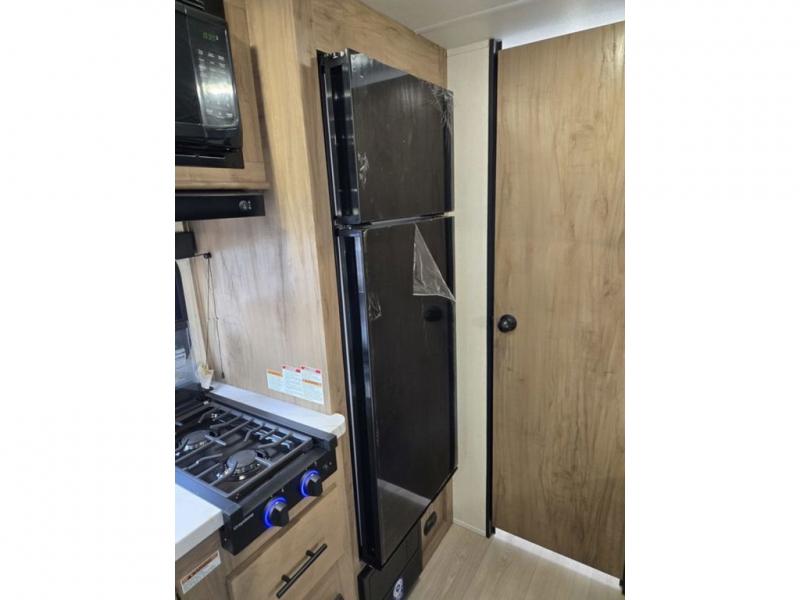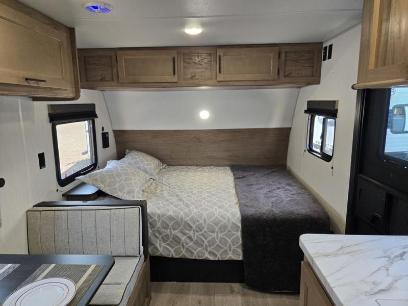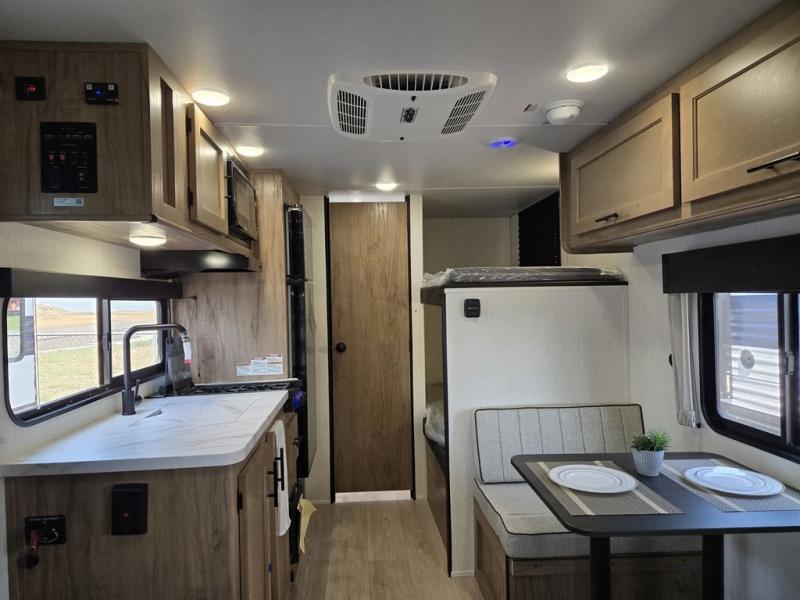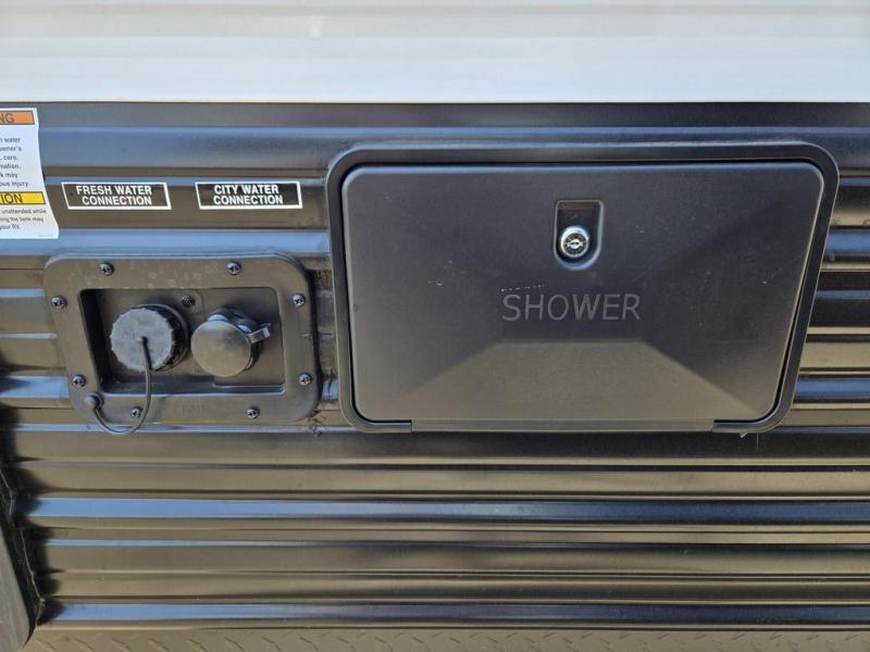 The whole family can sleep comfortably in this travel trailer! It has a set of bunk beds for the kids to sleep on, and you can sleep comfortably on the front queen bed with overhead cabinets and a shelf. There is even an exterior storage plus door that accesses the storage space under the bottom bunk. The chef will enjoy preparing their best home cooked meals either indoors with the high output cooktop or at the outside mini kitchen while staying protected by the 12' power awning!