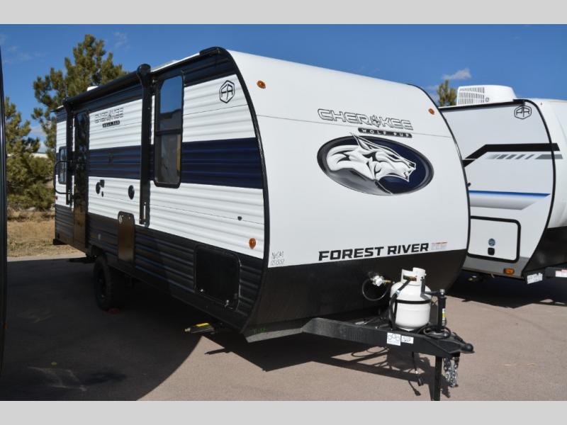 Each one of these Forest River Cherokee Wolf Pup travel trailers are lightweight and easy to tow! They are fully self contained with ample tank capacities, an abundance of storage space, and filled with at home amenities. The aerodynamic smooth radius front profile, the Power Gear frame technology, and the space saver rail design make them easier to maneuver. You will also appreciate the seamless roofing membrane with heat reflectivity to keep the sun from making your unit a hot box. The tongue and groove plywood flooring will hold up for years of fun and the USB charging stations help to keep your electronics at 100% while you're away. Come find the best model for you today!