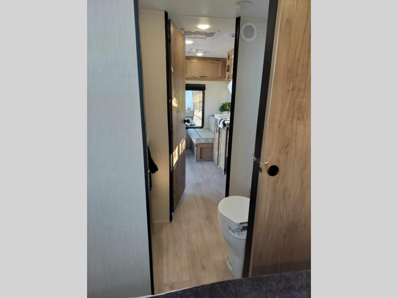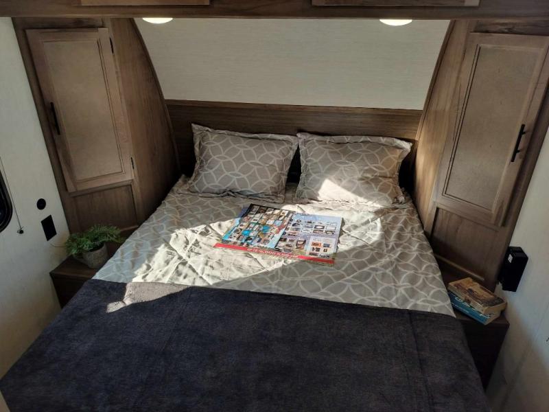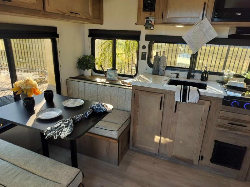 Convenient camping is found with this lightweight travel trailer! Once you arrive at your destination, put out the 15' power awning, then make lunch on the exterior mini kitchen. Inside, you can dine at the booth dinette, freshen up in the tub/shower, and sleep soundly on the queen bed in the master bedroom. And you're sure to find plenty of storage spaces both inside and outside, including a rear storage rack!