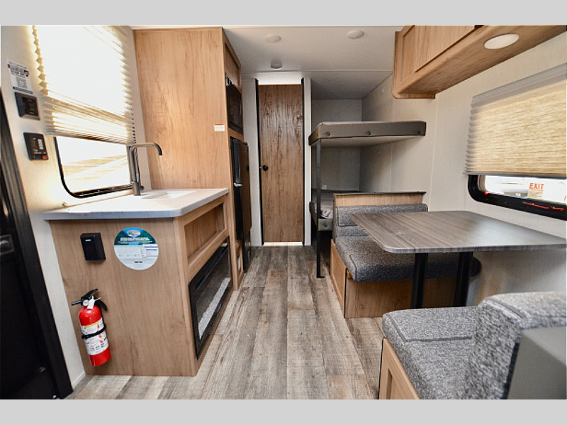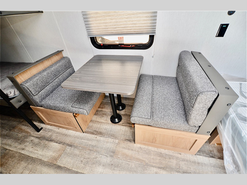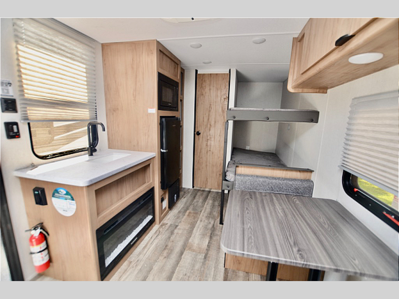 Step inside and you’ll immediately notice how bright and open this RV feels. The thoughtfully designed layout maximizes every inch of space, giving you a comfortable sleeping area, functional kitchenette, and a cozy dinette for meals or game nights. With its all-electric setup, you’ll enjoy quiet operation, reduced emissions, and the ability to power your adventures with clean energy when paired with solar. This means more time off-grid and less time worrying about hookups.