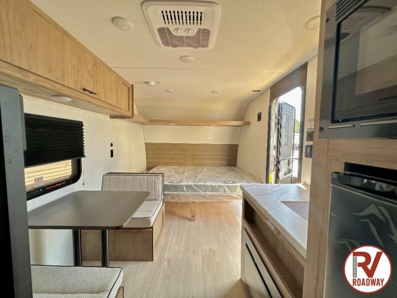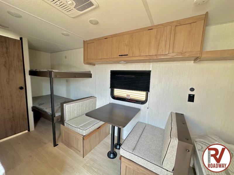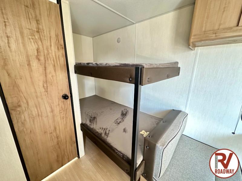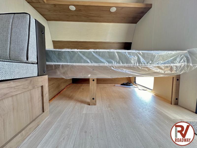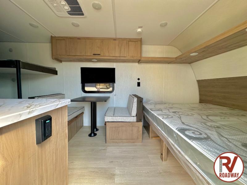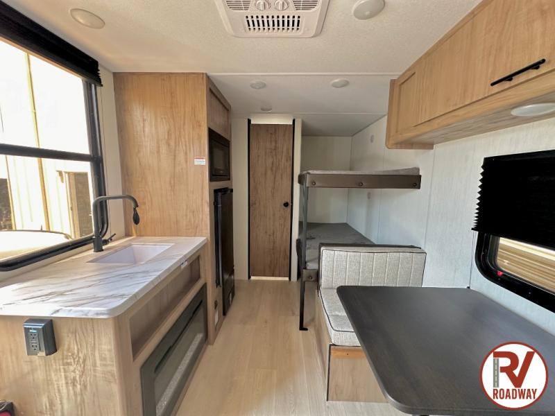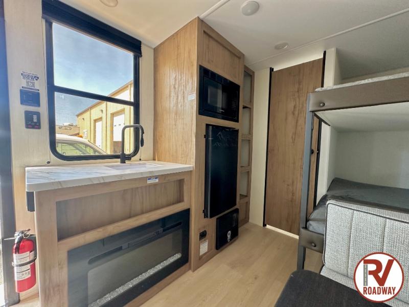 Enjoy family adventures in this all-electric bunk model which features sleeping for four or six depending on size with a queen bed up front, oversized bunks in the rear roadside corner, and you could even convert the booth dinette to sleep more. Inside, you will find ample storage with overhead cabinets and a large shelf above the queen bed, plus four shelves next to the refrigerator and microwave/air fryer that feature decorative storage bins for your things. Use this space for pantry items, towels, or clothing storage. There is even a fireplace below the counter and sink to bring you a bit of heat on those chilly nights. On the outside, you will also find a 12' awning and plenty of outside storage for your camping gear, plus more!