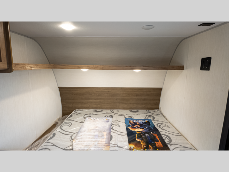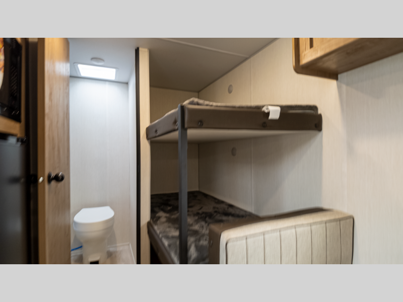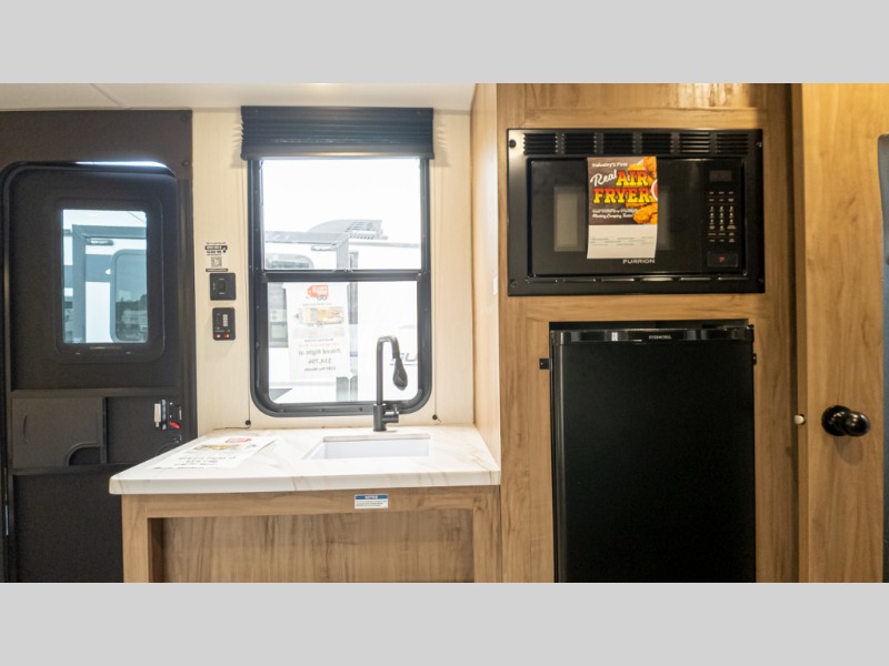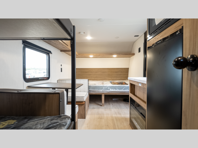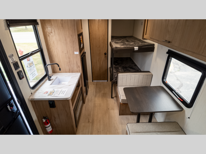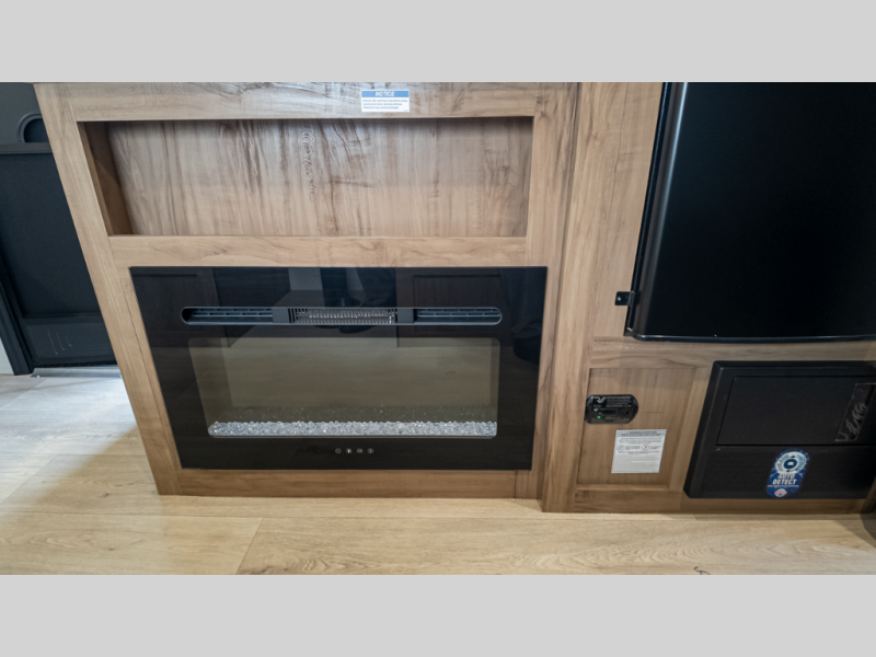 - Special Features: Queen bed, double bunks, all-electric convection microwave/air-fryer oven, 5,000 BTU electric fireplace, solar prep, tankless water heater, dinette conversion