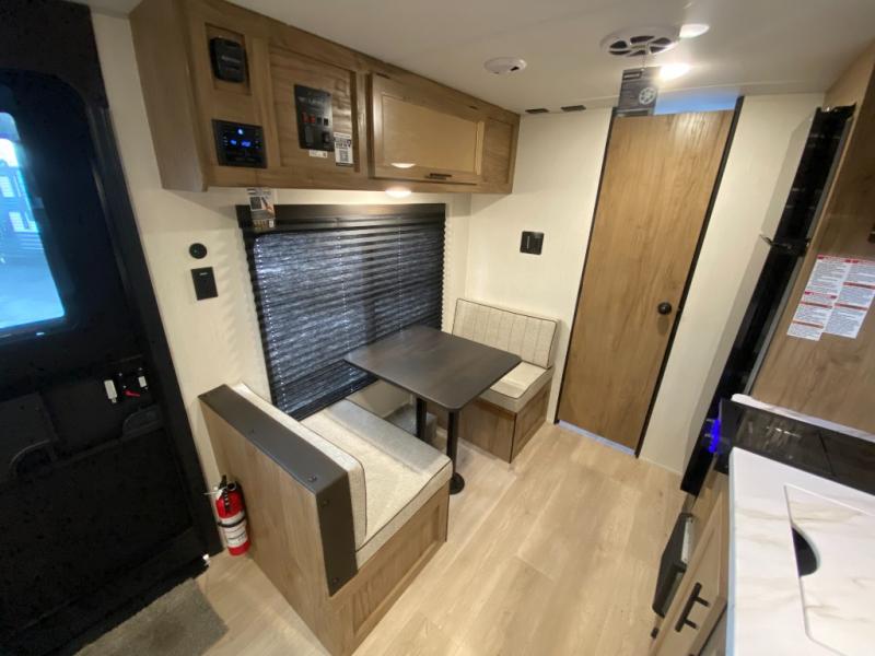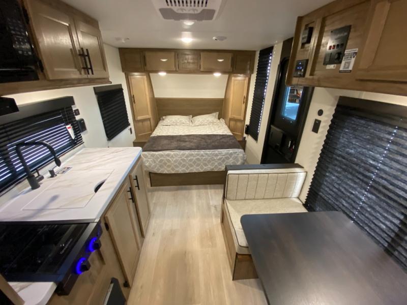 You will love camping in this travel trailer with a front queen bed. Freshen up each morning in the full rear bathroom with the tub/shower, a toilet, and sink. Fill your bellies with the perishables stored in the 12V high efficiency refrigerator and cook them on the high output cooktop then enjoy them at the booth dinette. You could even prepare a meal while breathing in some fresh air at the outside mini kitchen while staying protected by the 12' power awning. Easily store all of your outdoor gear in the outside storage area too!