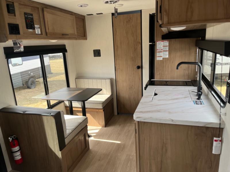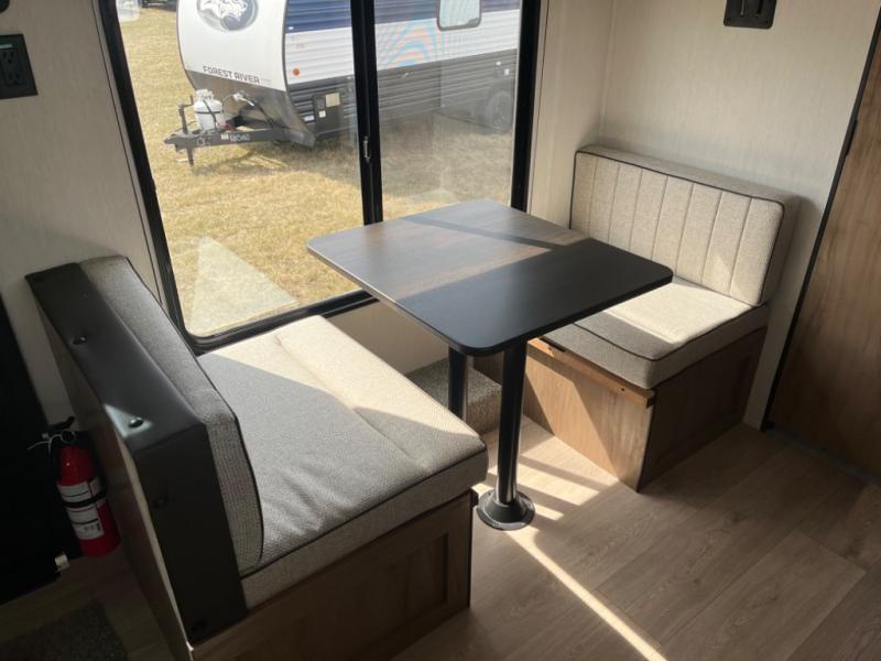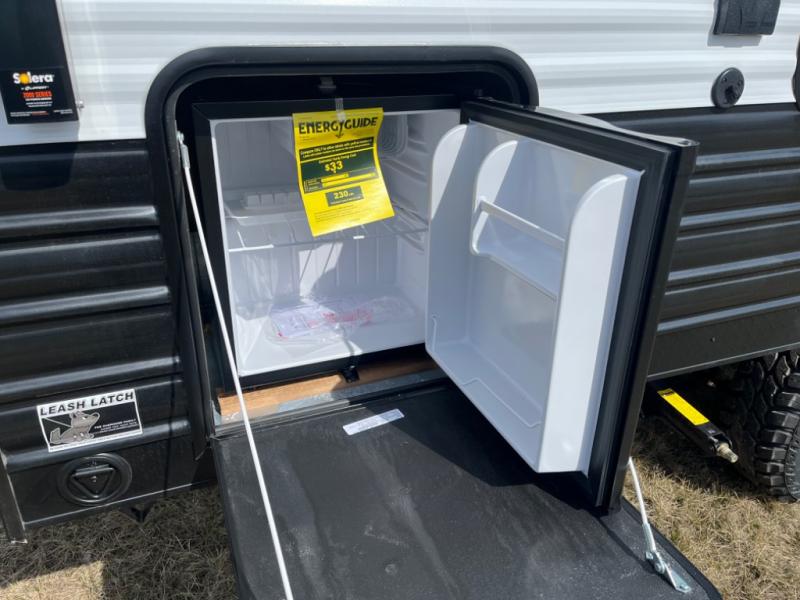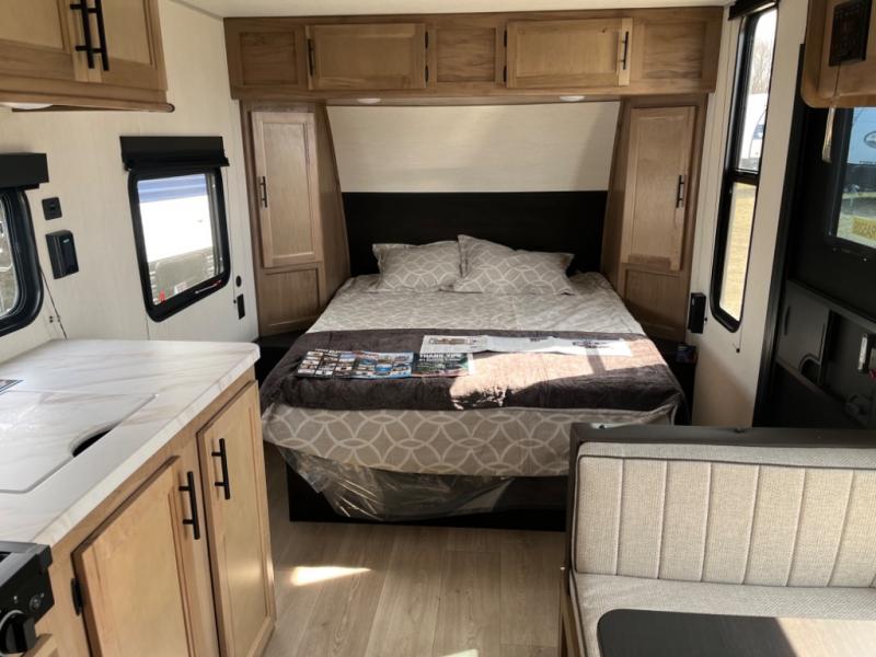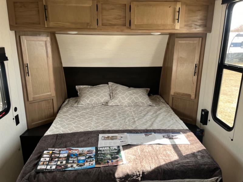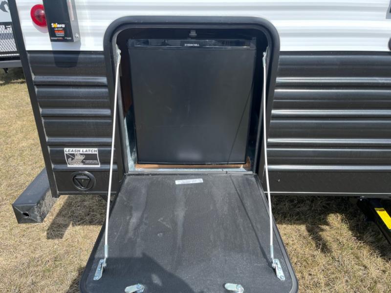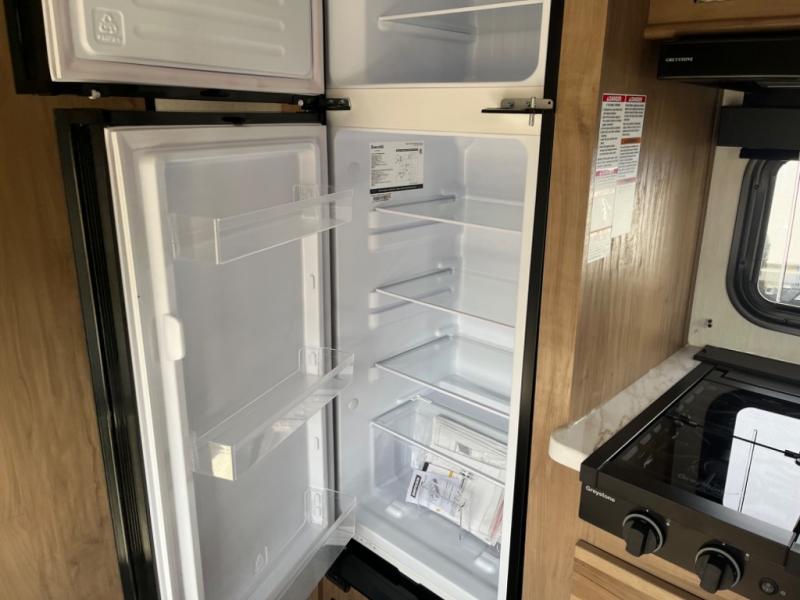 You will love camping in this travel trailer with a front queen bed. Freshen up each morning in the full rear bathroom with the tub/shower, a toilet, and sink. Fill your bellies with the perishables stored in the 12V high efficiency refrigerator and cook them on the high output cooktop then enjoy them at the booth dinette. You could even prepare a meal while breathing in some fresh air at the outside mini kitchen while staying protected by the 12' power awning. Easily store all of your outdoor gear in the outside storage area too!