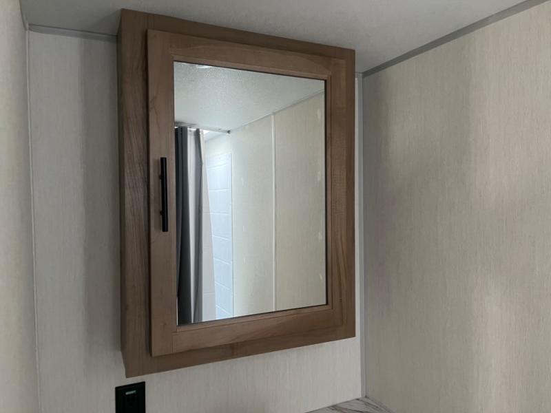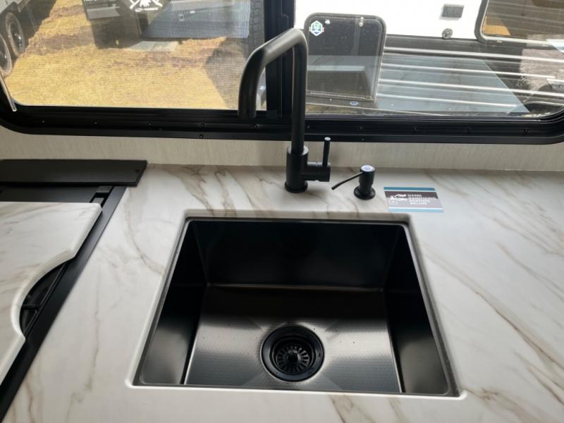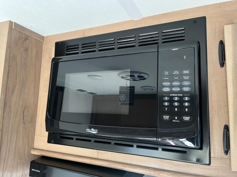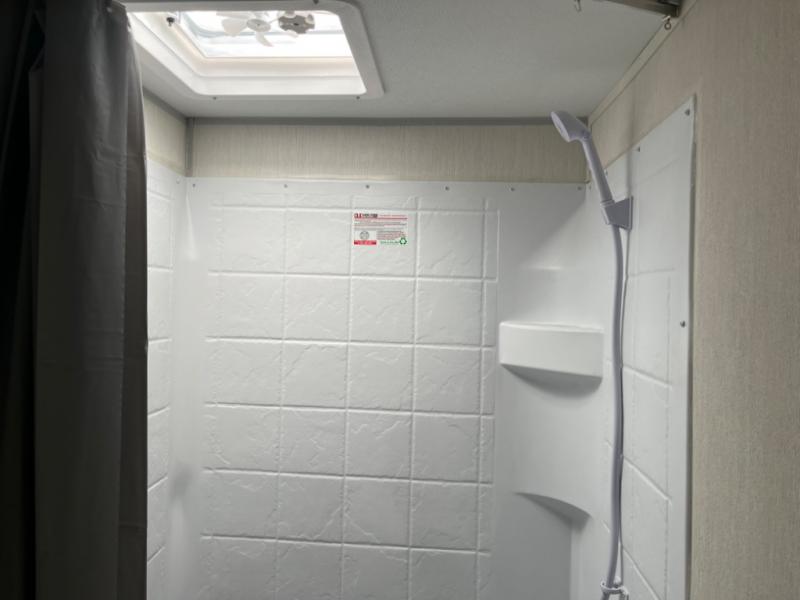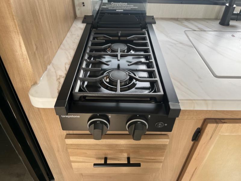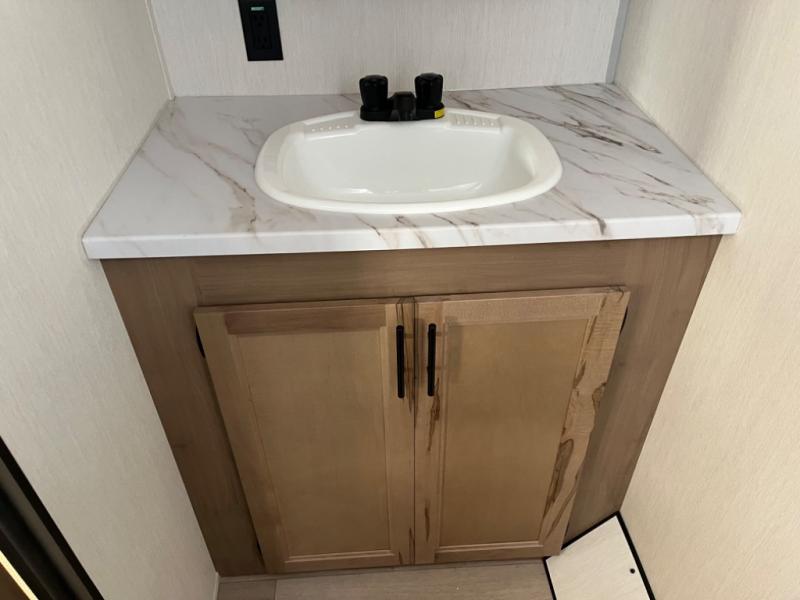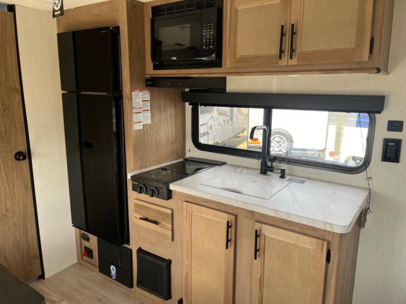 You will love camping in this travel trailer with a front queen bed. Freshen up each morning in the full rear bathroom with the tub/shower, a toilet, and sink. Fill your bellies with the perishables stored in the 12V high efficiency refrigerator and cook them on the high output cooktop then enjoy them at the booth dinette. You could even prepare a meal while breathing in some fresh air at the outside mini kitchen while staying protected by the 12' power awning. Easily store all of your outdoor gear in the outside storage area too!