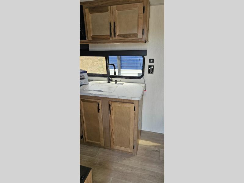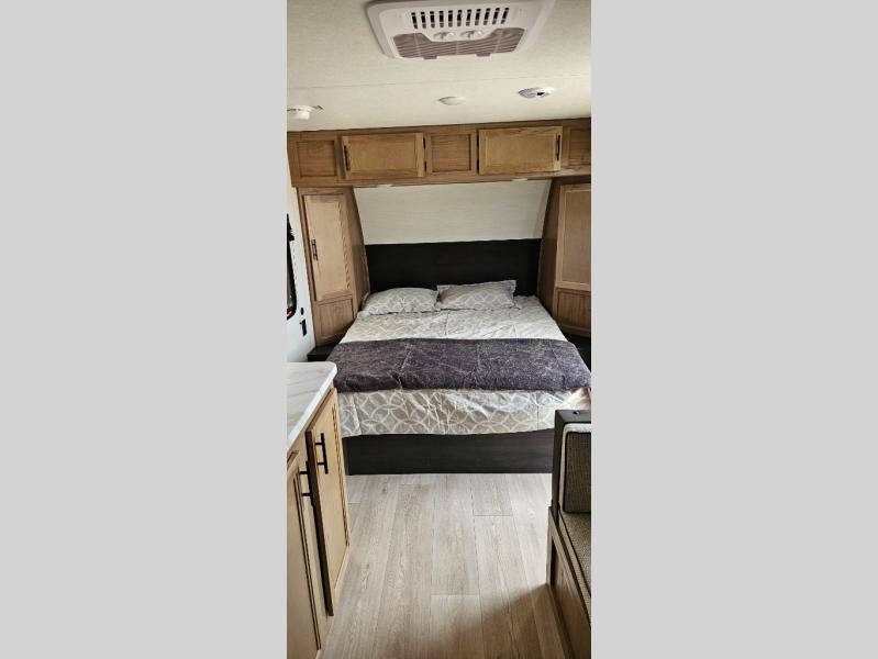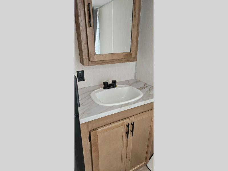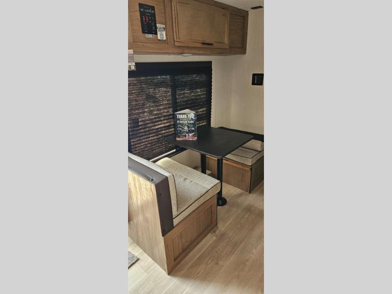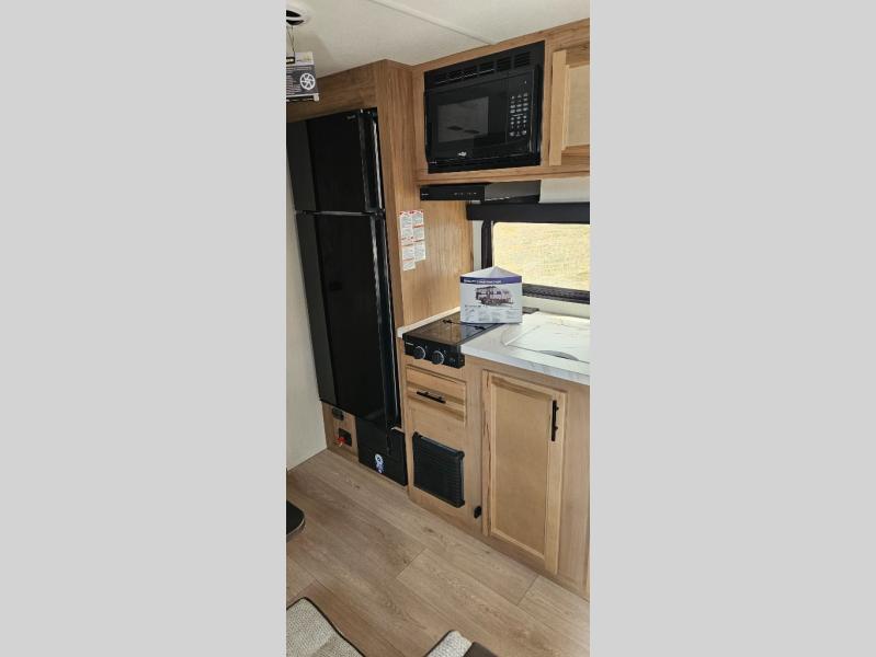You will love camping in this travel trailer with a front queen bed. Freshen up each morning in the full rear bathroom with the tub/shower, a toilet, and sink. Fill your bellies with the perishables stored in the 12V high efficiency refrigerator and cook them on the high output cooktop then enjoy them at the booth dinette. You could even prepare a meal while breathing in some fresh air at the outside mini kitchen while staying protected by the 12' power awning. Easily store all of your outdoor gear in the outside storage area too!