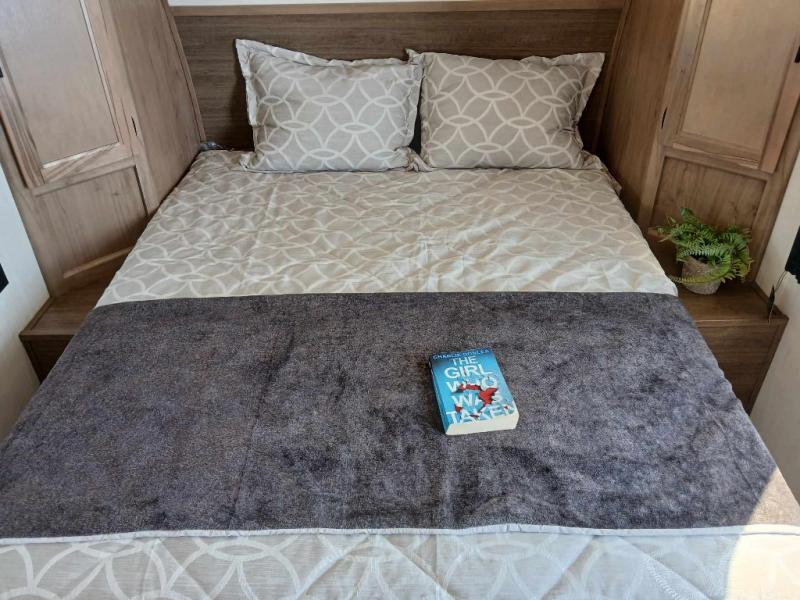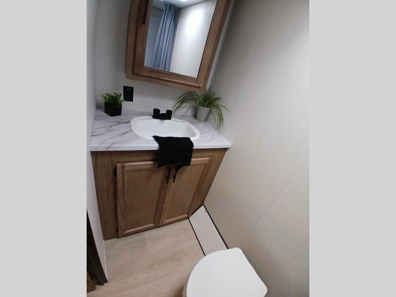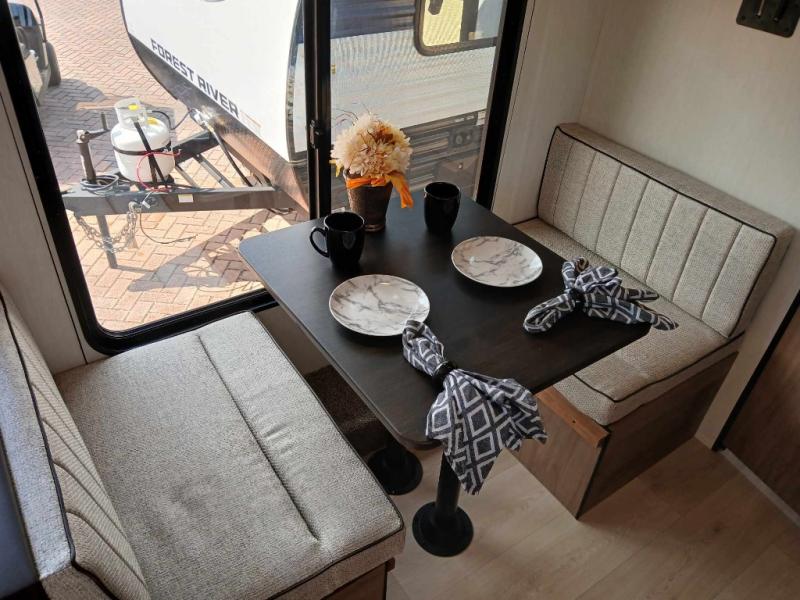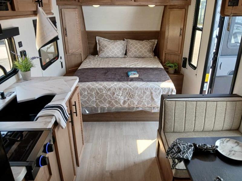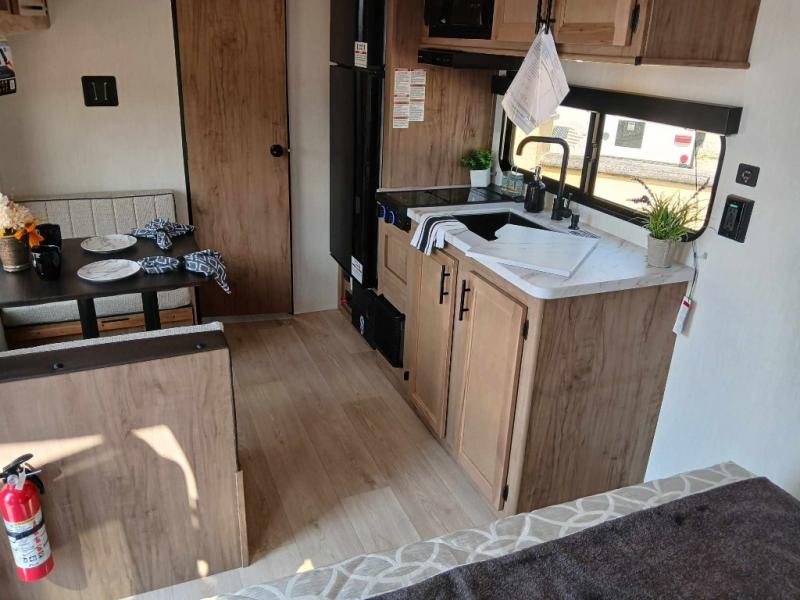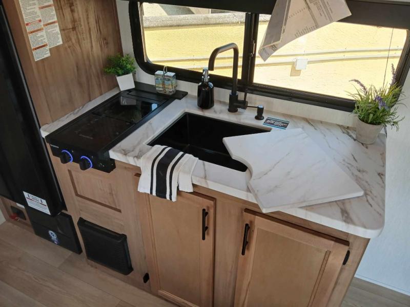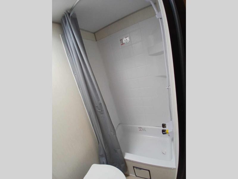 You will love camping in this travel trailer with a front queen bed. Freshen up each morning in the full rear bathroom with the tub/shower, a toilet, and sink. Fill your bellies with the perishables stored in the 12V high efficiency refrigerator and cook them on the high output cooktop then enjoy them at the booth dinette. You could even prepare a meal while breathing in some fresh air at the outside mini kitchen while staying protected by the 12' power awning. Easily store all of your outdoor gear in the outside storage area too!
