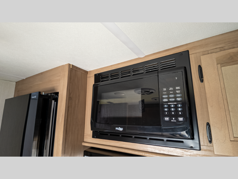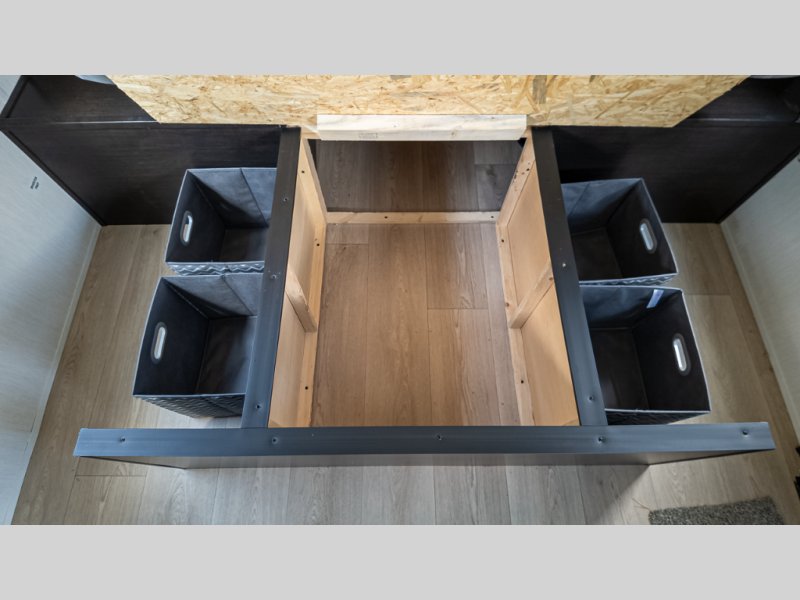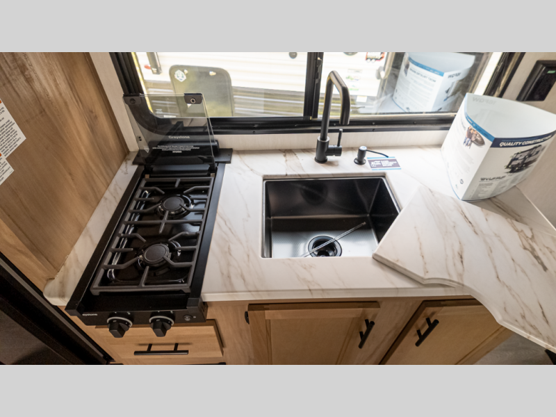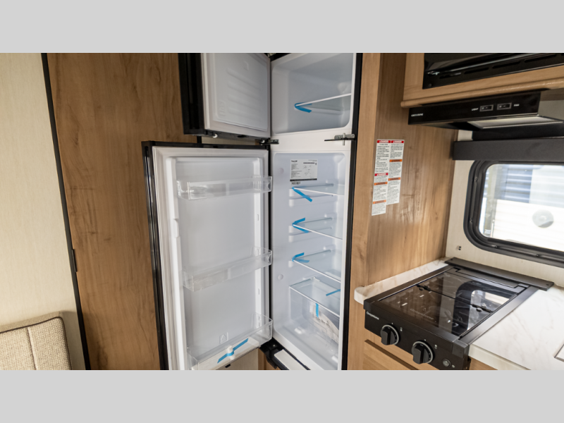 - Kitchen: 11 cu ft 12 V residential fridge, high-output cooktop, outdoor mini-kitchen