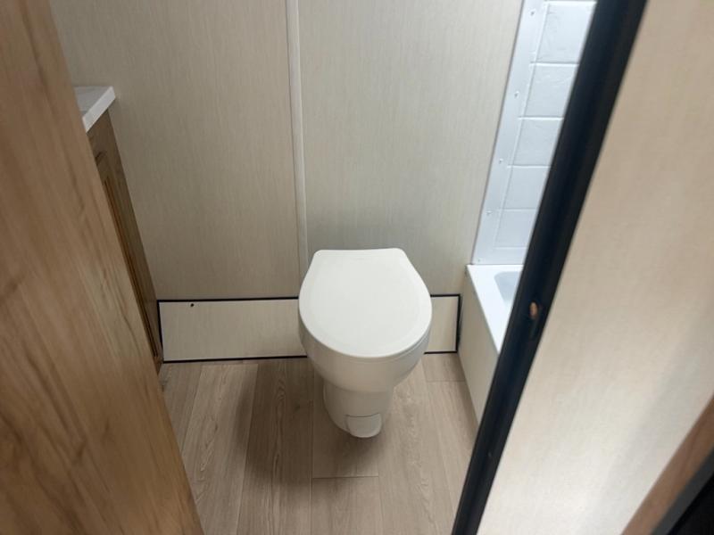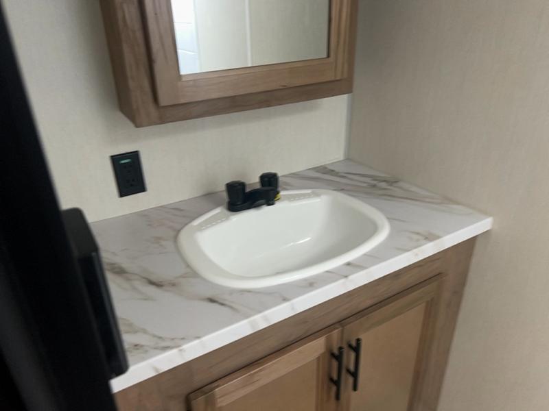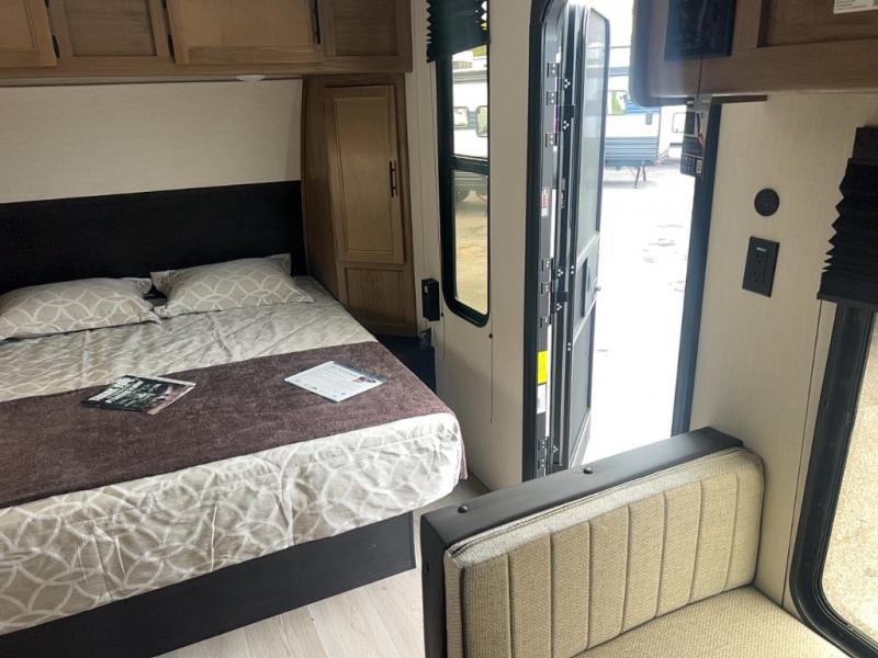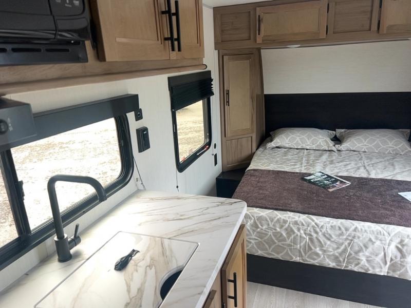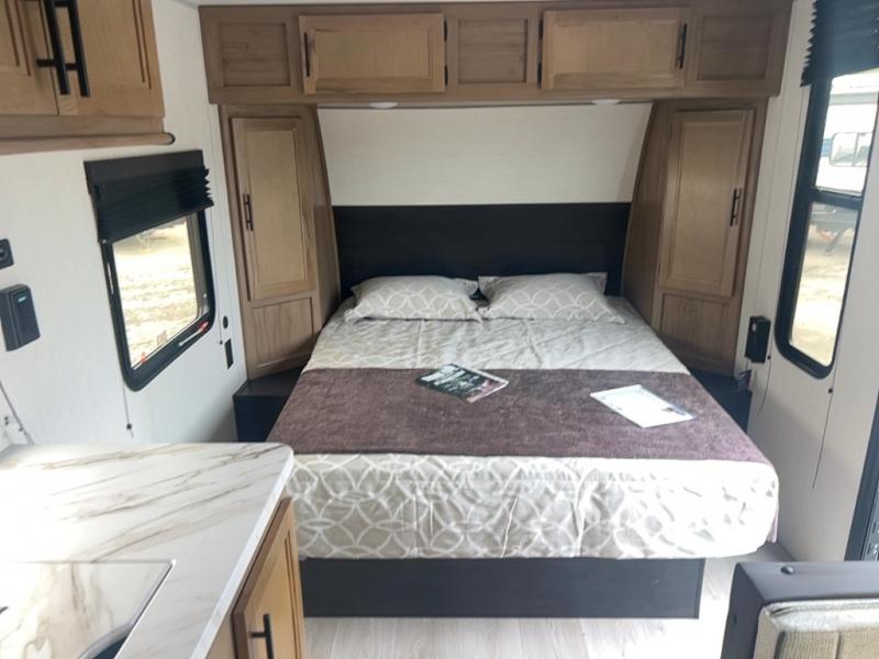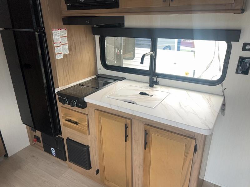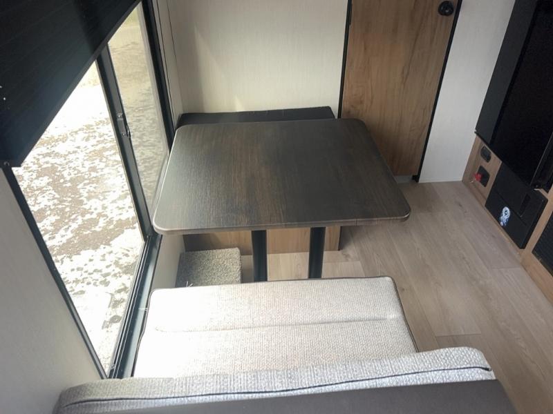 You will love camping in this travel trailer with a front queen bed. Freshen up each morning in the full rear bathroom with the tub/shower, a toilet, and sink. Fill your bellies with the perishables stored in the 12V high efficiency refrigerator and cook them on the high output cooktop then enjoy them at the booth dinette. You could even prepare a meal while breathing in some fresh air at the outside mini kitchen while staying protected by the 12' power awning. Easily store all of your outdoor gear in the outside storage area too!