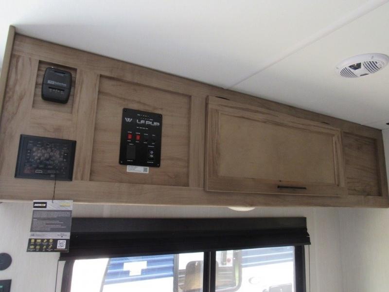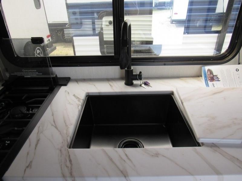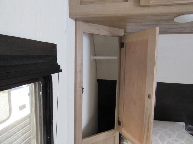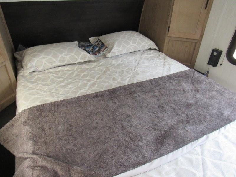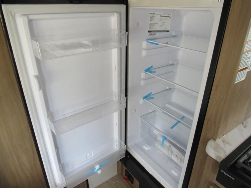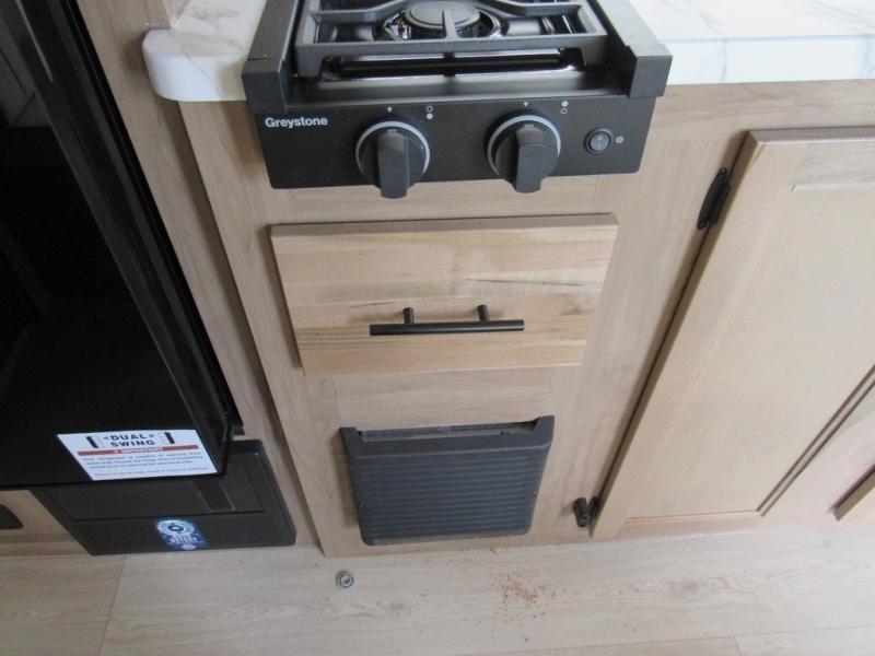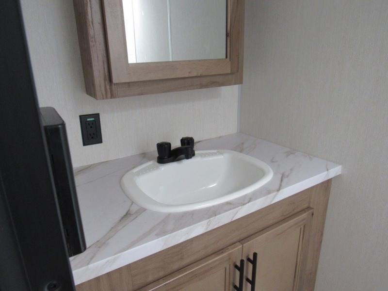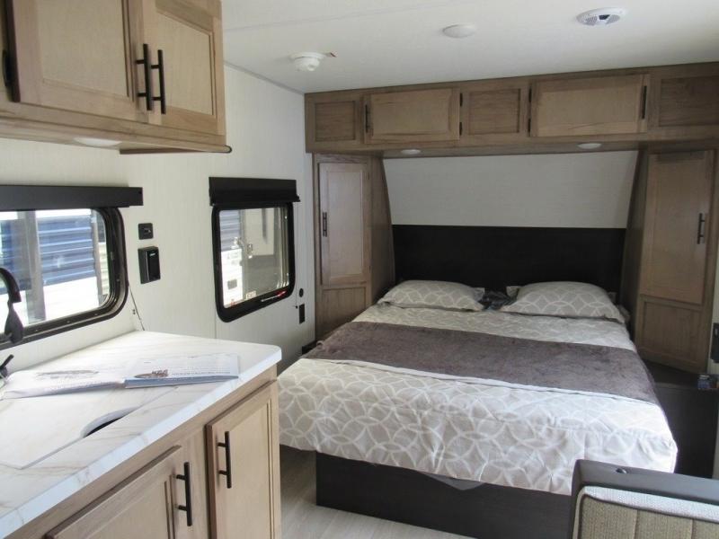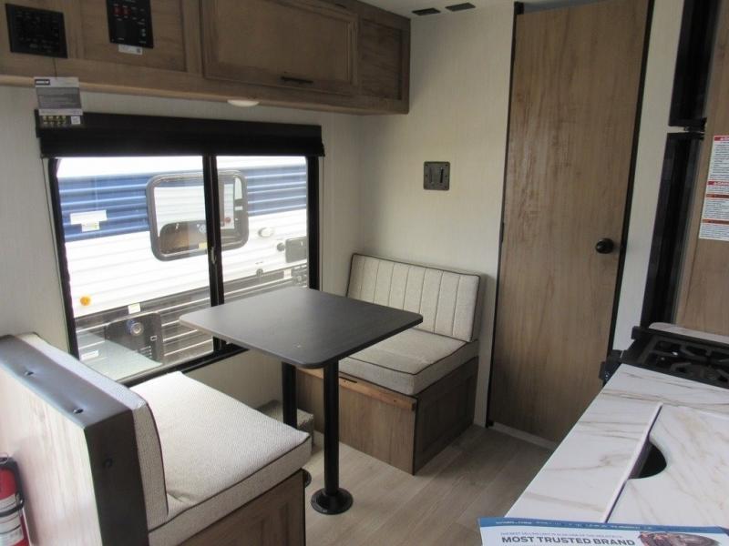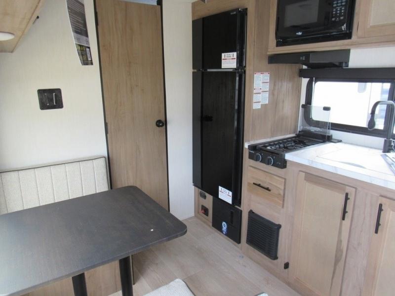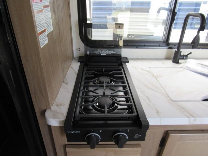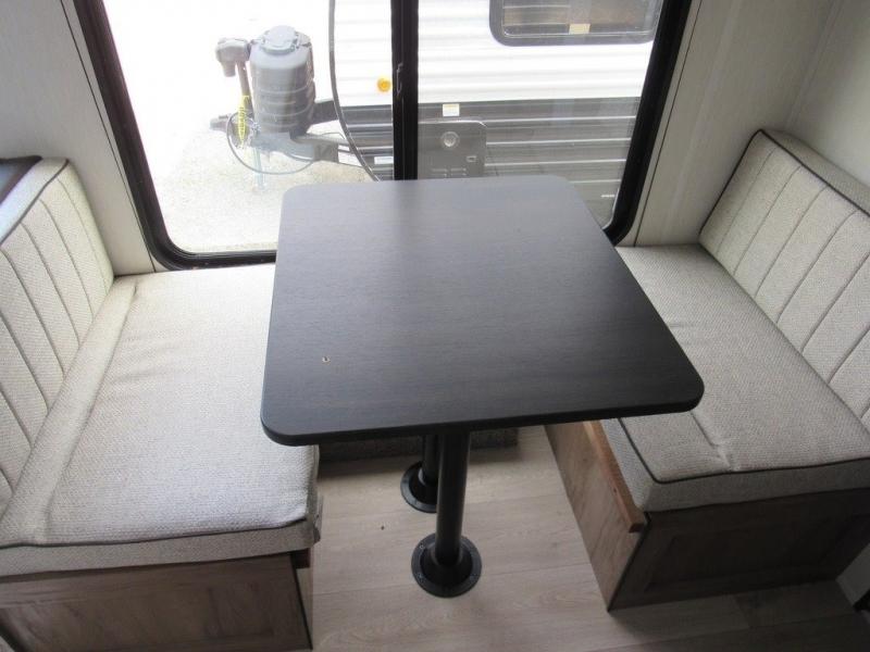 You will love camping in this travel trailer with a front queen bed. Freshen up each morning in the full rear bathroom with the tub/shower, a toilet, and sink. Fill your bellies with the perishables stored in the 12V high efficiency refrigerator and cook them on the high output cooktop then enjoy them at the booth dinette. You could even prepare a meal while breathing in some fresh air at the outside mini kitchen while staying protected by the 12' power awning. Easily store all of your outdoor gear in the outside storage area too!