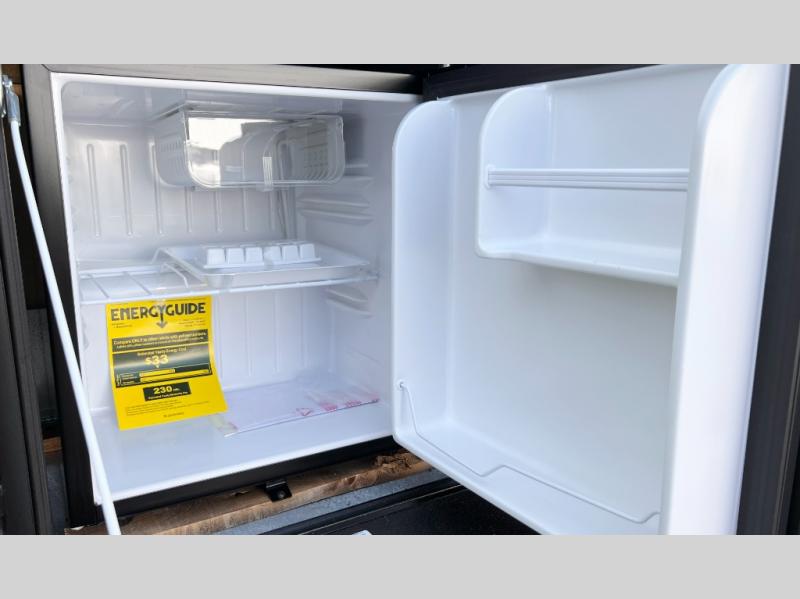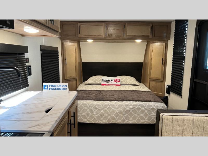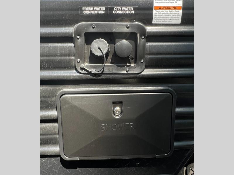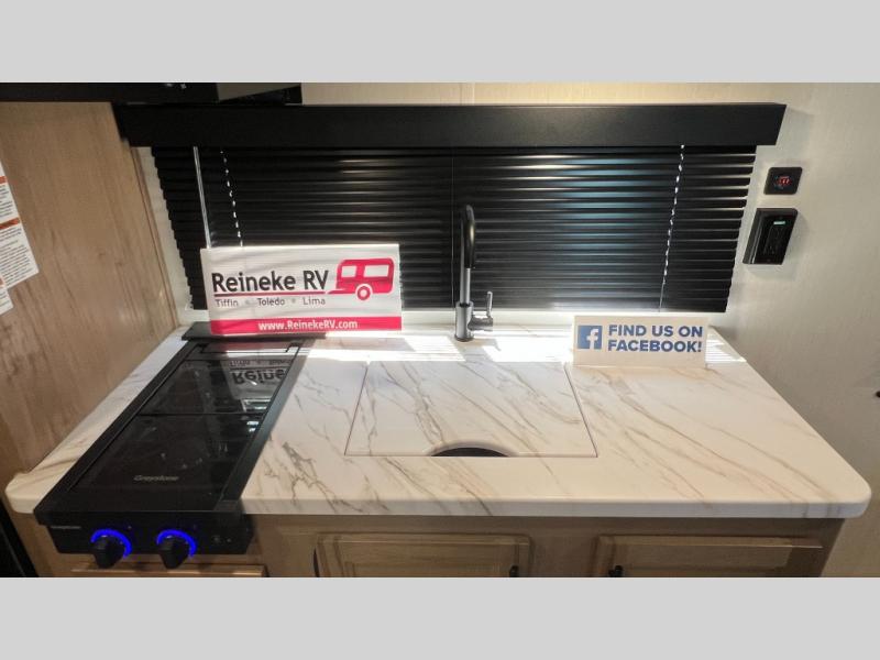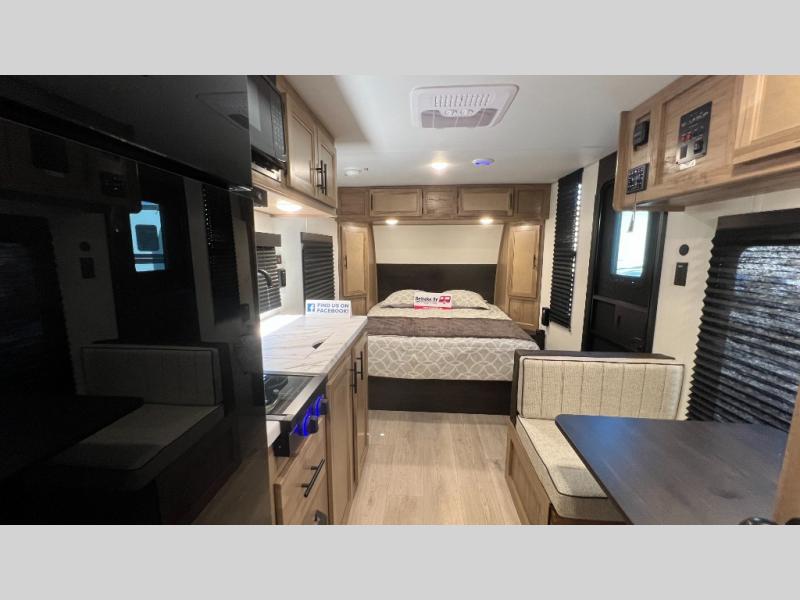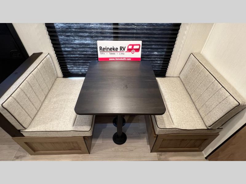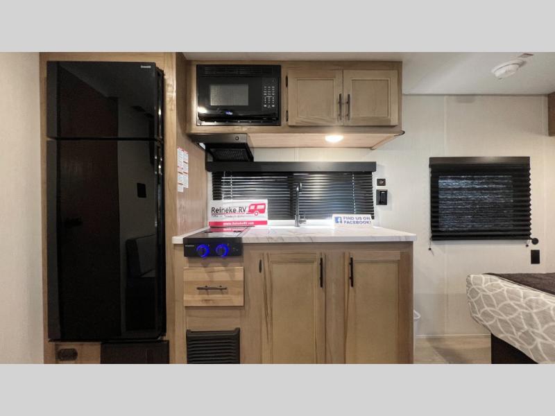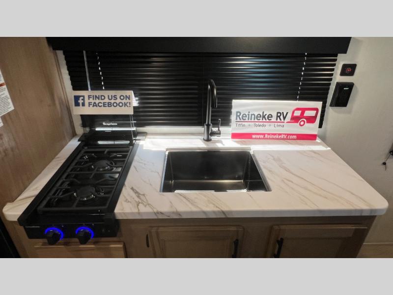 You will love camping in this travel trailer with a front queen bed. Freshen up each morning in the full rear bathroom with the tub/shower, a toilet, and sink. Fill your bellies with the perishables stored in the 12V high efficiency refrigerator and cook them on the high output cooktop then enjoy them at the booth dinette. You could even prepare a meal while breathing in some fresh air at the outside mini kitchen while staying protected by the 12' power awning. Easily store all of your outdoor gear in the outside storage area too!