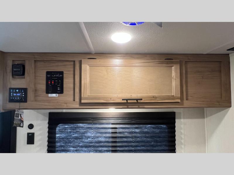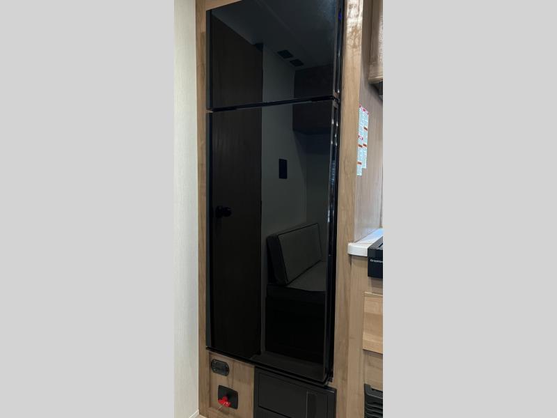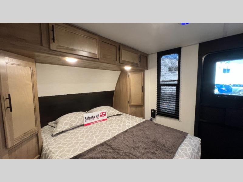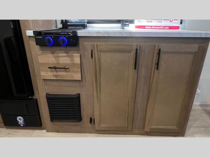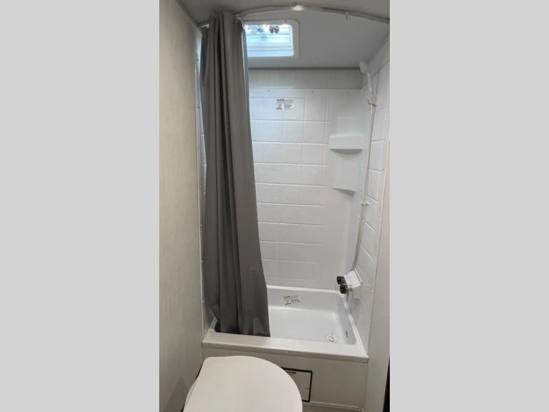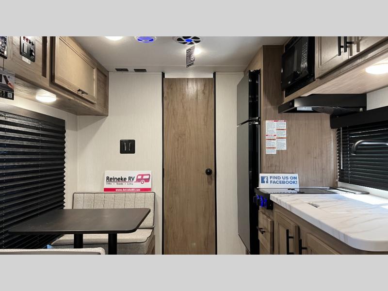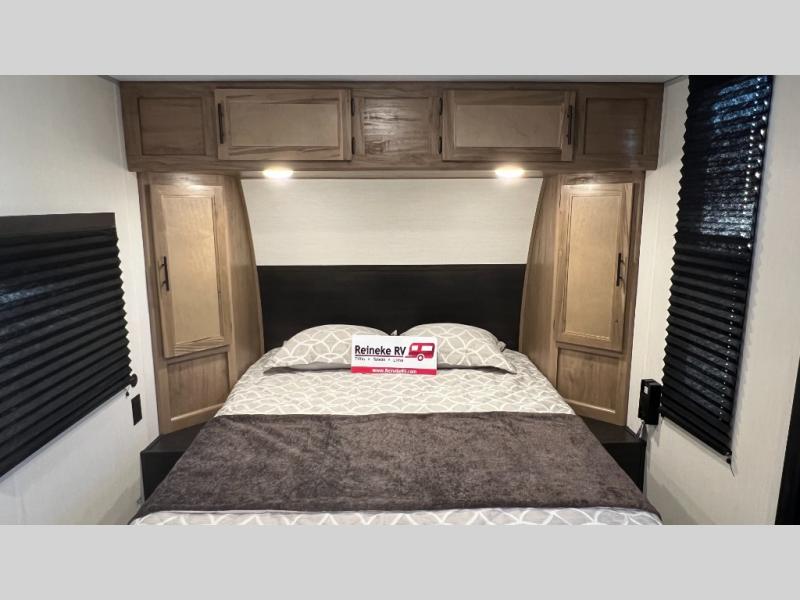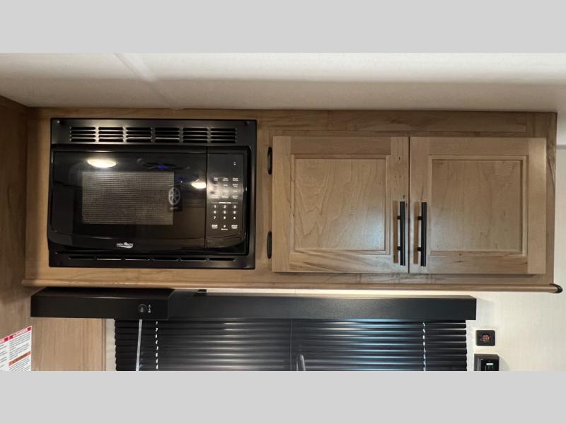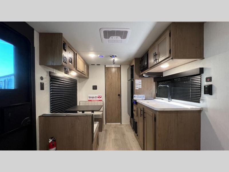 You will love camping in this travel trailer with a front queen bed. Freshen up each morning in the full rear bathroom with the tub/shower, a toilet, and sink. Fill your bellies with the perishables stored in the 12V high efficiency refrigerator and cook them on the high output cooktop then enjoy them at the booth dinette. You could even prepare a meal while breathing in some fresh air at the outside mini kitchen while staying protected by the 12' power awning. Easily store all of your outdoor gear in the outside storage area too!