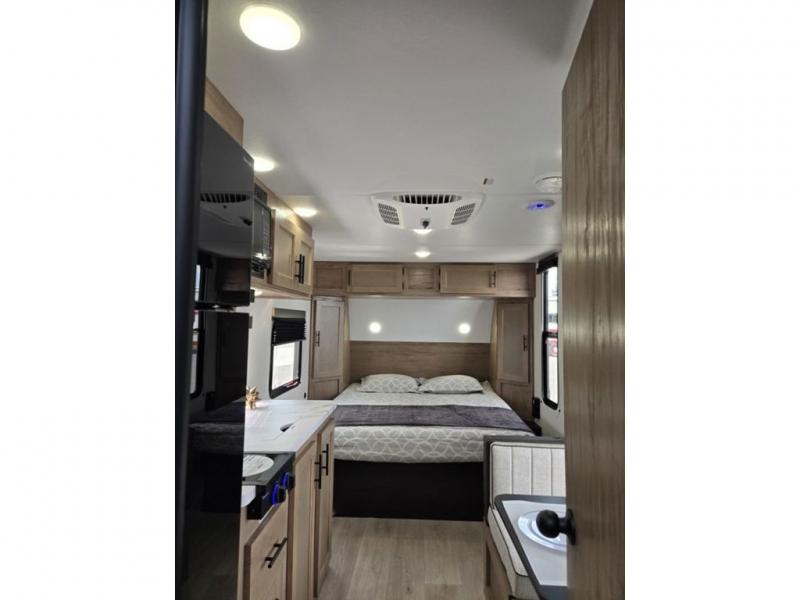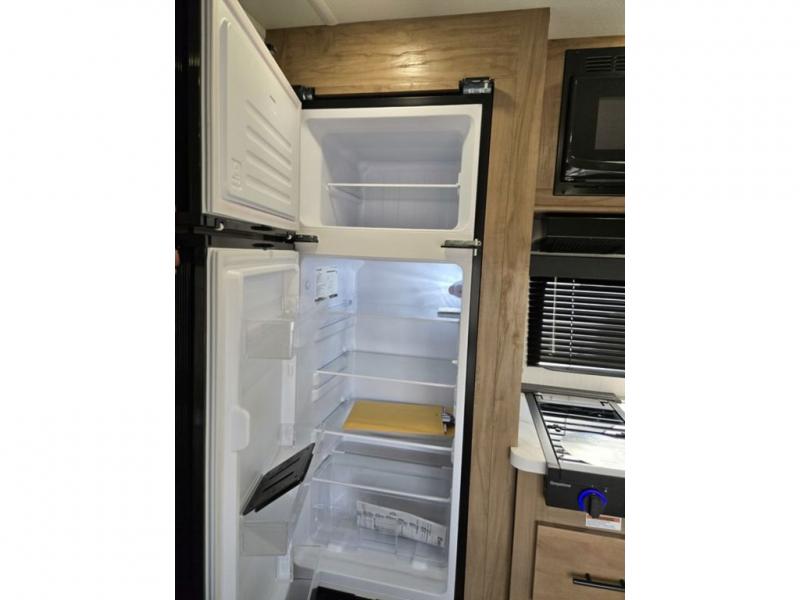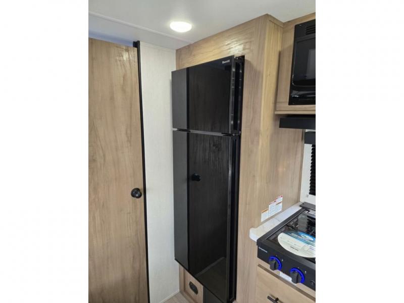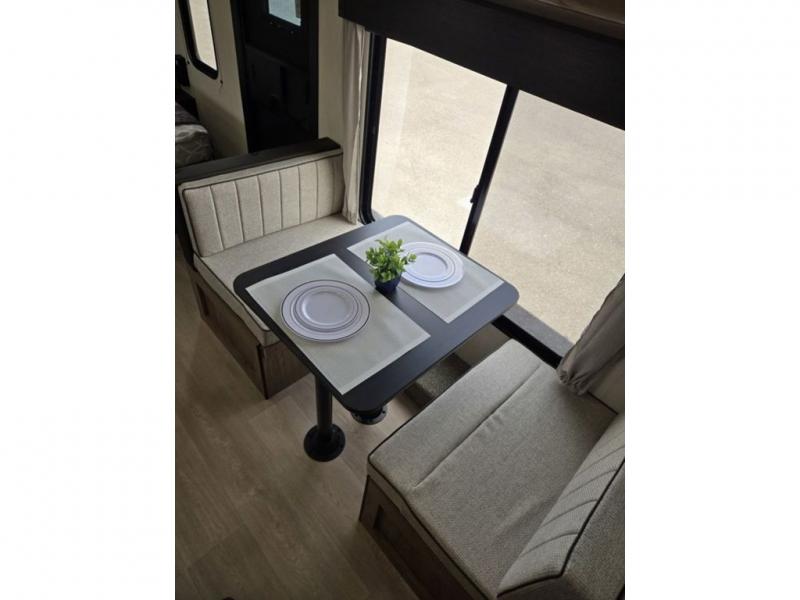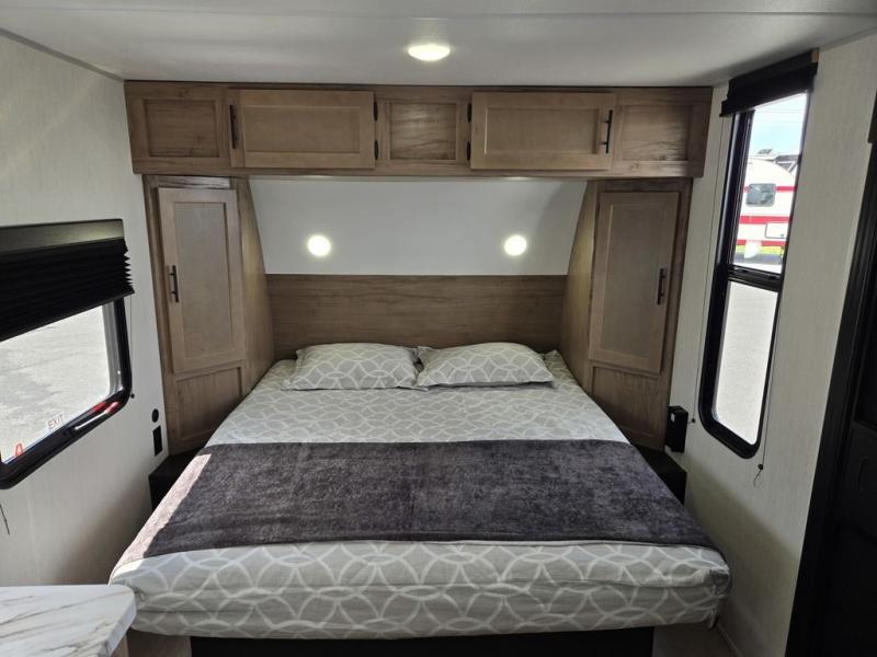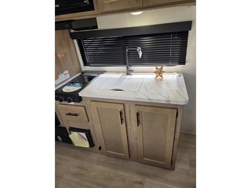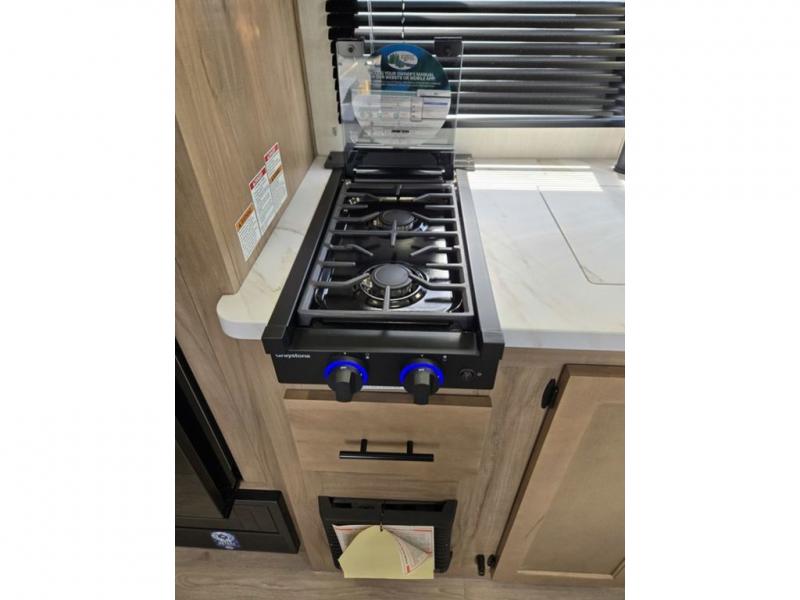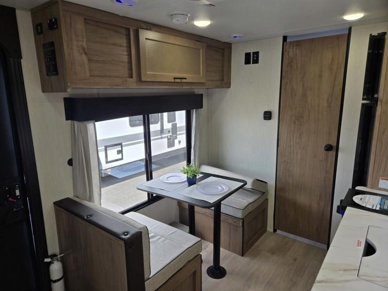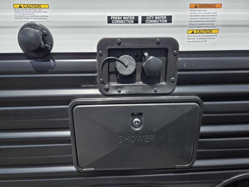You will love camping in this travel trailer with a front queen bed. Freshen up each morning in the full rear bathroom with the tub/shower, a toilet, and sink. Fill your bellies with the perishables stored in the 12V high efficiency refrigerator and cook them on the high output cooktop then enjoy them at the booth dinette. You could even prepare a meal while breathing in some fresh air at the outside mini kitchen while staying protected by the 12' power awning. Easily store all of your outdoor gear in the outside storage area too!