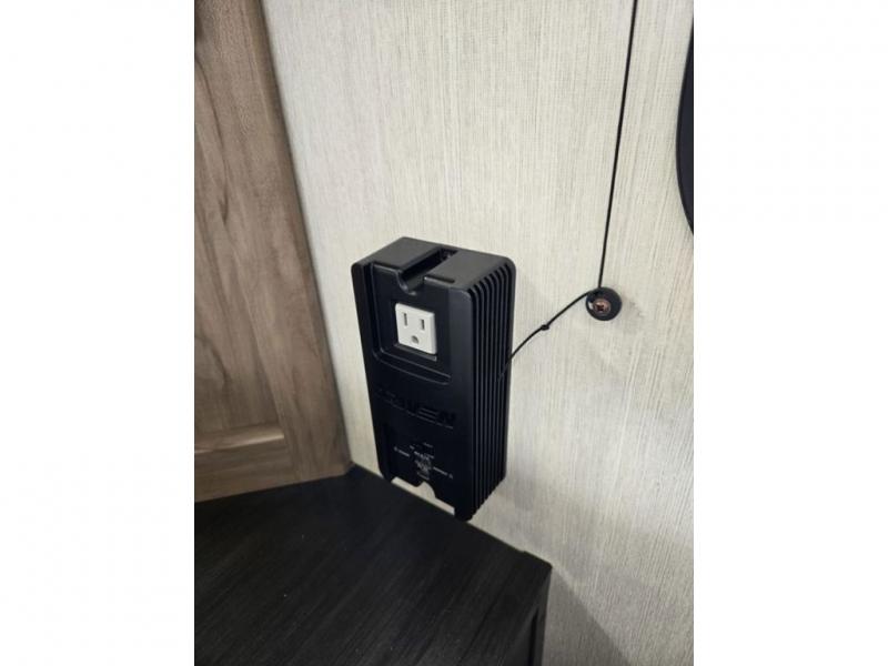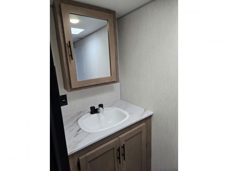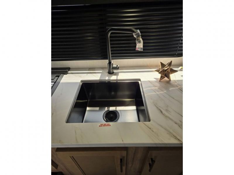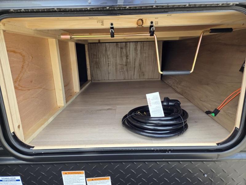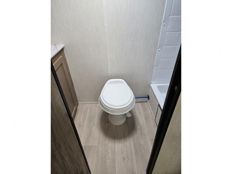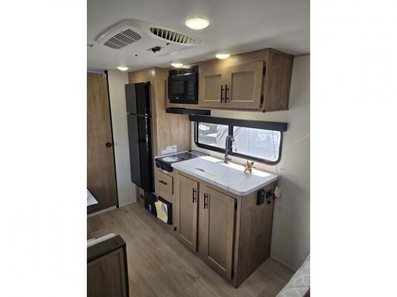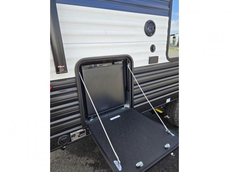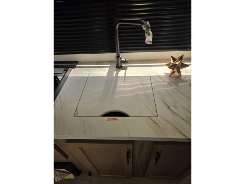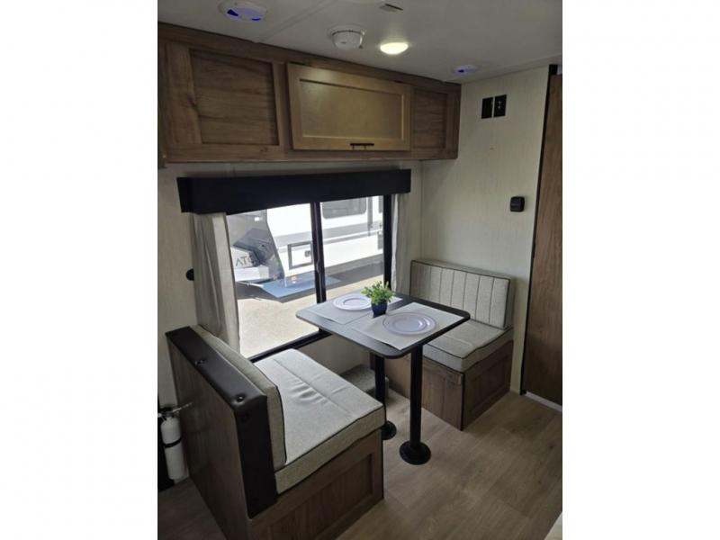 You will love camping in this travel trailer with a front queen bed. Freshen up each morning in the full rear bathroom with the tub/shower, a toilet, and sink. Fill your bellies with the perishables stored in the 12V high efficiency refrigerator and cook them on the high output cooktop then enjoy them at the booth dinette. You could even prepare a meal while breathing in some fresh air at the outside mini kitchen while staying protected by the 12' power awning. Easily store all of your outdoor gear in the outside storage area too!