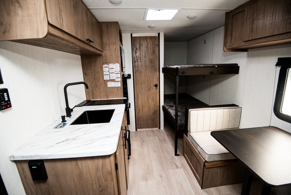 The whole family can sleep comfortably in this travel trailer! It has a set of bunk beds for the kids to sleep on, and you can sleep comfortably on the front queen bed with overhead cabinets and a shelf. The chef will enjoy preparing their best home cooked meals with the high output cooktop, and you can dine at the booth dinette. And the private bath onboard means you won't have to leave your camper in the middle of the night!