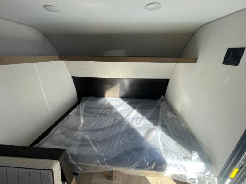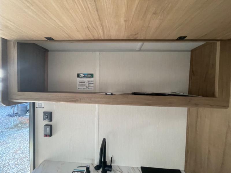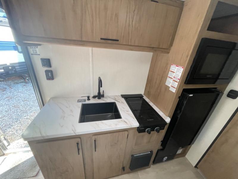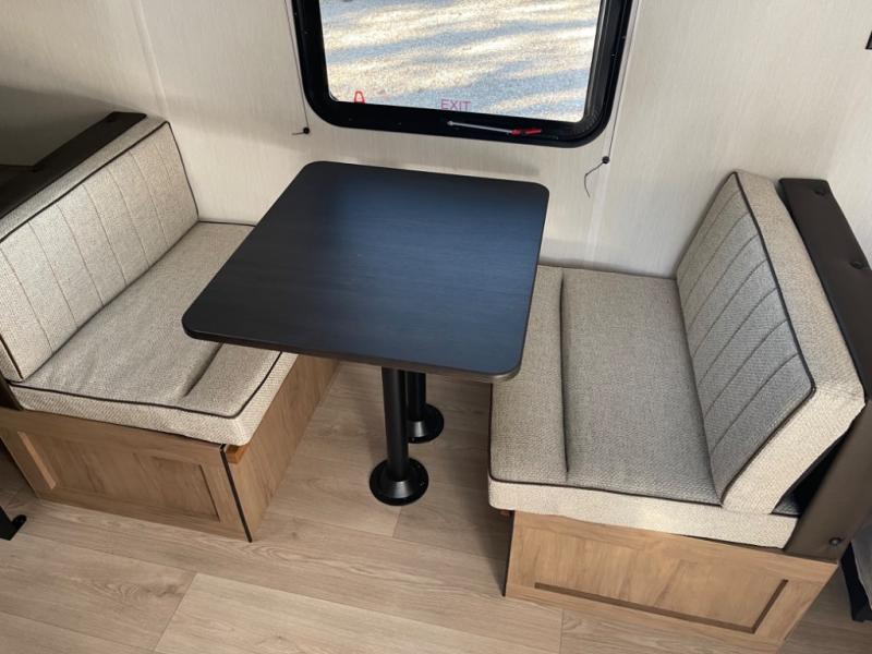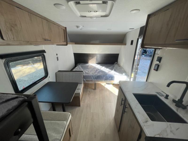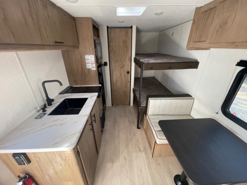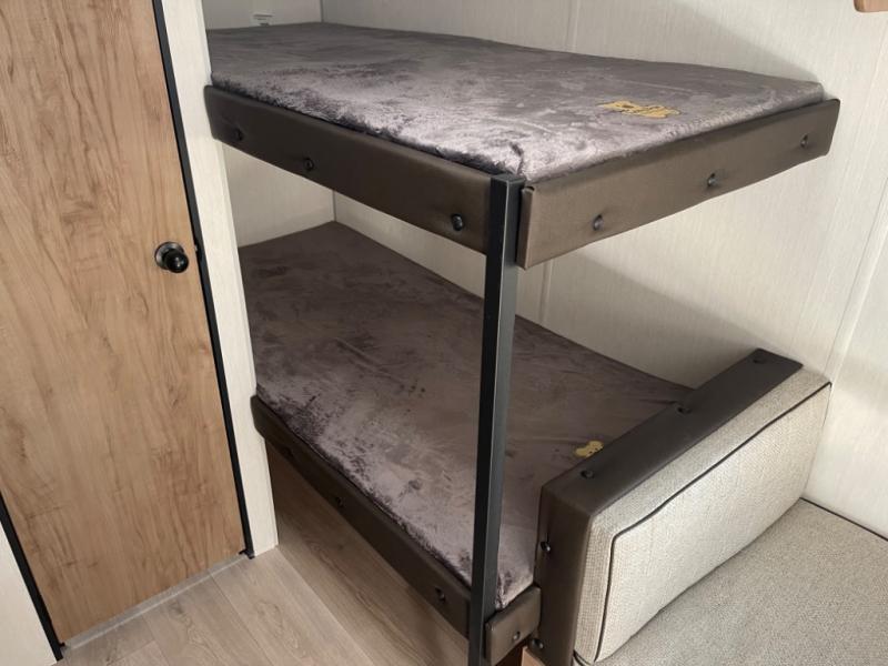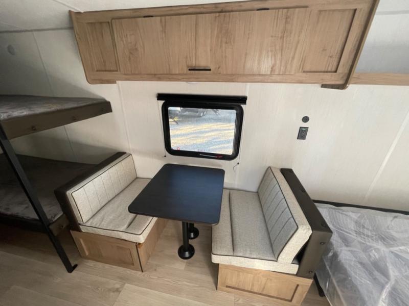 The whole family can sleep comfortably in this travel trailer! It has a set of bunk beds for the kids to sleep on, and you can sleep comfortably on the front queen bed with overhead cabinets and a shelf. The chef will enjoy preparing their best home cooked meals with the high output cooktop, and you can dine at the booth dinette. And the private bath onboard means you won't have to leave your camper in the middle of the night!