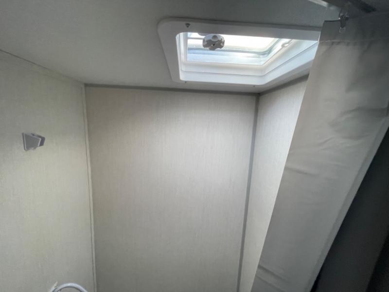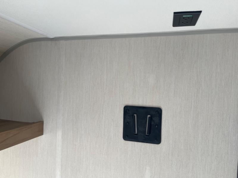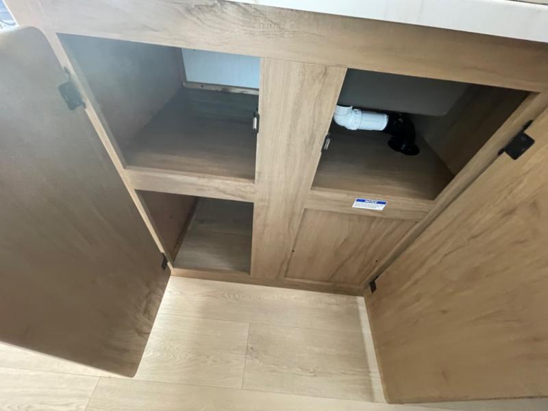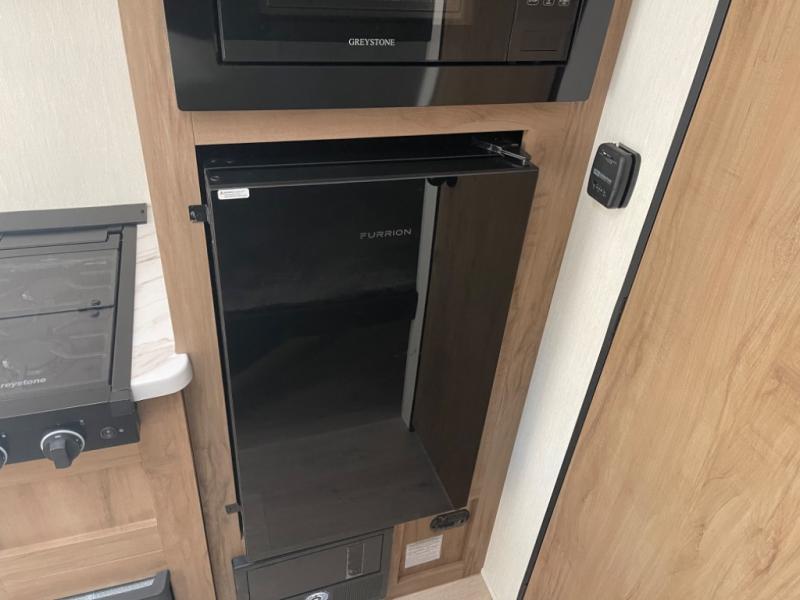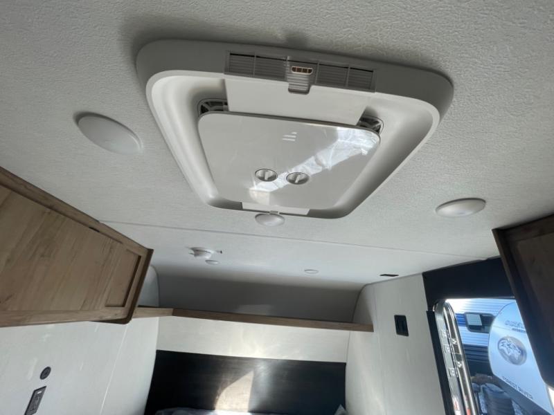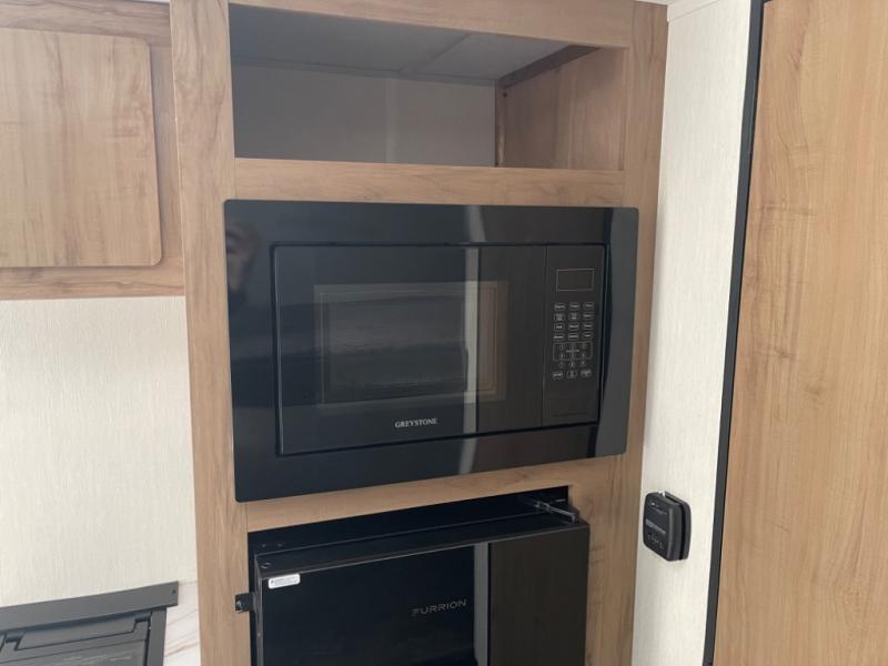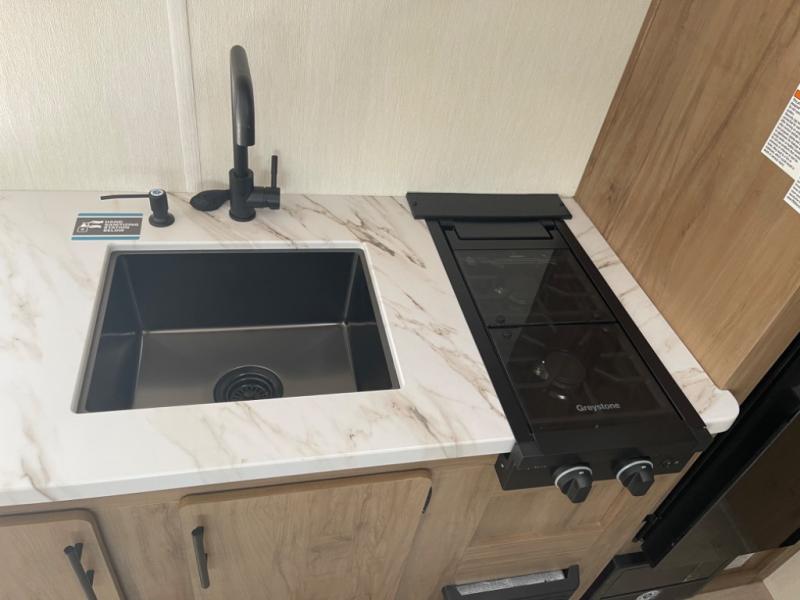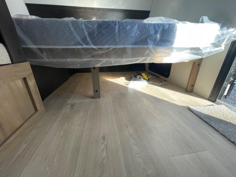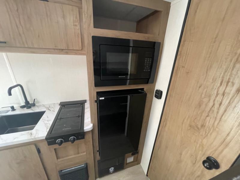 The whole family can sleep comfortably in this travel trailer! It has a set of bunk beds for the kids to sleep on, and you can sleep comfortably on the front queen bed with overhead cabinets and a shelf. The chef will enjoy preparing their best home cooked meals with the high output cooktop, and you can dine at the booth dinette. And the private bath onboard means you won't have to leave your camper in the middle of the night!