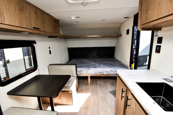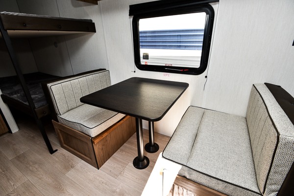 The whole family can sleep comfortably in this travel trailer! It has a set of bunk beds for the kids to sleep on, and you can sleep comfortably on the front queen bed with overhead cabinets and a shelf. The chef will enjoy preparing their best home cooked meals with the high output cooktop, and you can dine at the booth dinette. And the private bath onboard means you won't have to leave your camper in the middle of the night!