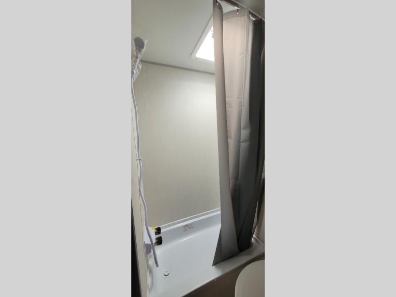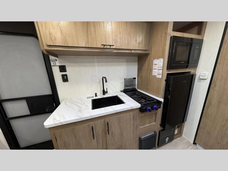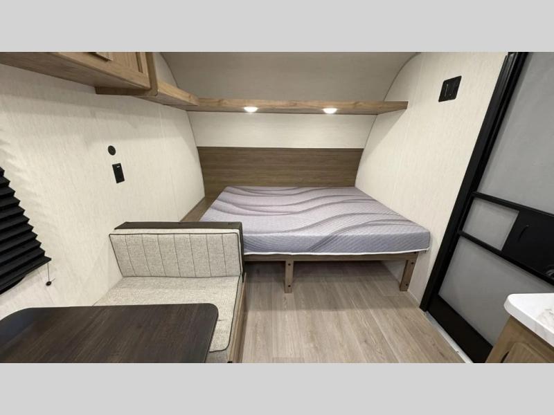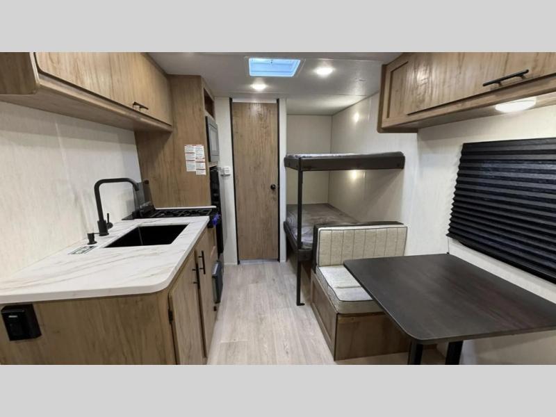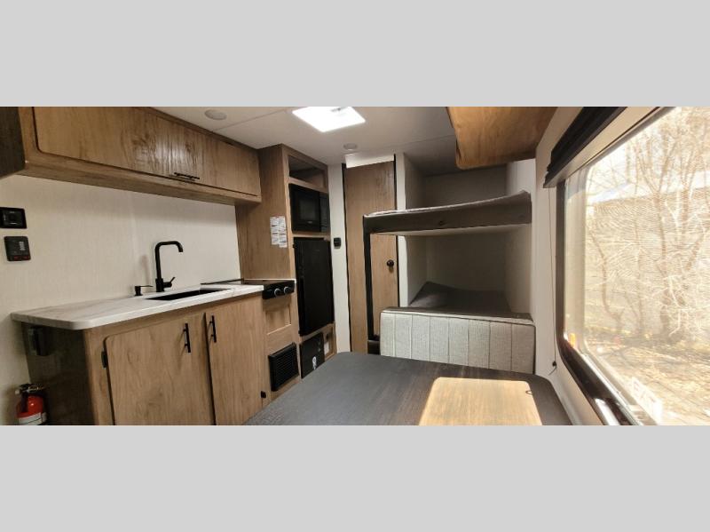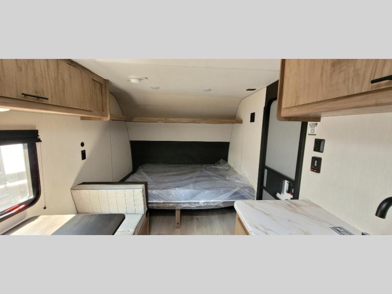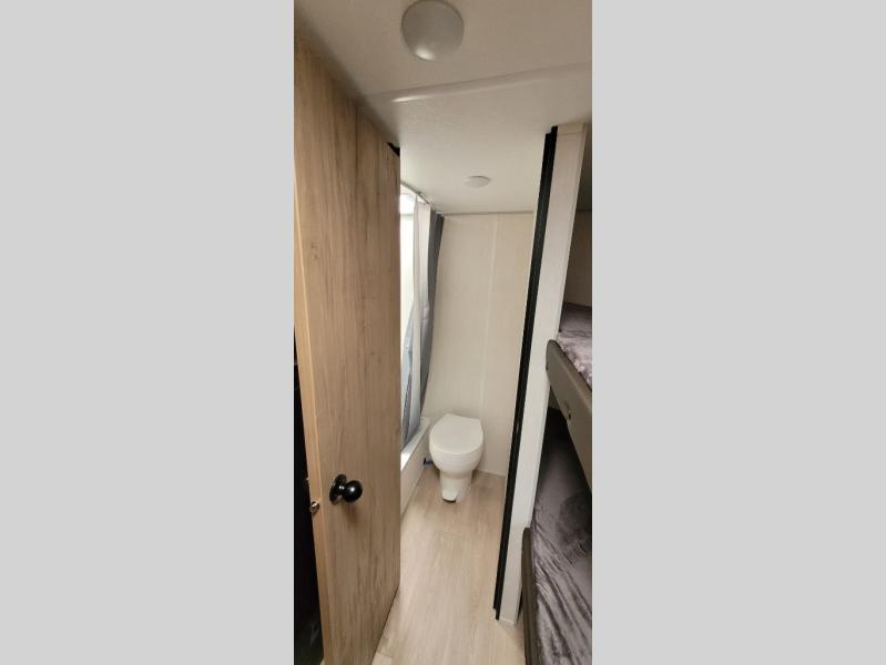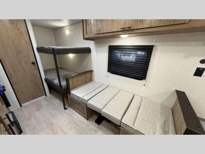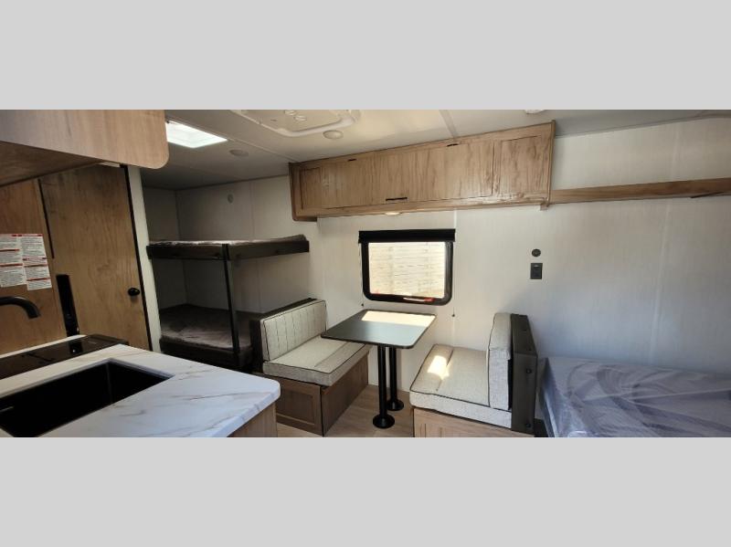 The whole family can sleep comfortably in this travel trailer! It has a set of bunk beds for the kids to sleep on, and you can sleep comfortably on the front queen bed with overhead cabinets and a shelf. The chef will enjoy preparing their best home cooked meals with the high output cooktop, and you can dine at the booth dinette. And the private bath onboard means you won't have to leave your camper in the middle of the night!